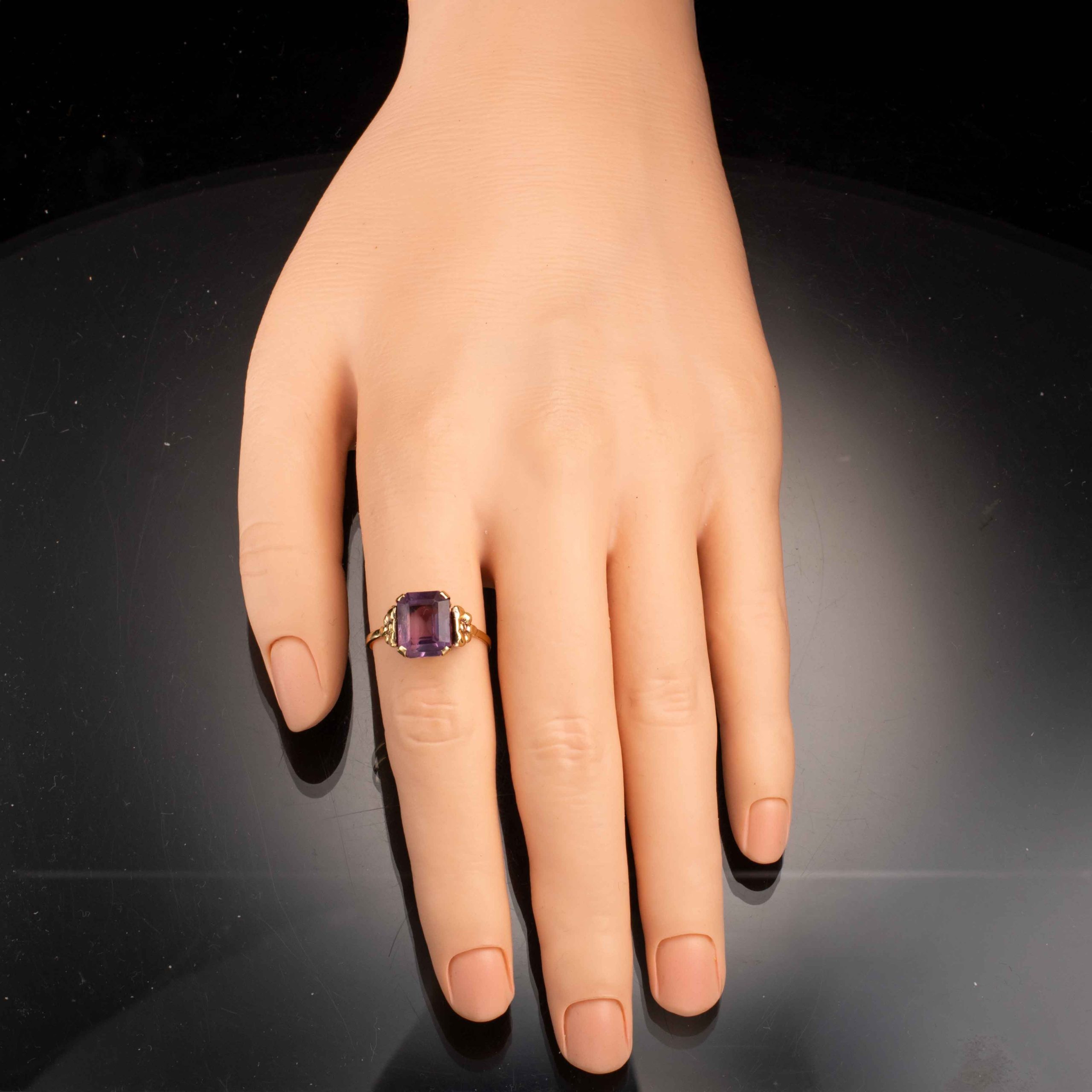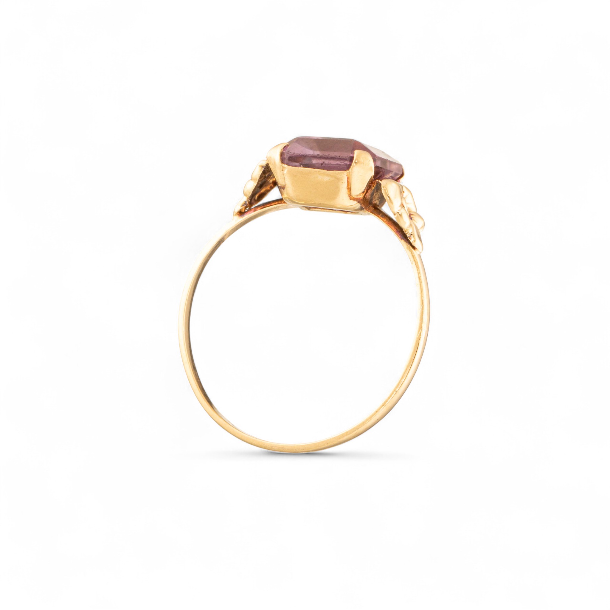 Ring i 14 karat gult gull med blomsterskuldre. Fattet med smaragdslipt ametyst. Ansvarsmerket for Lars Harsheim. Oslo. 1900-tallets første halvdel.