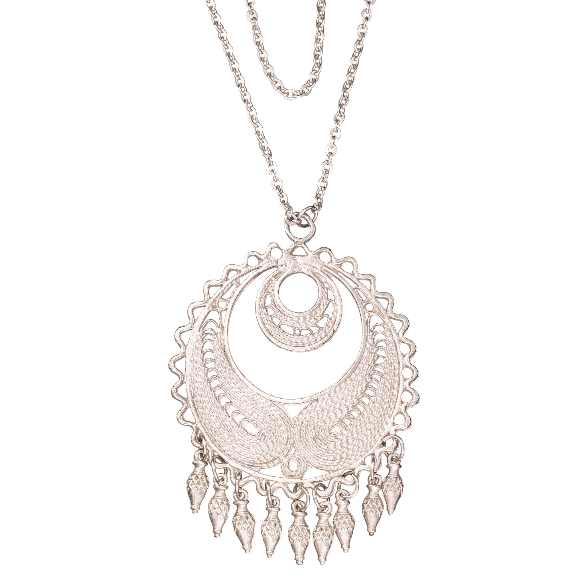 Bijouteri: Stort anheng med kjede. Gjennombrutt dekor med heng. Uedelt, hvitt metall. Trolig Sør-Amerika. Sent 1900- til tidl. 2000-tallet.