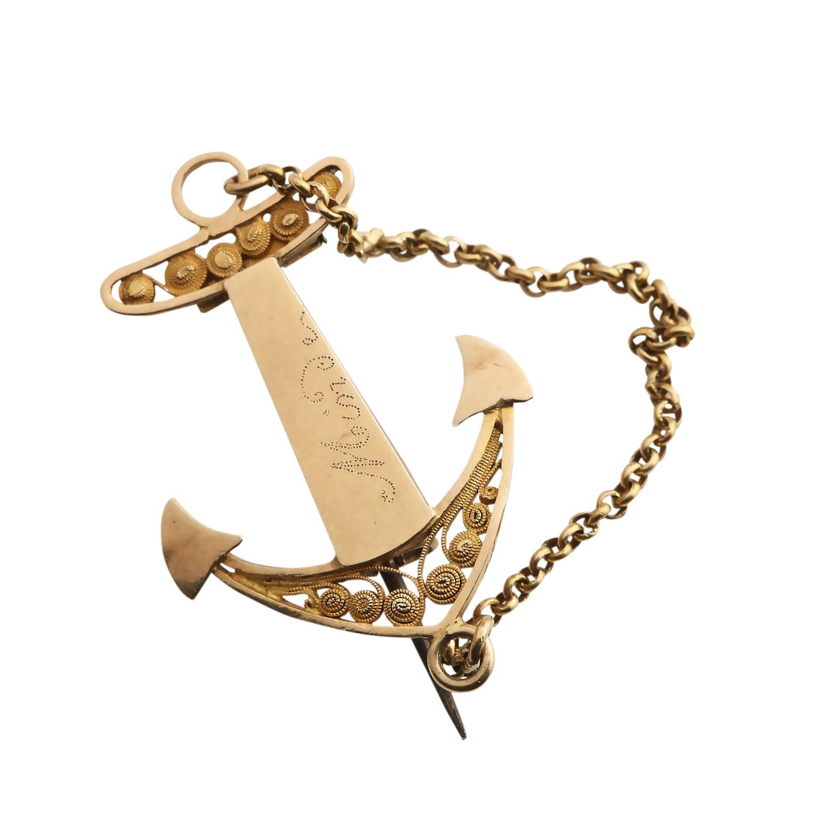 Anker anheng / brosje i gult gull. Inngravert «Minde» foran. Slutten av 1800-tallet.