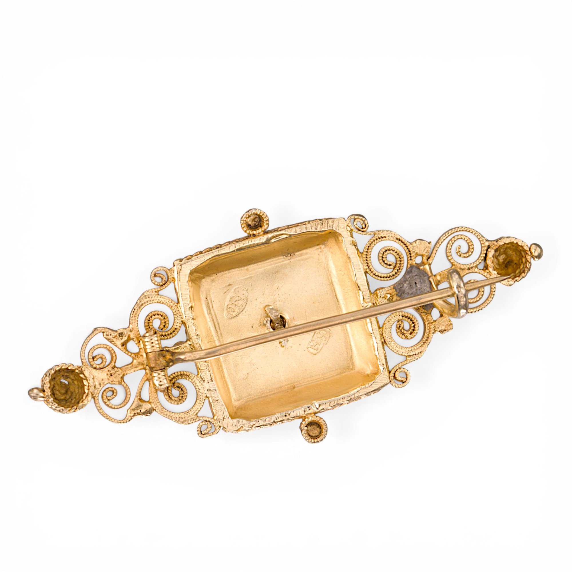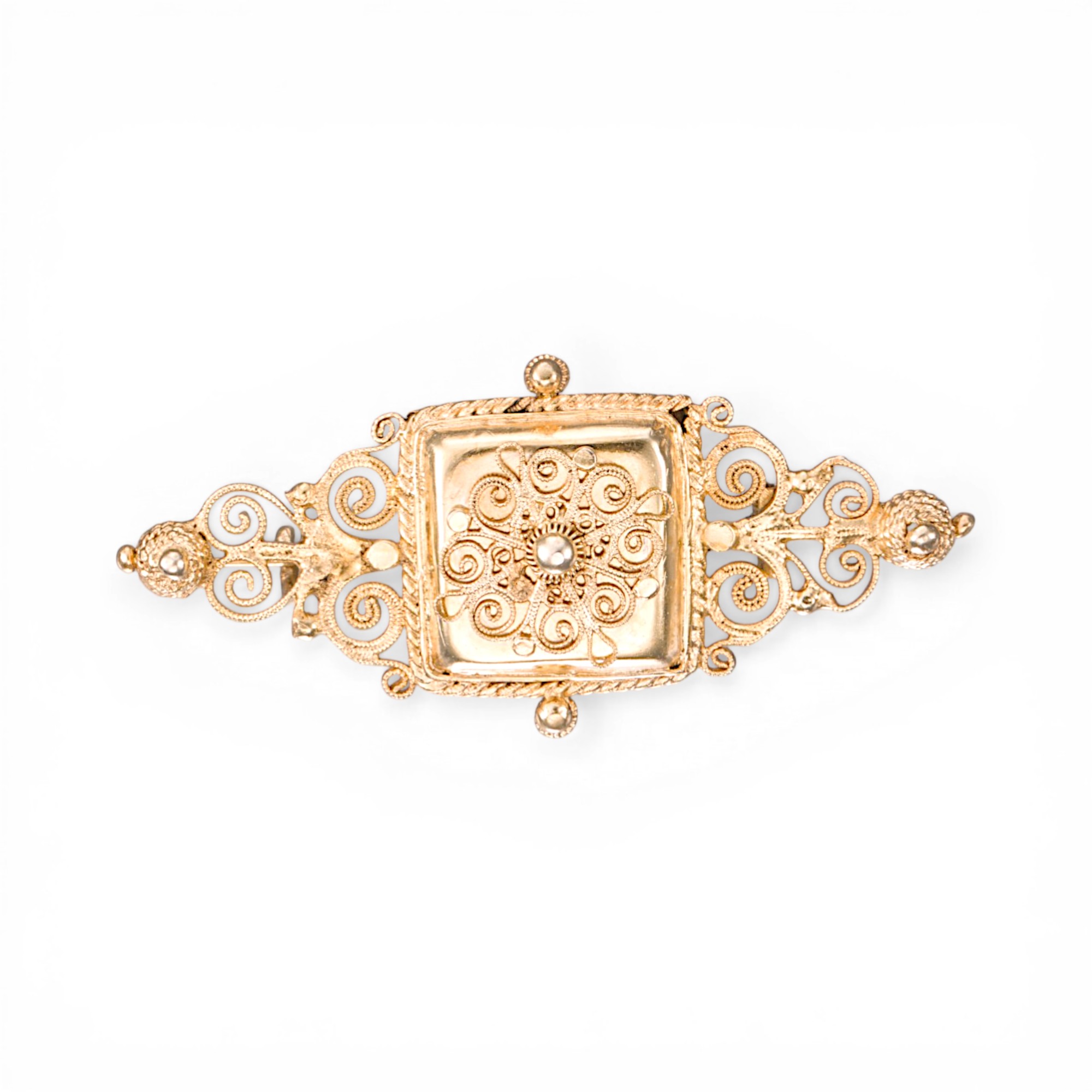Halsnål med filigransarbeide. Forgylt sølv. Ansvarsmerket «GH» for Gustav Hellstrøm. Stavanger. Sent 1800- til tidl. 1900-tallet.