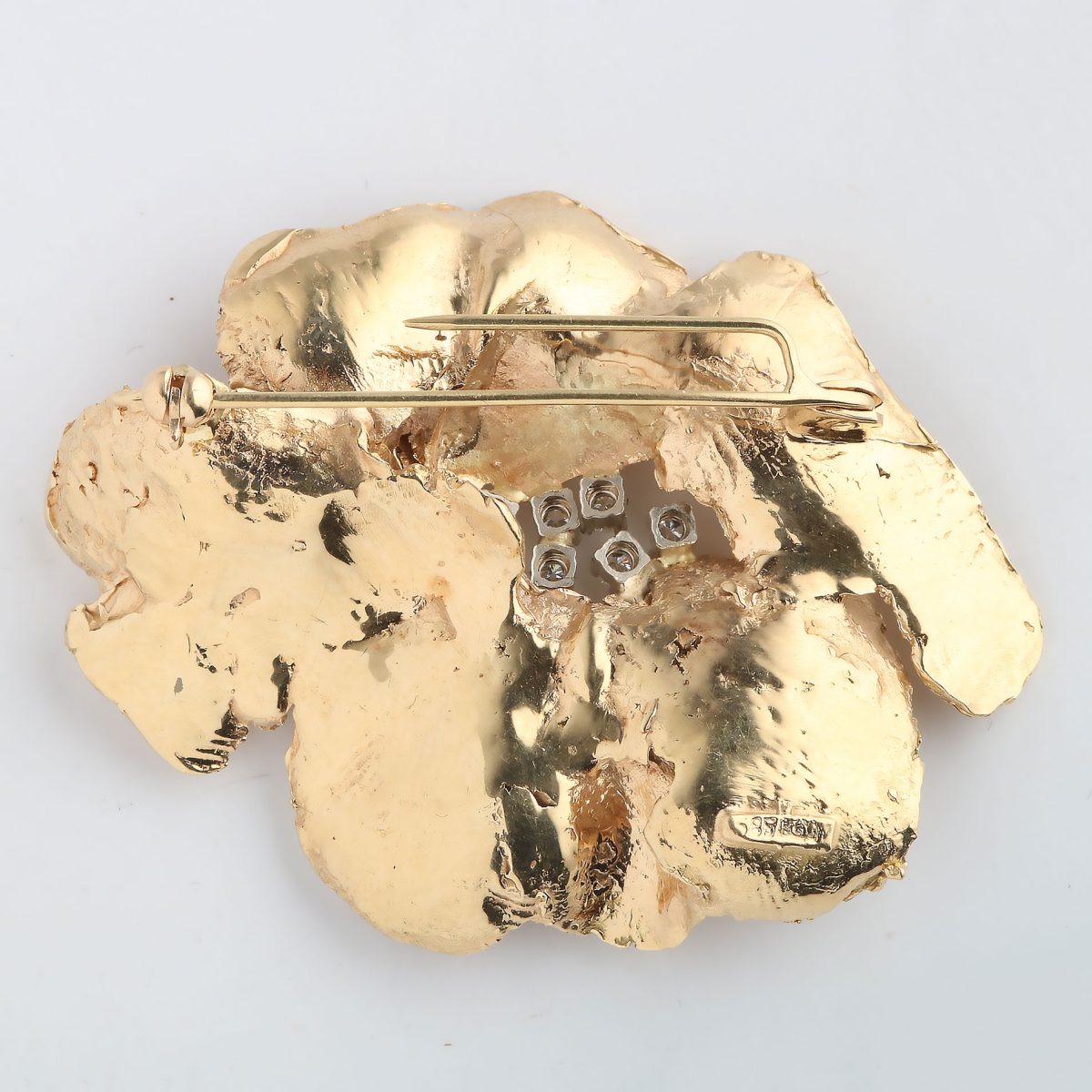 Stor bladbrosje i gult gull med 9 brillianter (tot. ca. 0,3 ct). Utydelig mesterstemplet HG(?) (Muligens Hans G. Hagenberg eller Håkon Gams-Haugsøen). 1900-tallets andre halvdel.