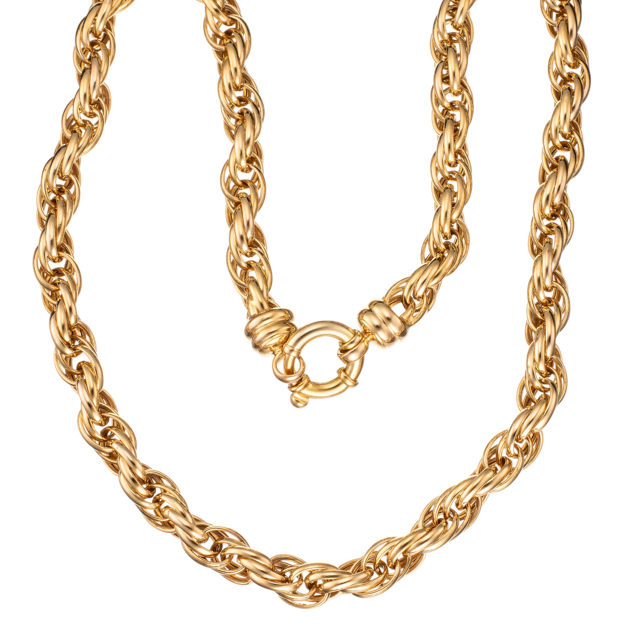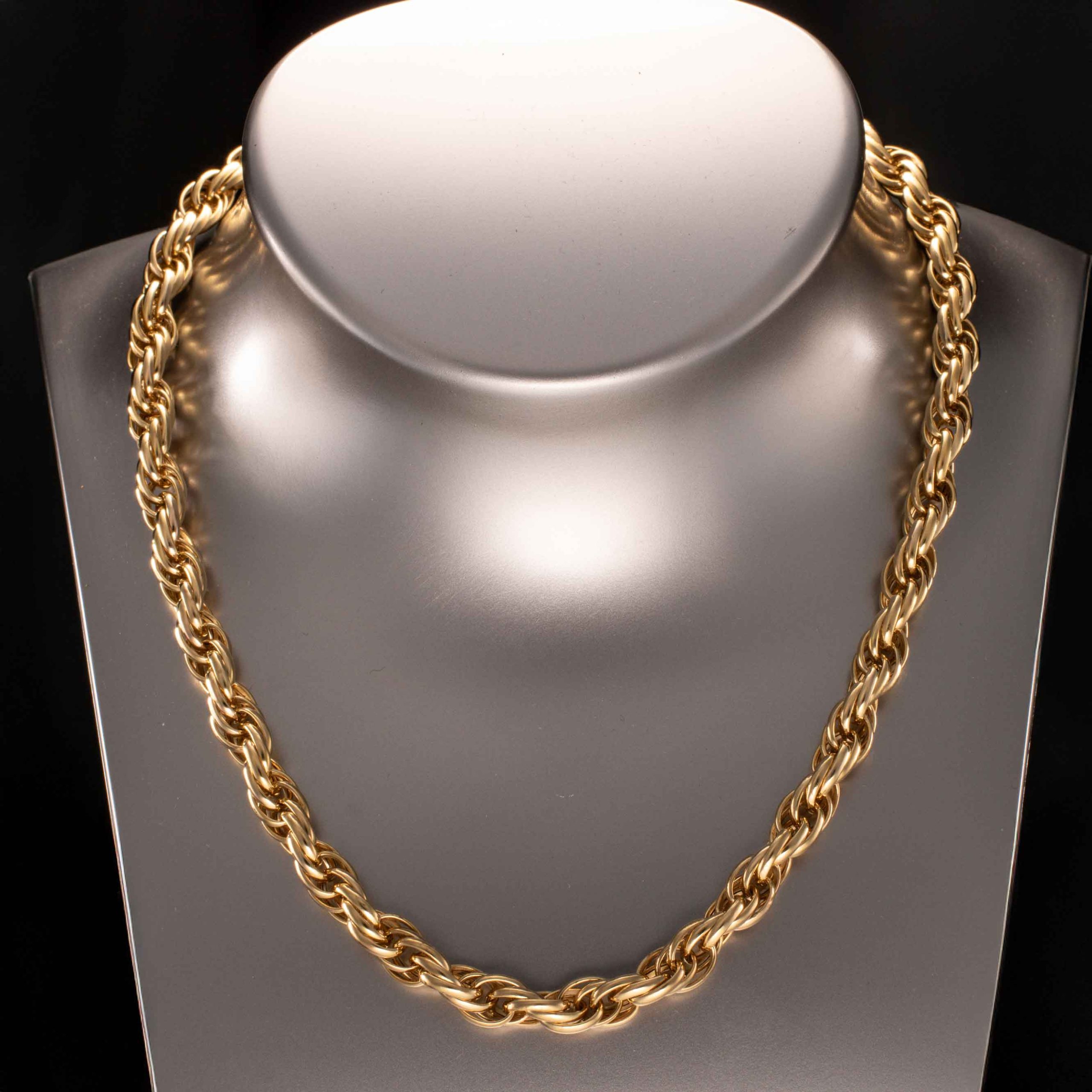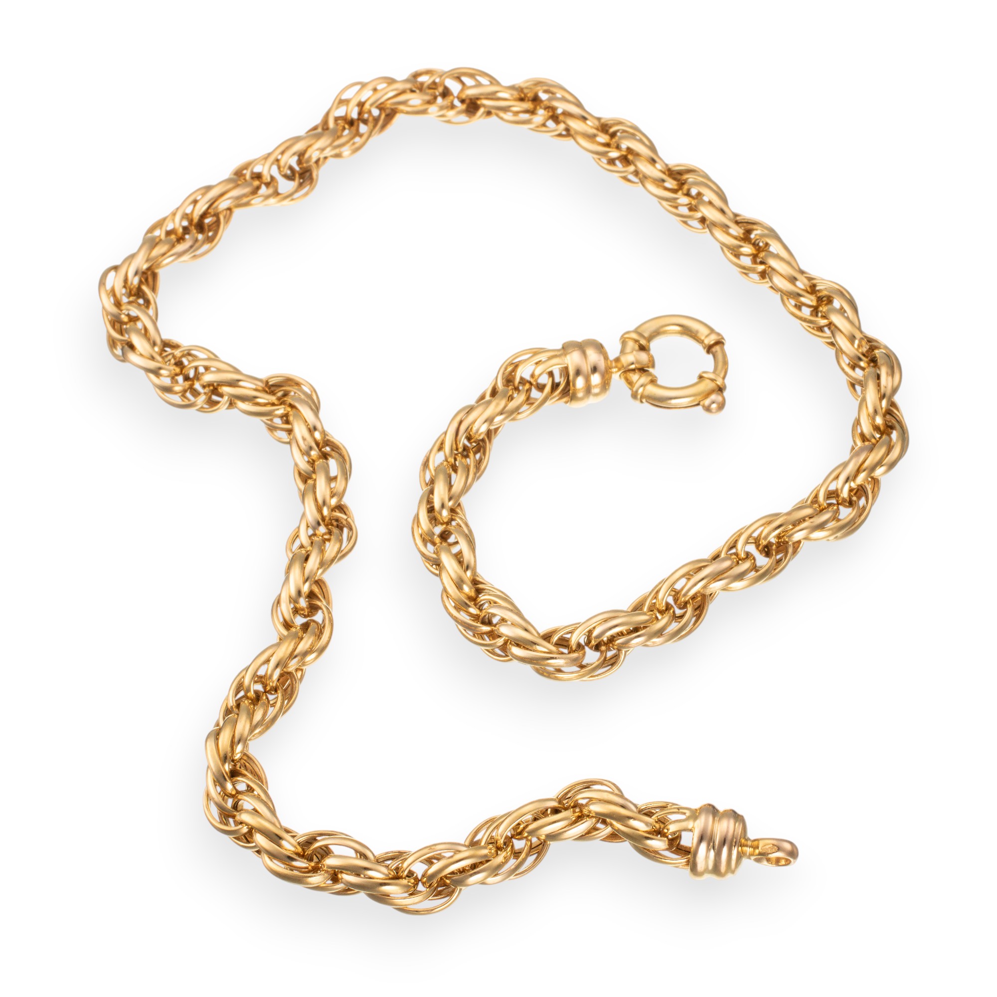 Cordel halskjede i 14 karat gult gull. Hul utførelse. Stor fjærringlås. Ansvarsmerket «EC» for E. Christophersen. Sandnes. Sent 1900- til tidl. 2000-tallet.