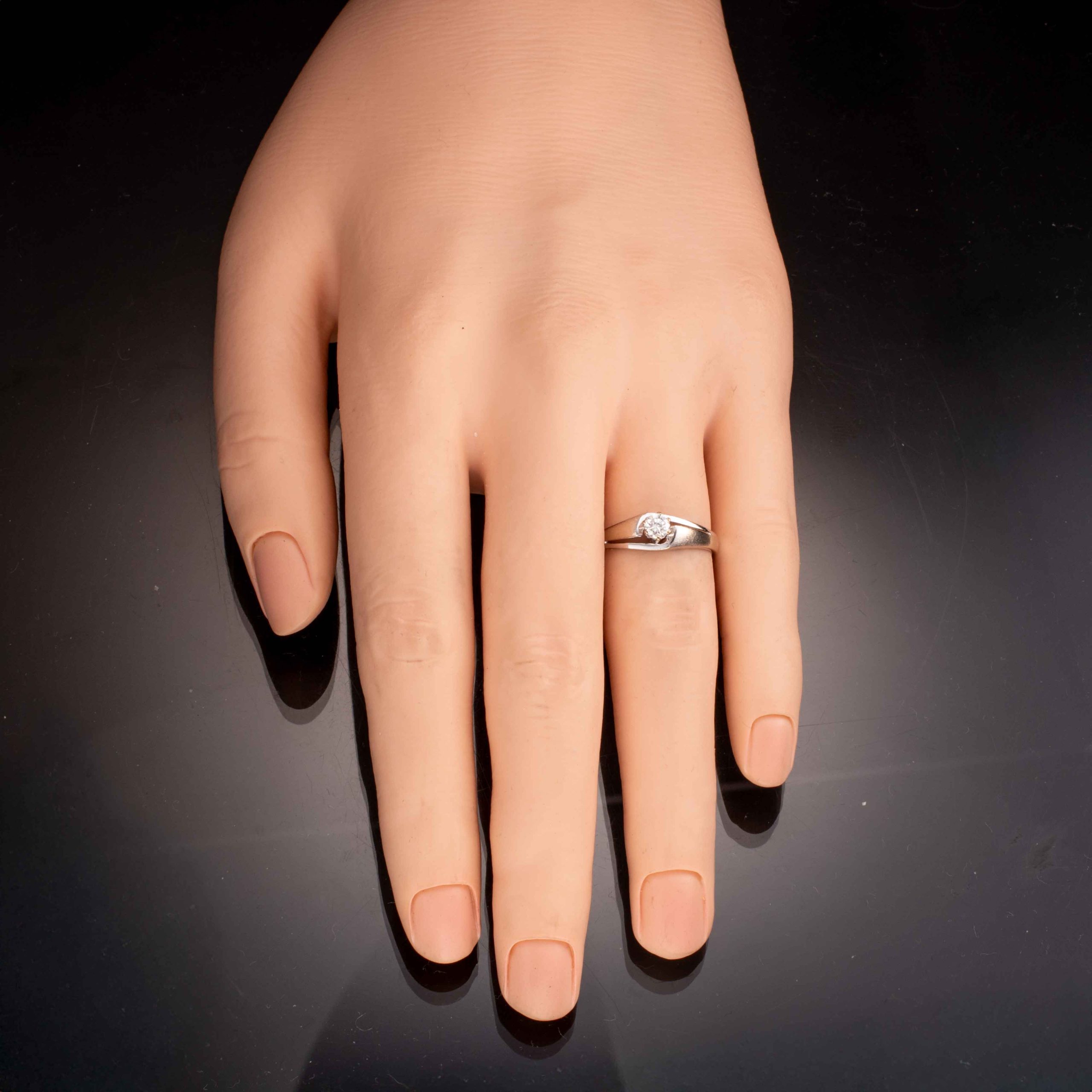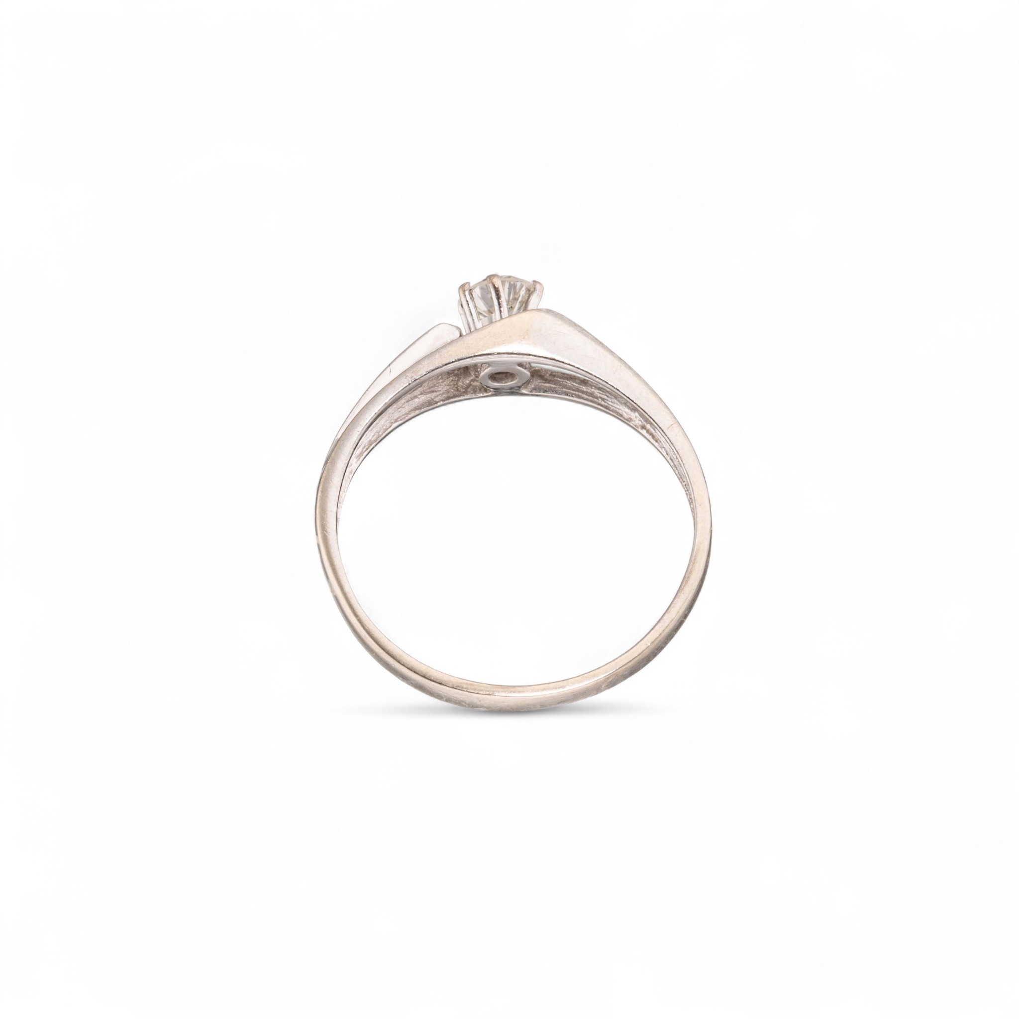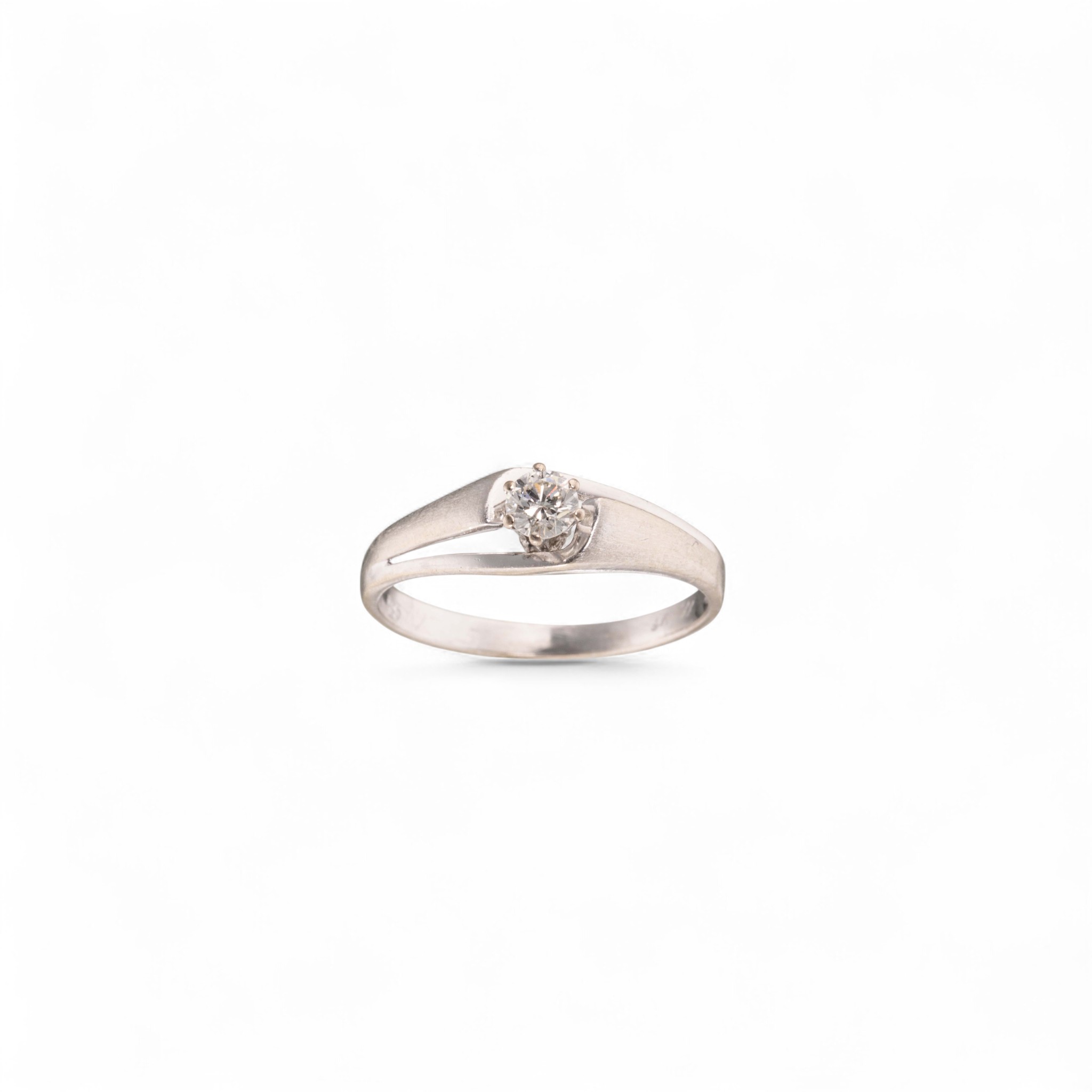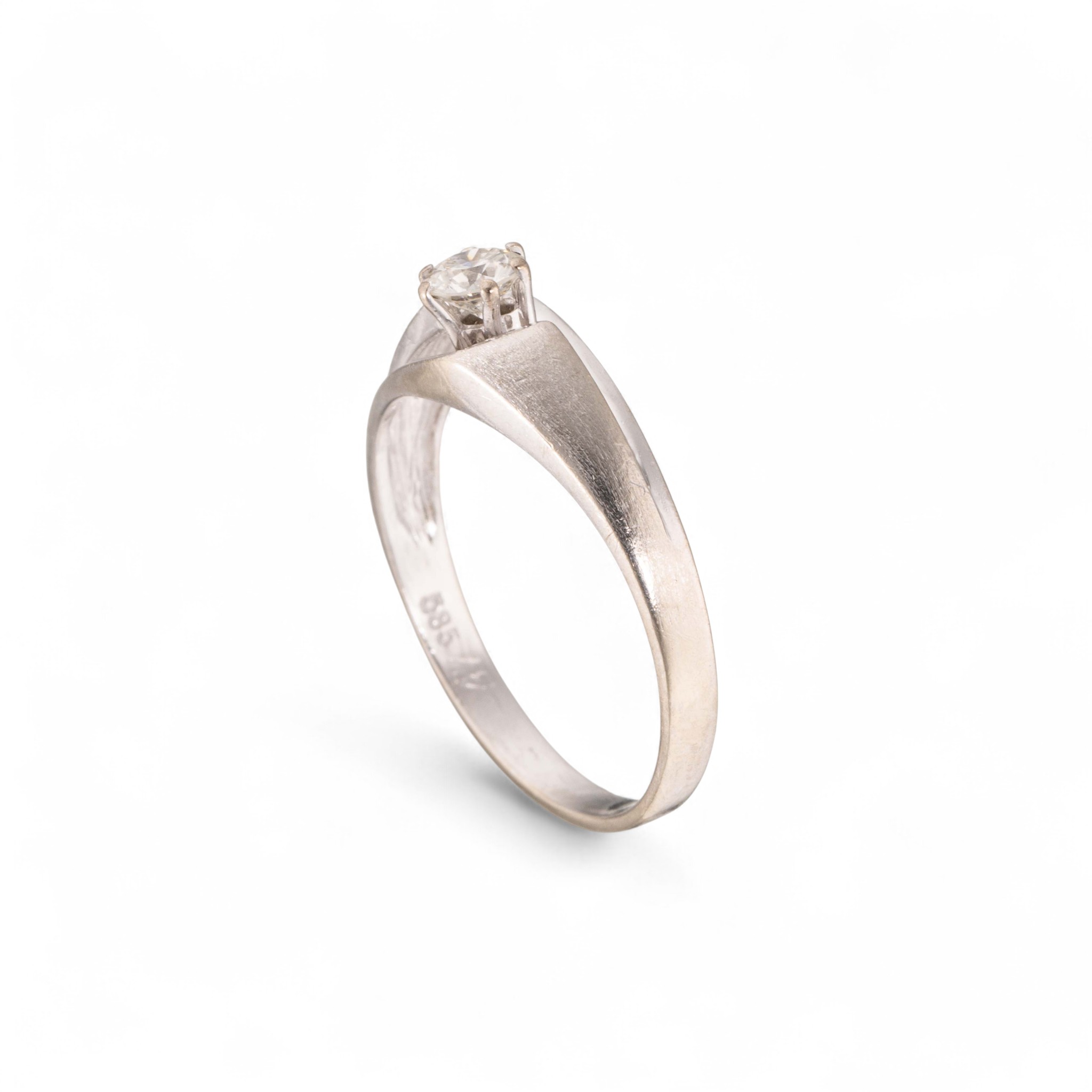 Ring i 14 karat hvitt gull. Fattet med naturlig diamant (ca. 0,19 ct.). Børstede skuldre. Uidentifisert ansvarsmerke «yf». Sent 1900- til tidl. 2000-tallet.