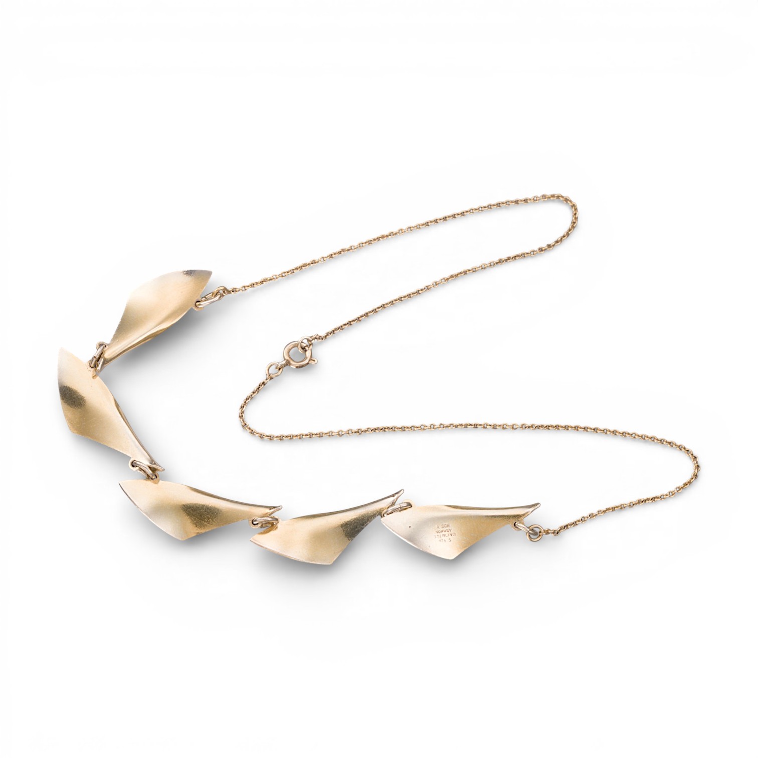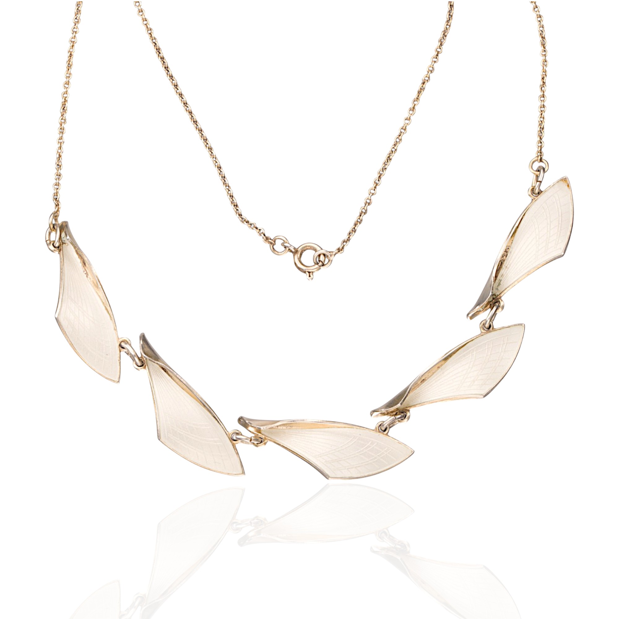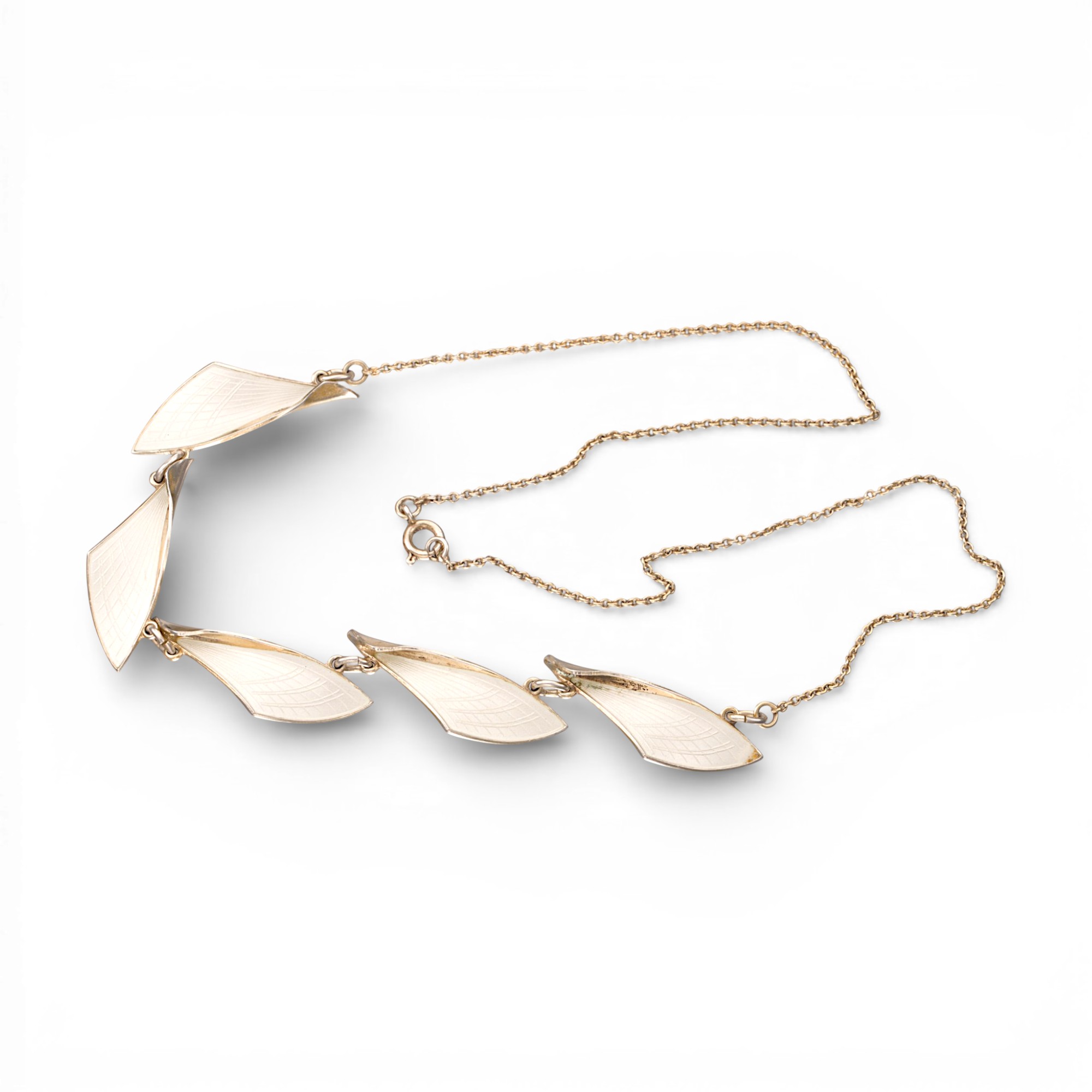 Halskjede i sterling sølv med fem ledd i hvit emalje. Ansvarsmerket A.Sch for Albert Scharning. Oslo. 1900-tallets første halvdel.