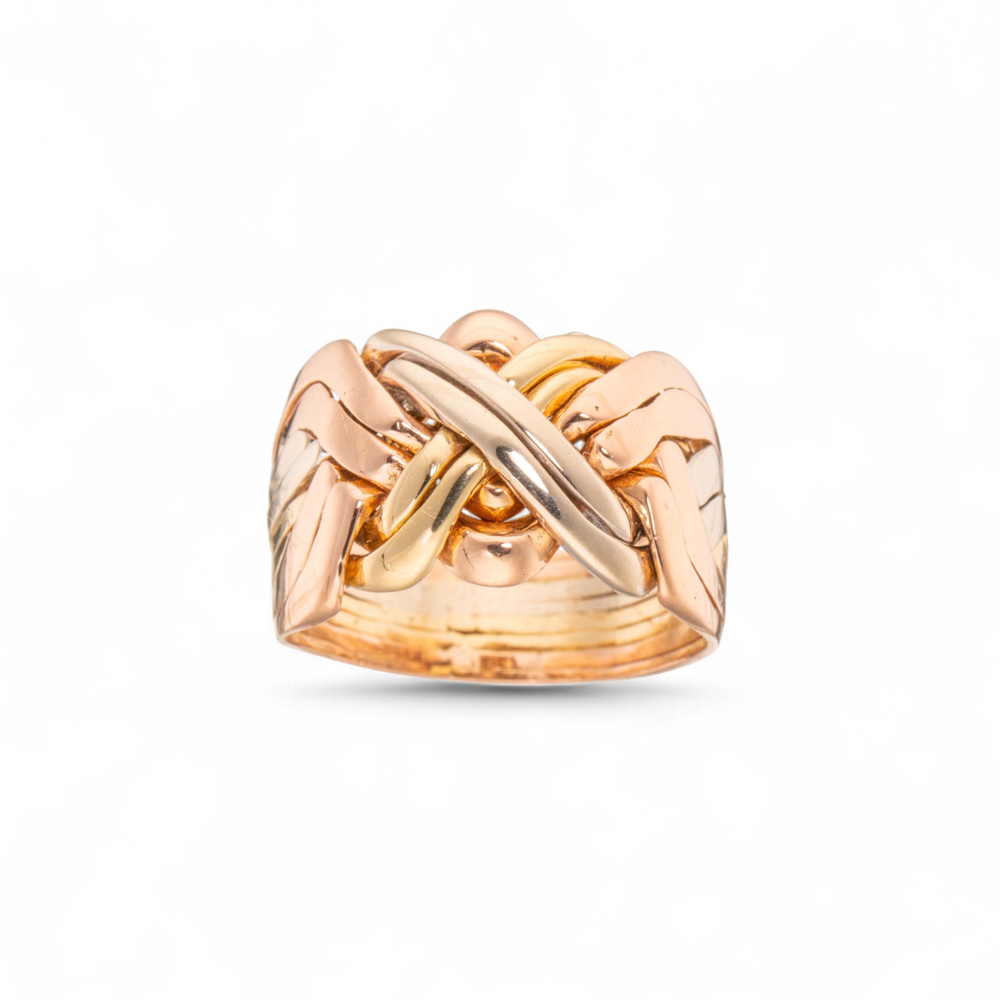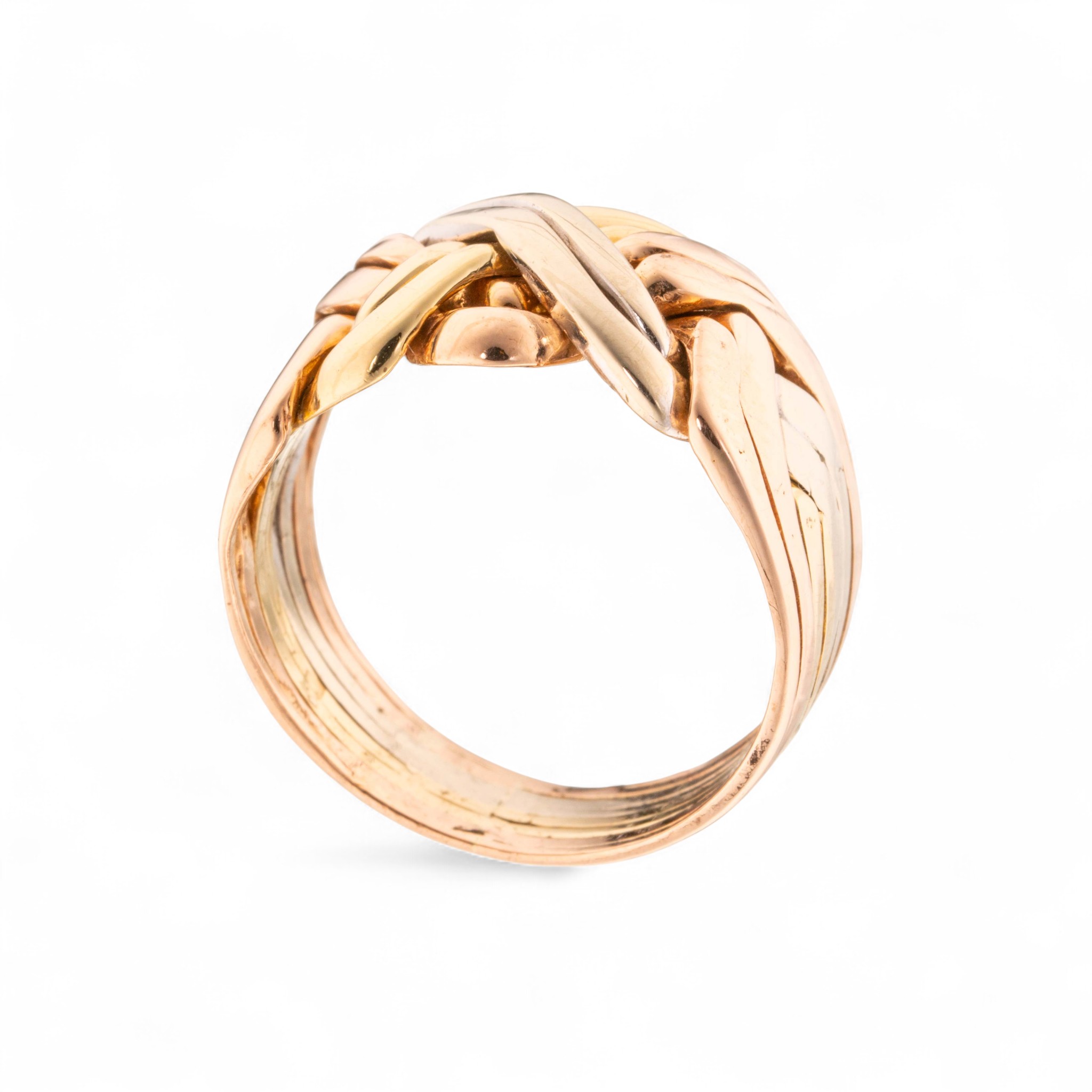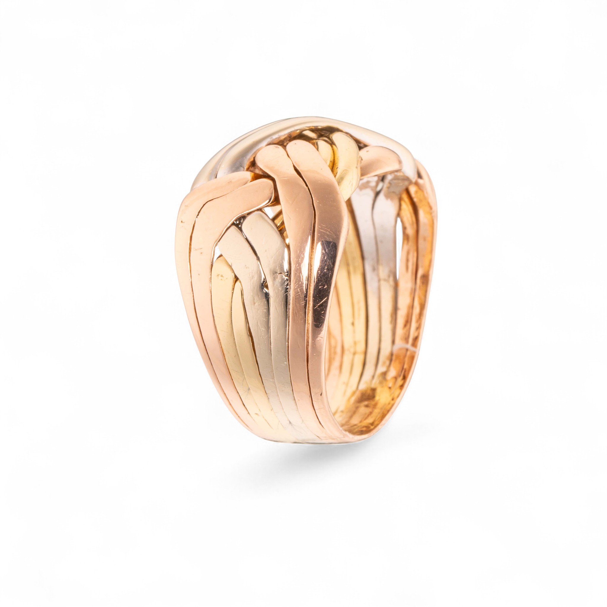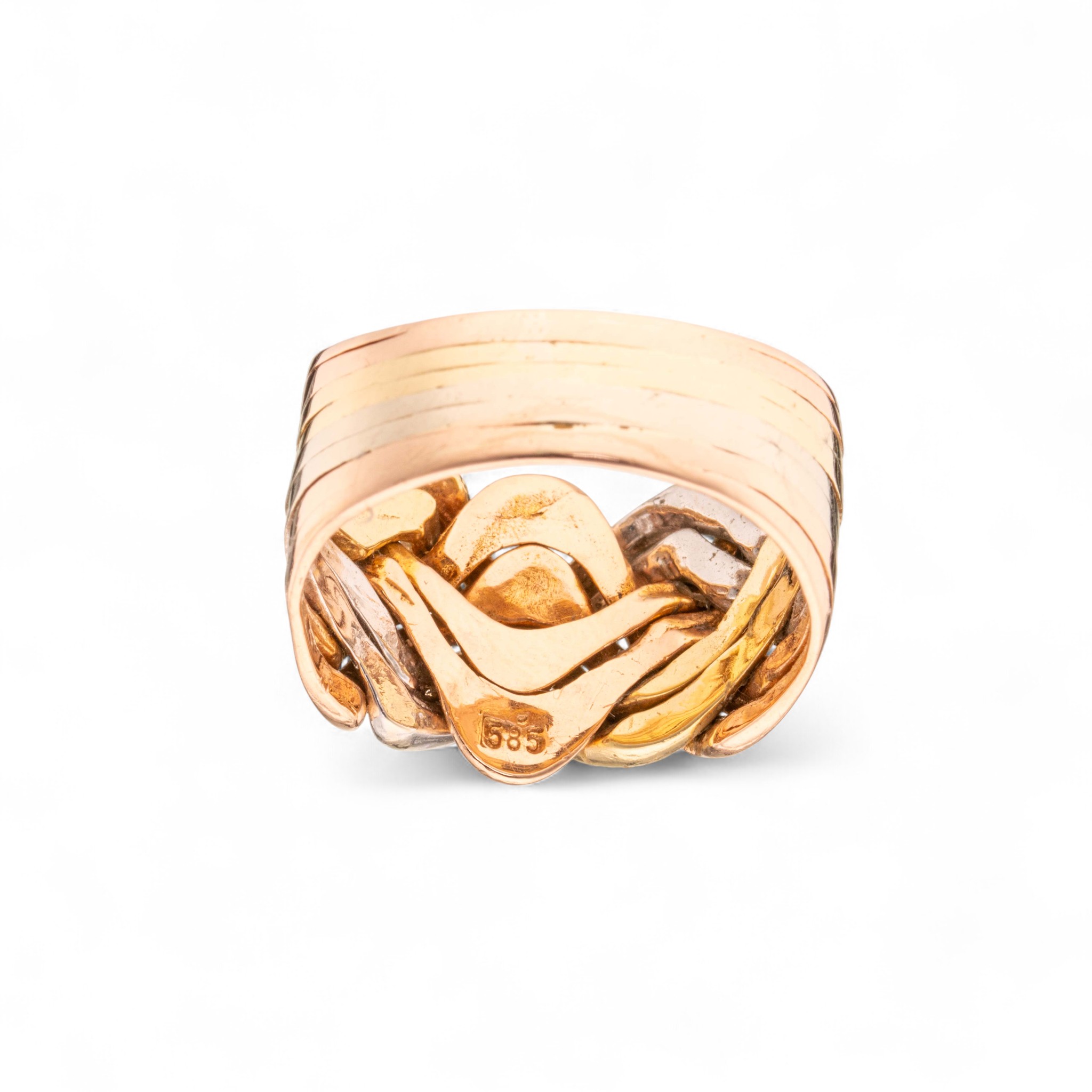 Flettering (Også kjent som puslering eller Libanonring) i 14 karat gull. 8 ledd. Delene er sammenloddet og kan ikke pusles. Lødighetsstemplet «585». Trolig utland. 1900-tallets andre halvdel.