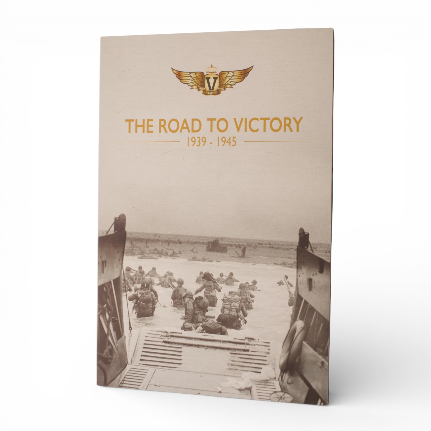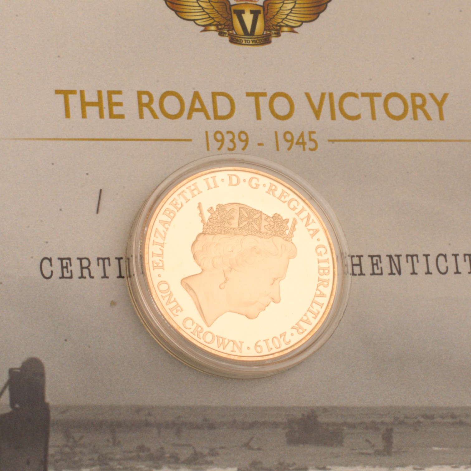 Myntsett: Gibraltar. The Road to Victory 1939-1945. Seks store one crown mynter, 2019. Gullbelagt med ulike motiv. Omslag i metall med tilhørende skriv.
