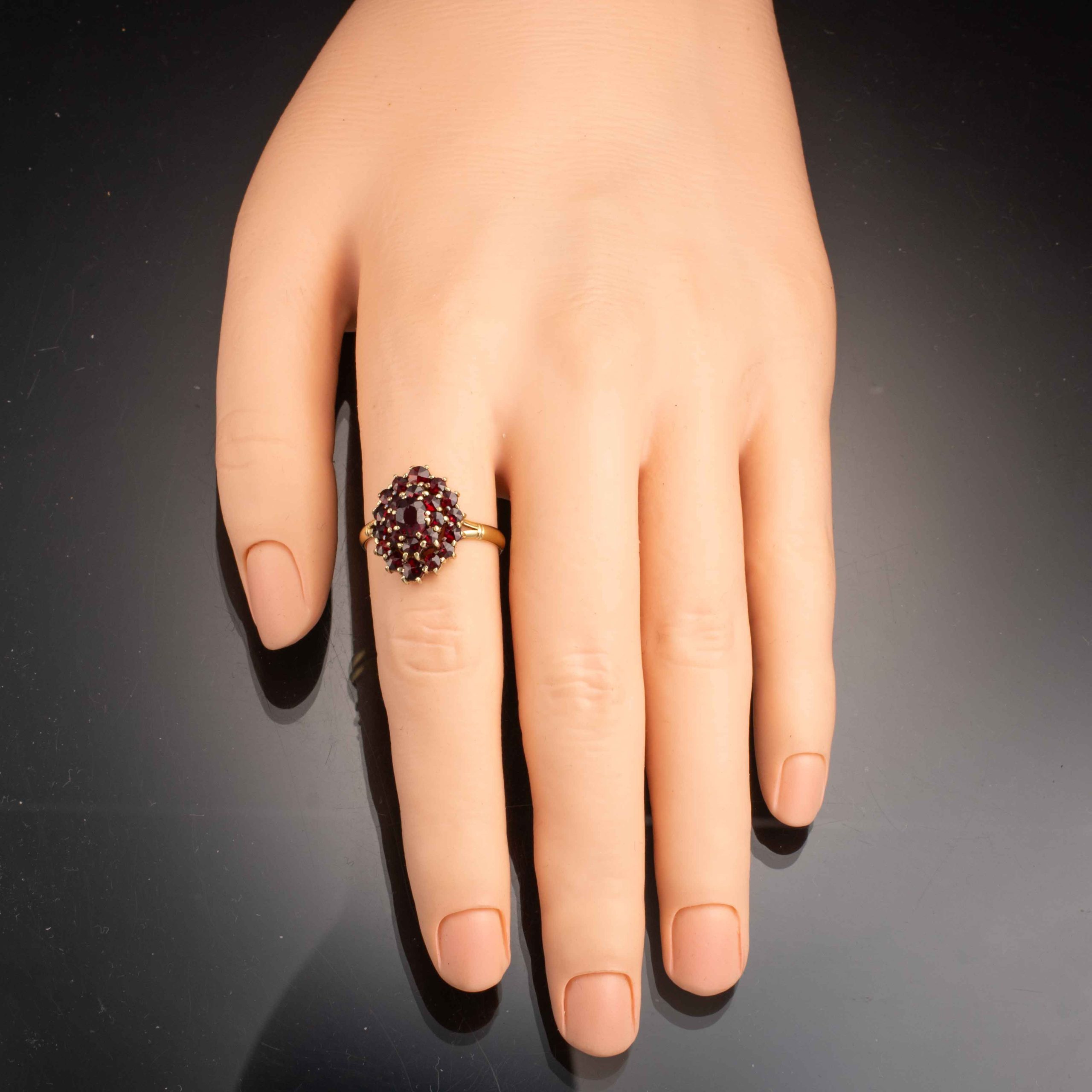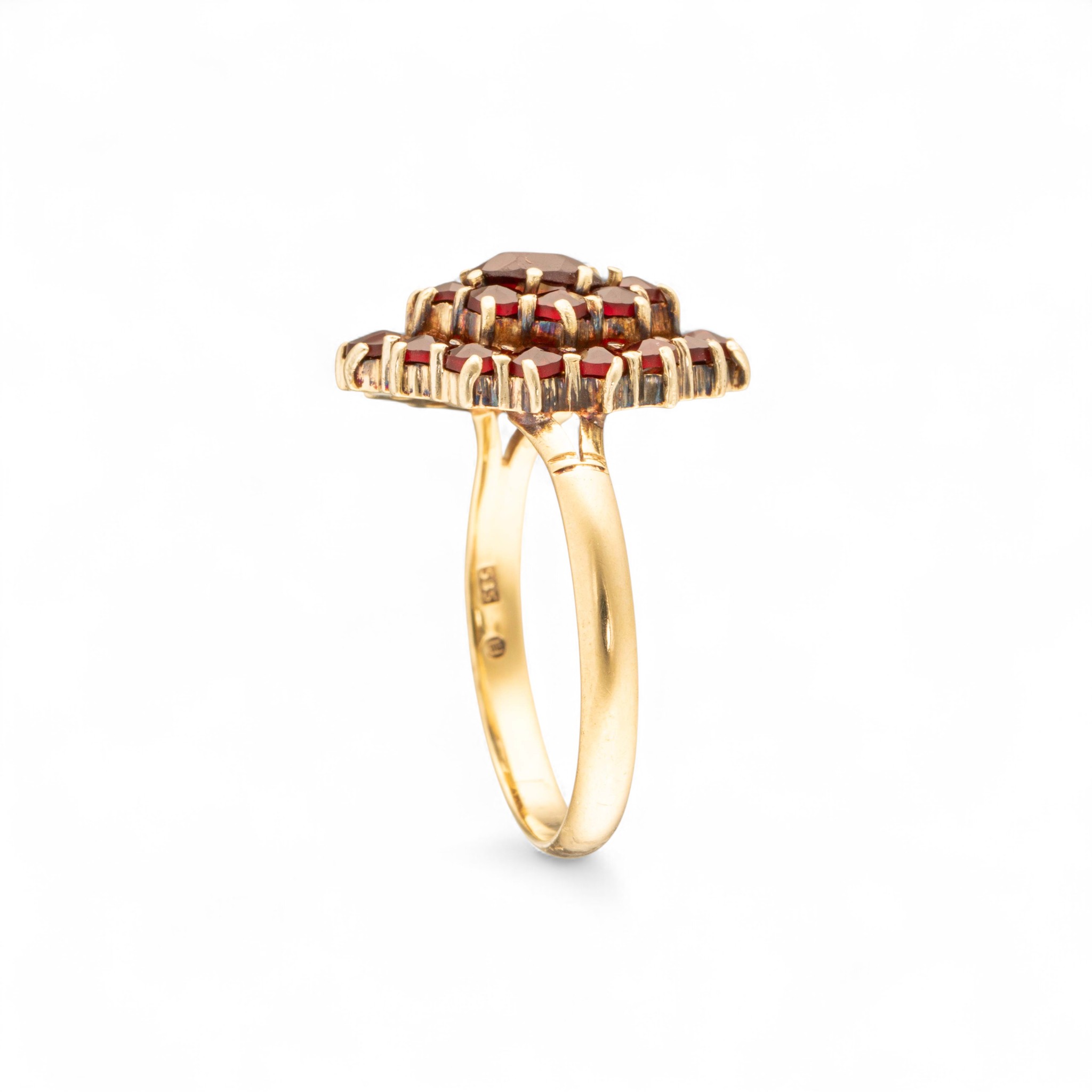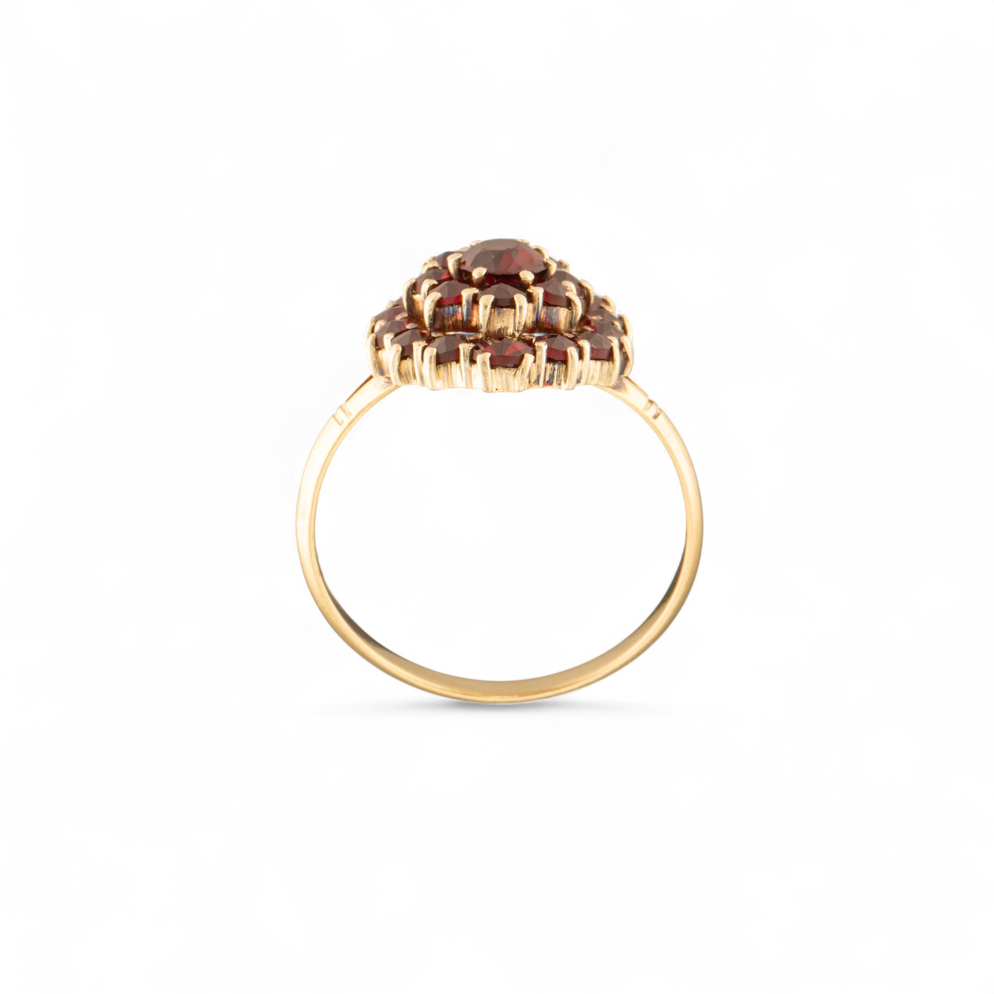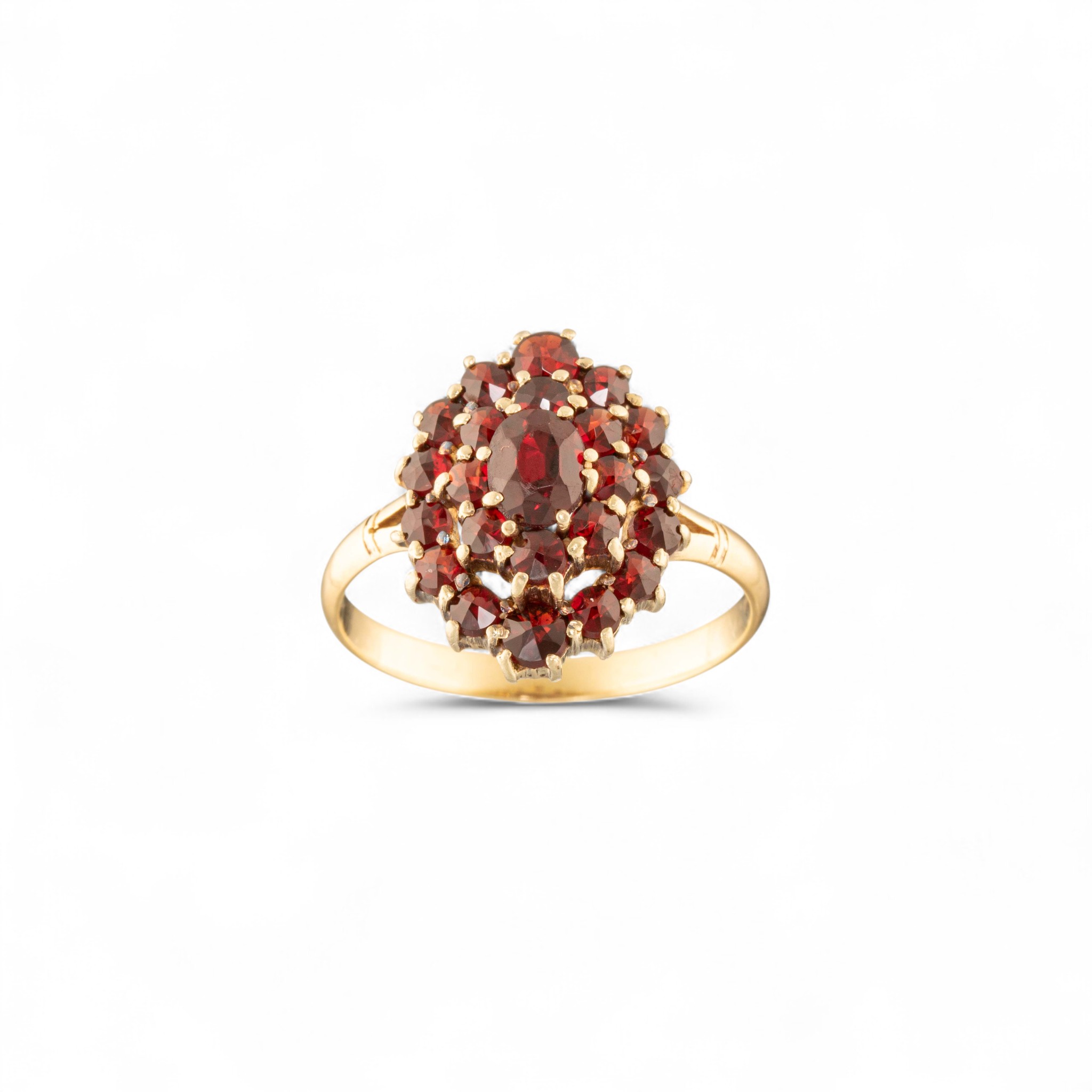 Ring i 14 karat gult gull fattet med 23 granater i rosett. Tidlig ansvarsmerke fra Ivar T. Holth. Oslo. 1900-tallets første halvdel.