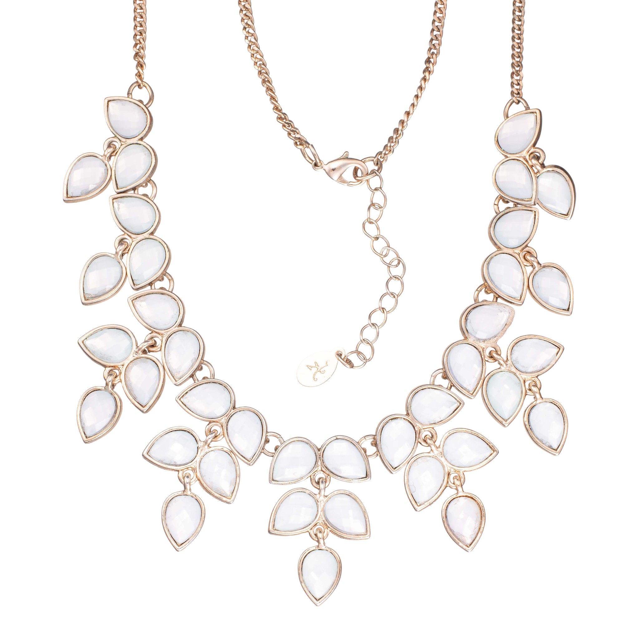 Bijouteri: Halssmykke i hvitt metall med fasetterte, syntetiske smykkesteiner. Hummerklolås. Sent 1900- til tidl. 2000-tallet.