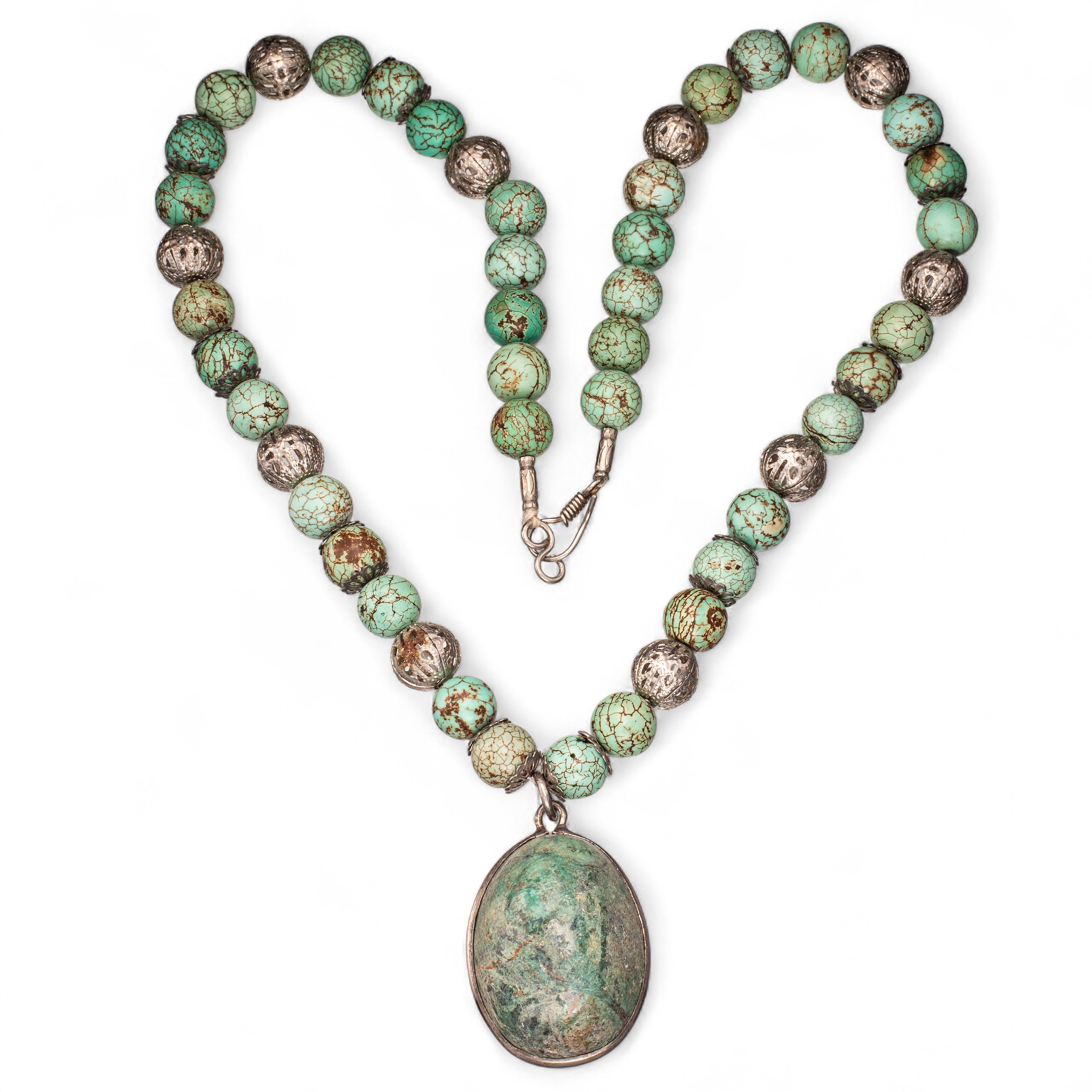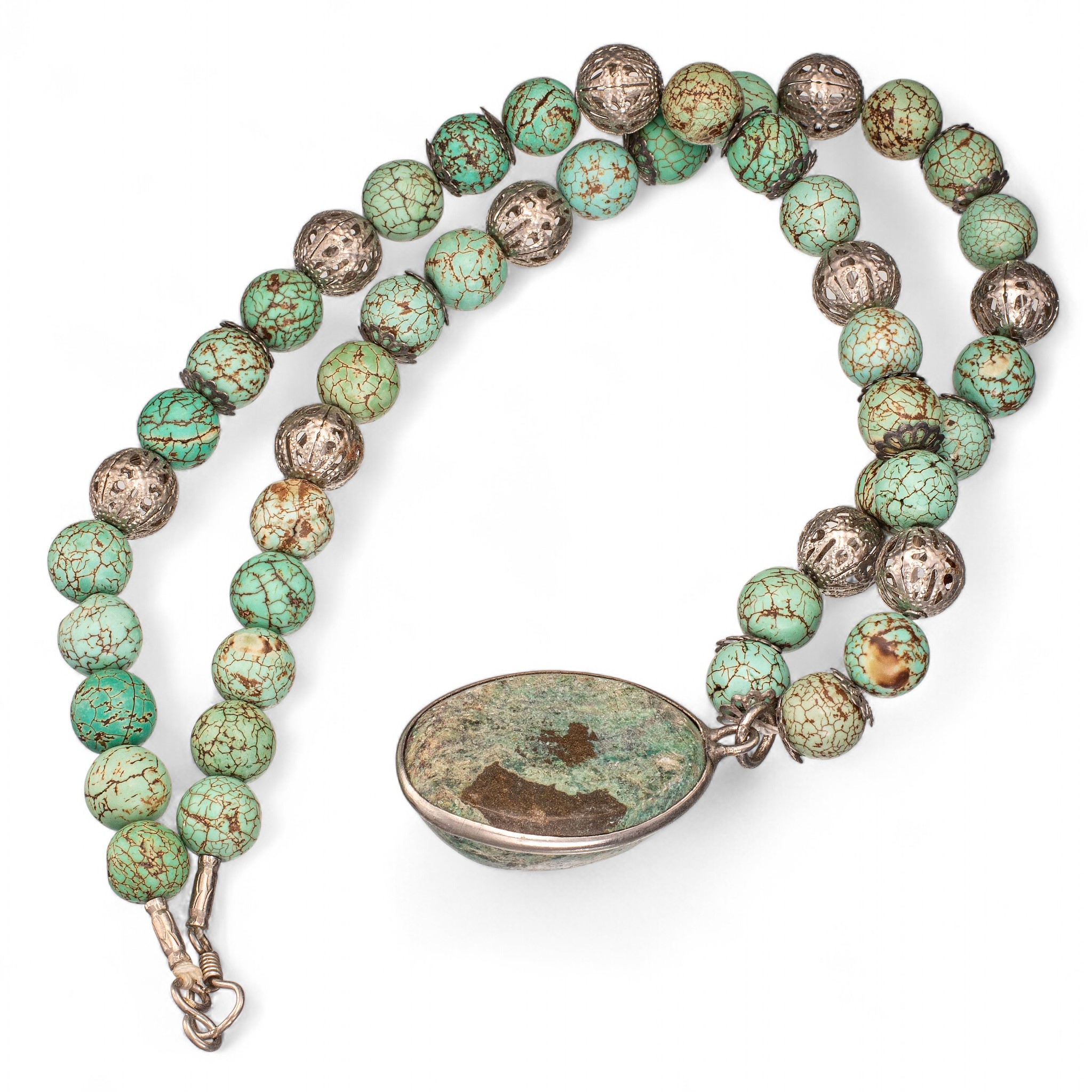 Halssmykke bestående av 38 ekte turkiskuler (D~1,1 cm) tredd på snor. Påfestet et stort stenanheng i antatt krysokoll. Kuler med gjennombrutt mønster i stål. Kroklås og anheng i hvitt, uedelt metall. Utland. 1900-tallets andre halvdel.