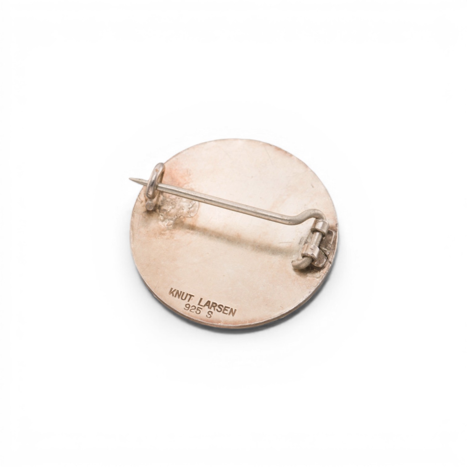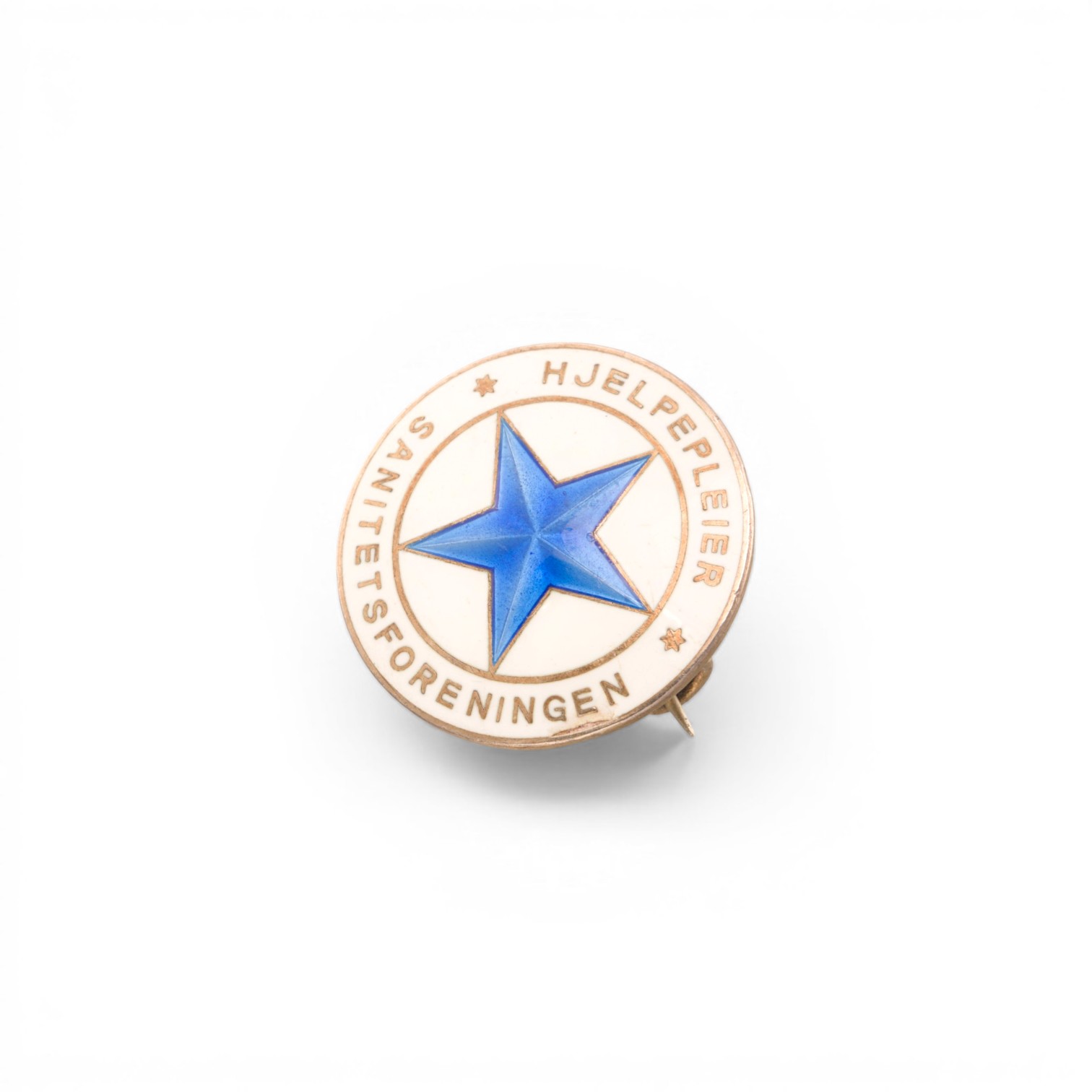 Hjelpepleier, Sanitetsforeningen. Nål i sterling sølv med blå og hvit emalje. Ansvarsmerket for Knut Dagfin Larsen. Oslo. 1900-tallets andre halvdel.