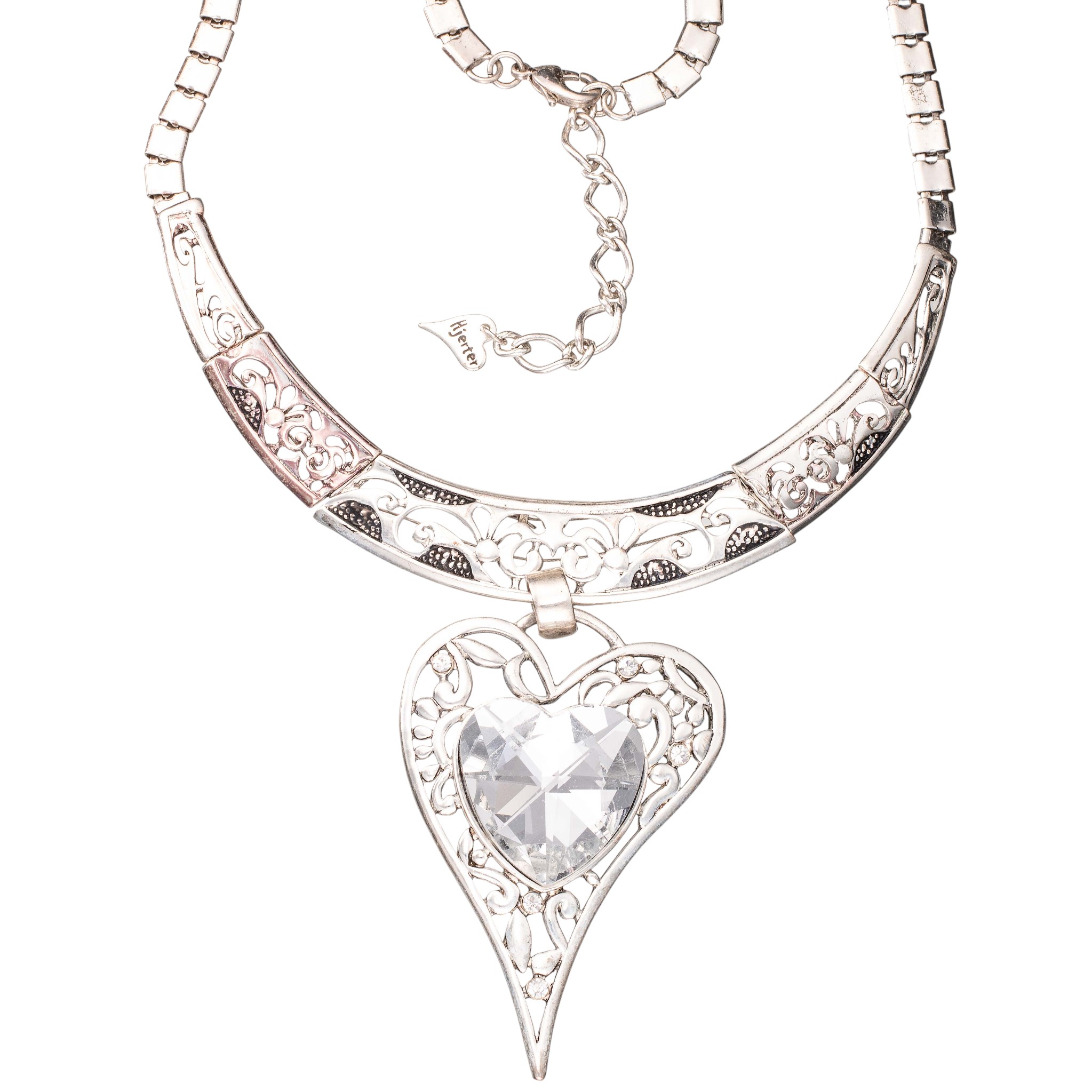 Bijouteri: Stort hjerte halssmykke. Gjennombrutt dekor på hvitt metall med fasetterte stener i glass. Ansvarsmerket «Hjerter». Son, Norge. Tidl. 2000-tallet.
