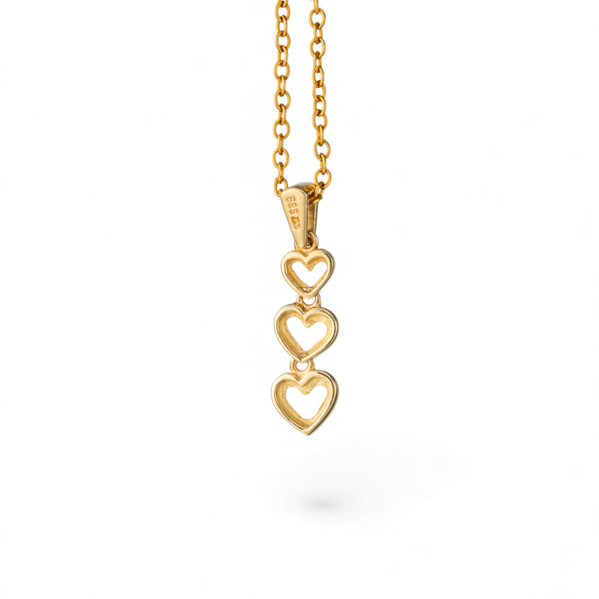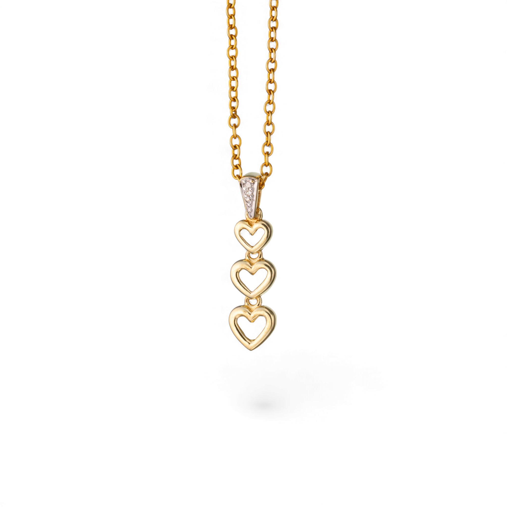 Trippelt hjerteanheng i 14 karat gult gull. Fattet med en liten diamant (ca. 0,005 ct.). Ansvarsmerket «JSa» for Jing & Jørgen Sandberg. Danmark. Sent 1900-tallet til tidl. 2000-tallet.