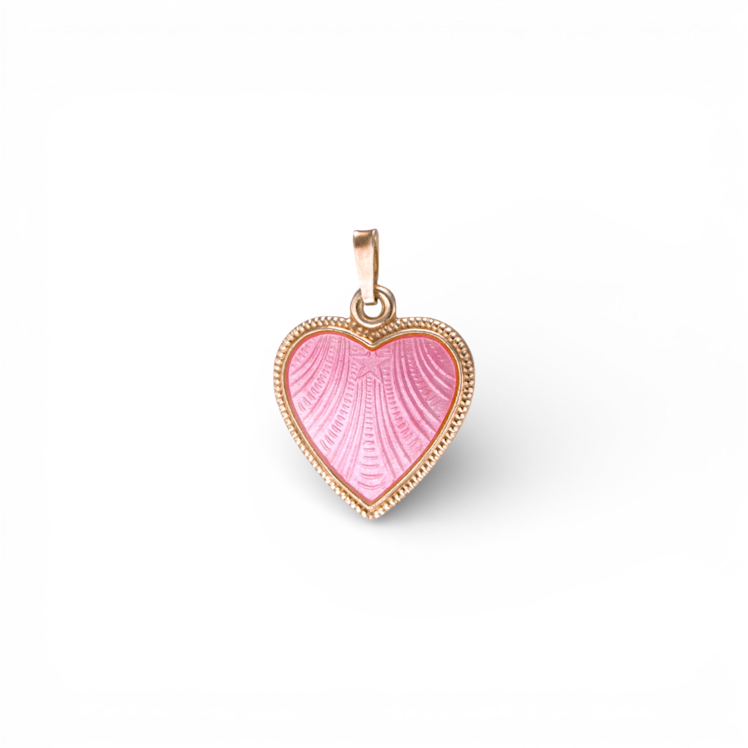 Hjerteanheng i sterling sølv. Mønstret med rosa emalje. Bakside med «Fader vår» tekst. Ansvarsmerket «ANA» for Gullsmed Arne Nordlie A/S. Oslo. 1900-tallets andre halvdel.