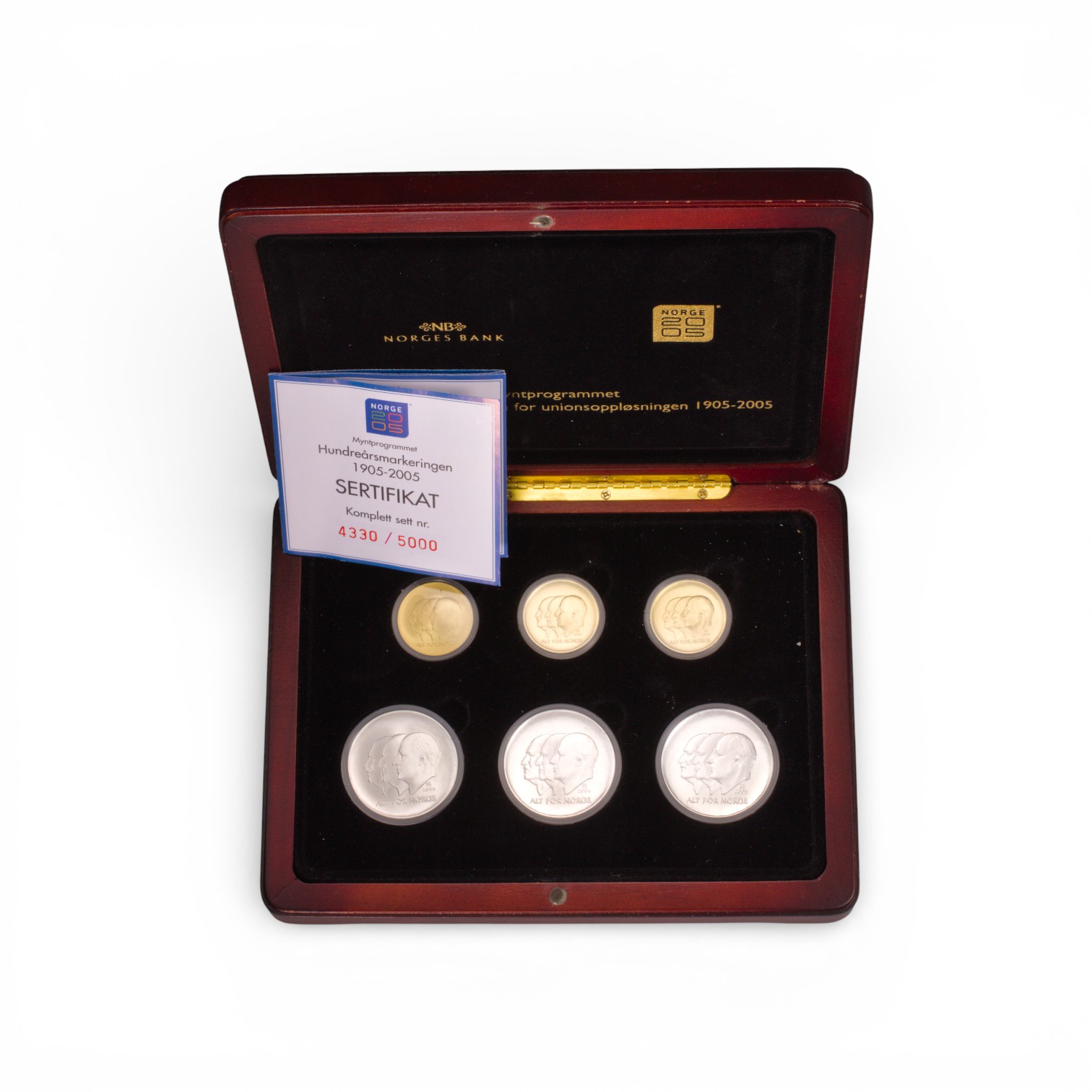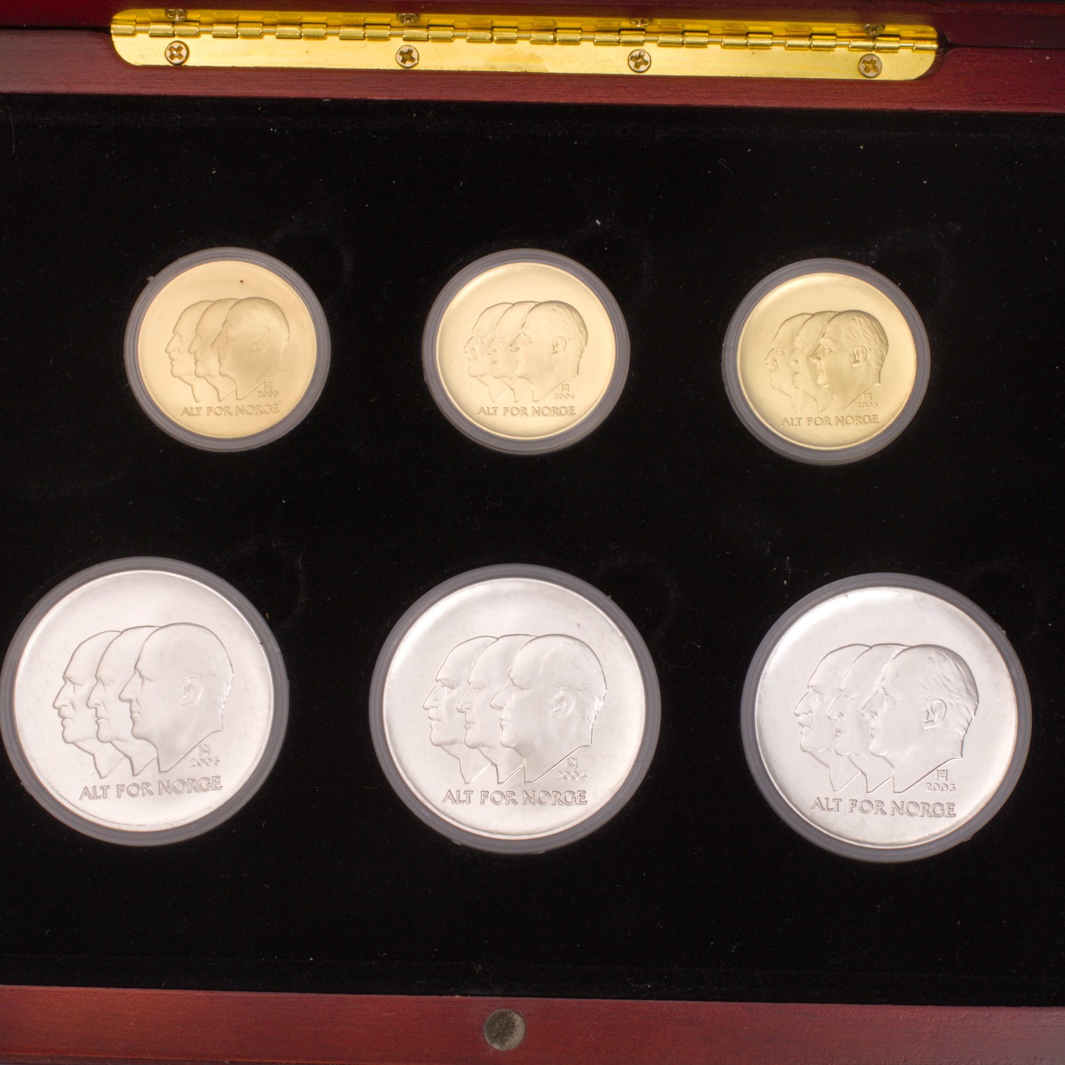 Lillehammer OL 1994 komplett sett gull og sølv. Består av 3 mynter i 91,7% gull og 3 mynter i 92,5% sølv. Originalt skrin og vedlegg.