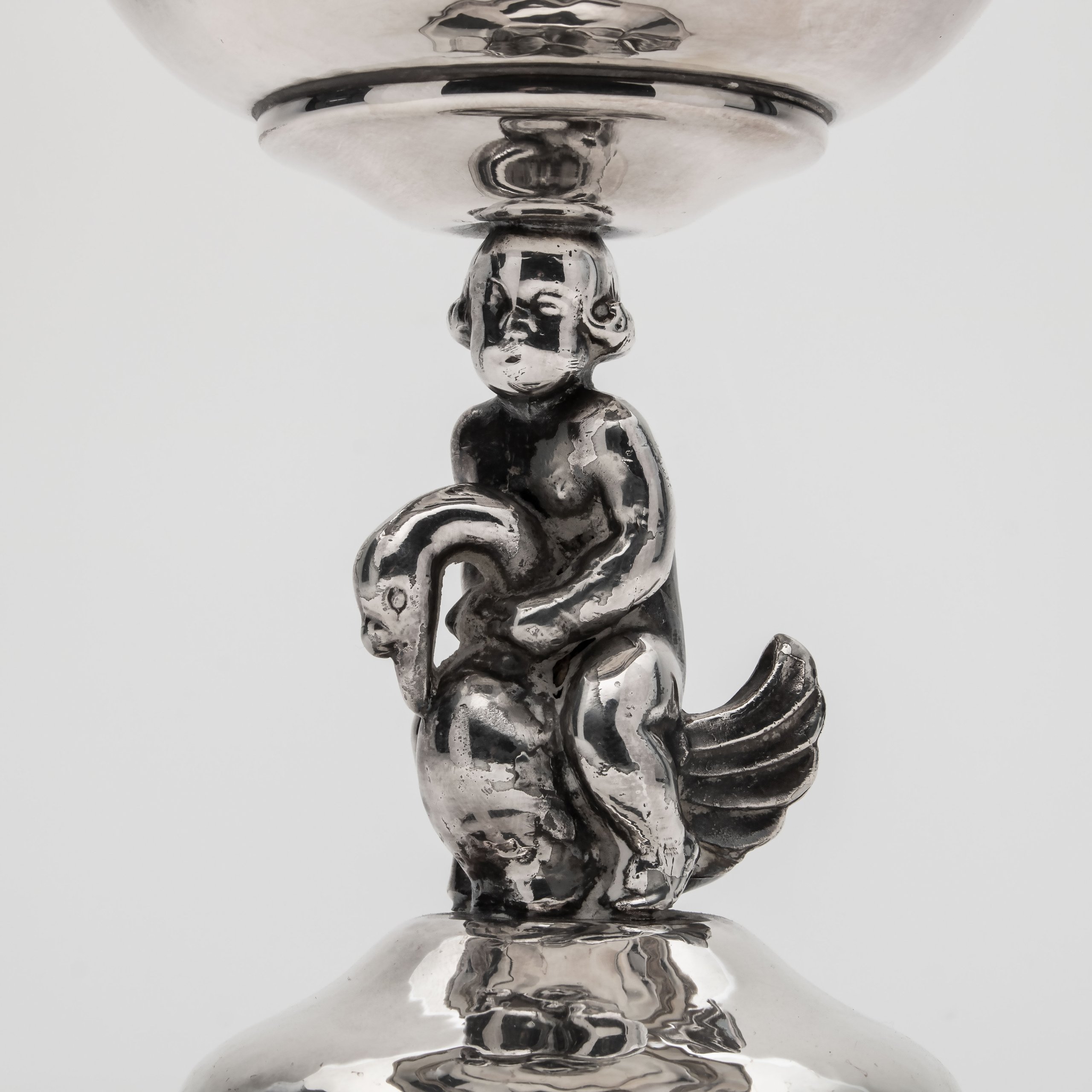 Skål på stett formet som barn og svane. Skål og sokkel i sølv (ikke selve figuren). Sokkel stemplet DA (Landsorganisasjonen Dansk Arbejde). Utydelig mesterstempel. 1900-tallets første halvdel.