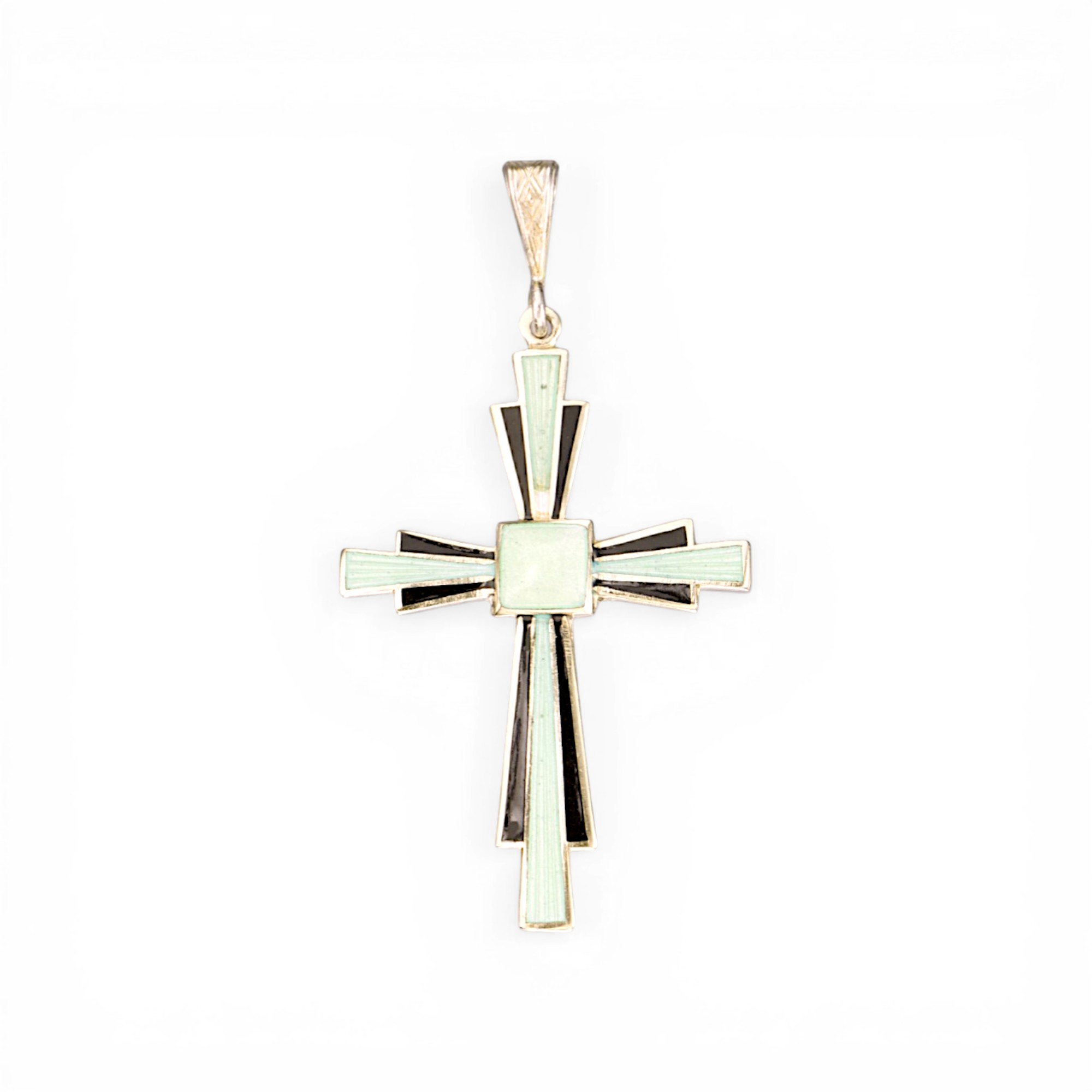 Aheng i sterling sølv med sort og lys grønn emalje. Ansvarsmerket «Norne». Aksel Holmsen AS. Midten av 1900-tallet.