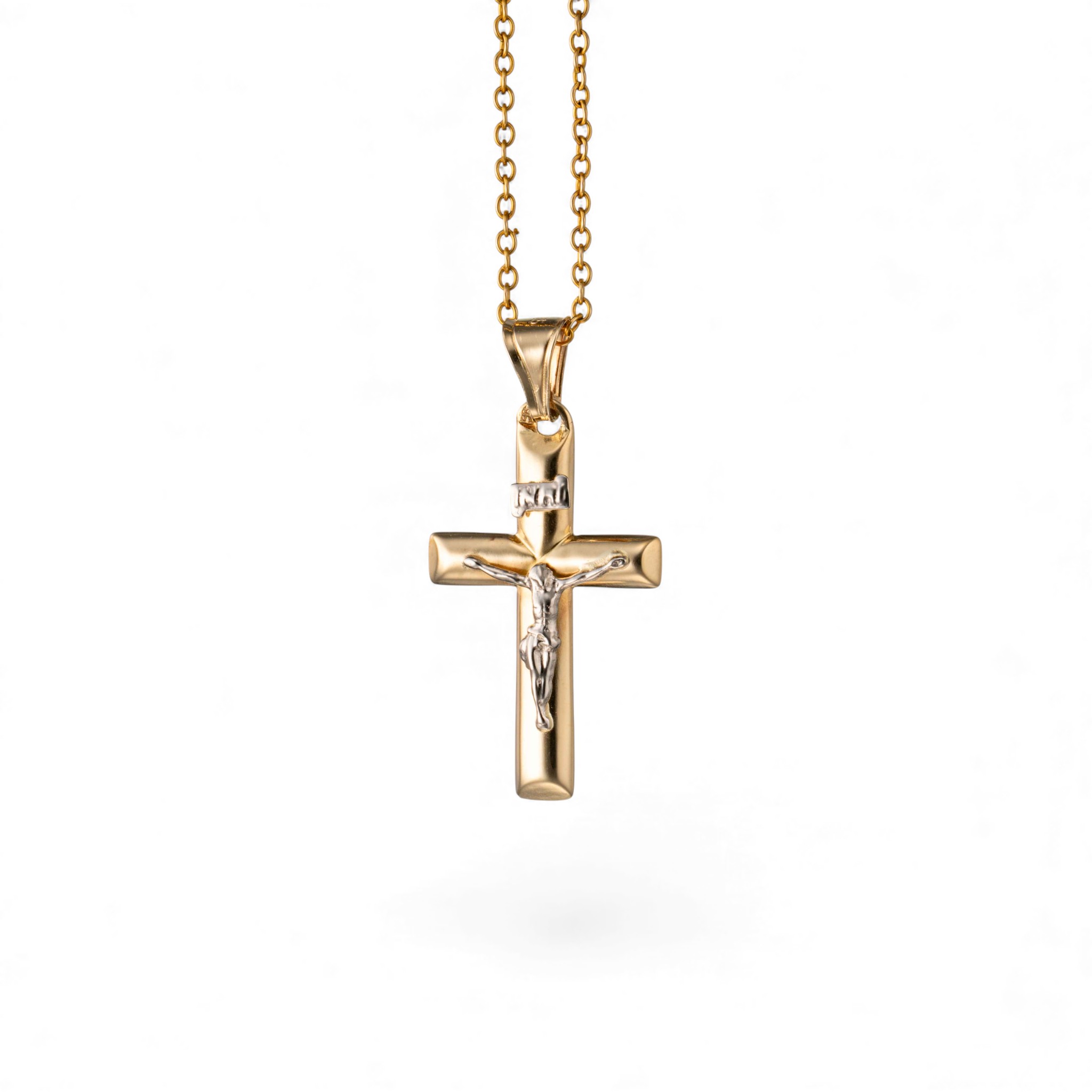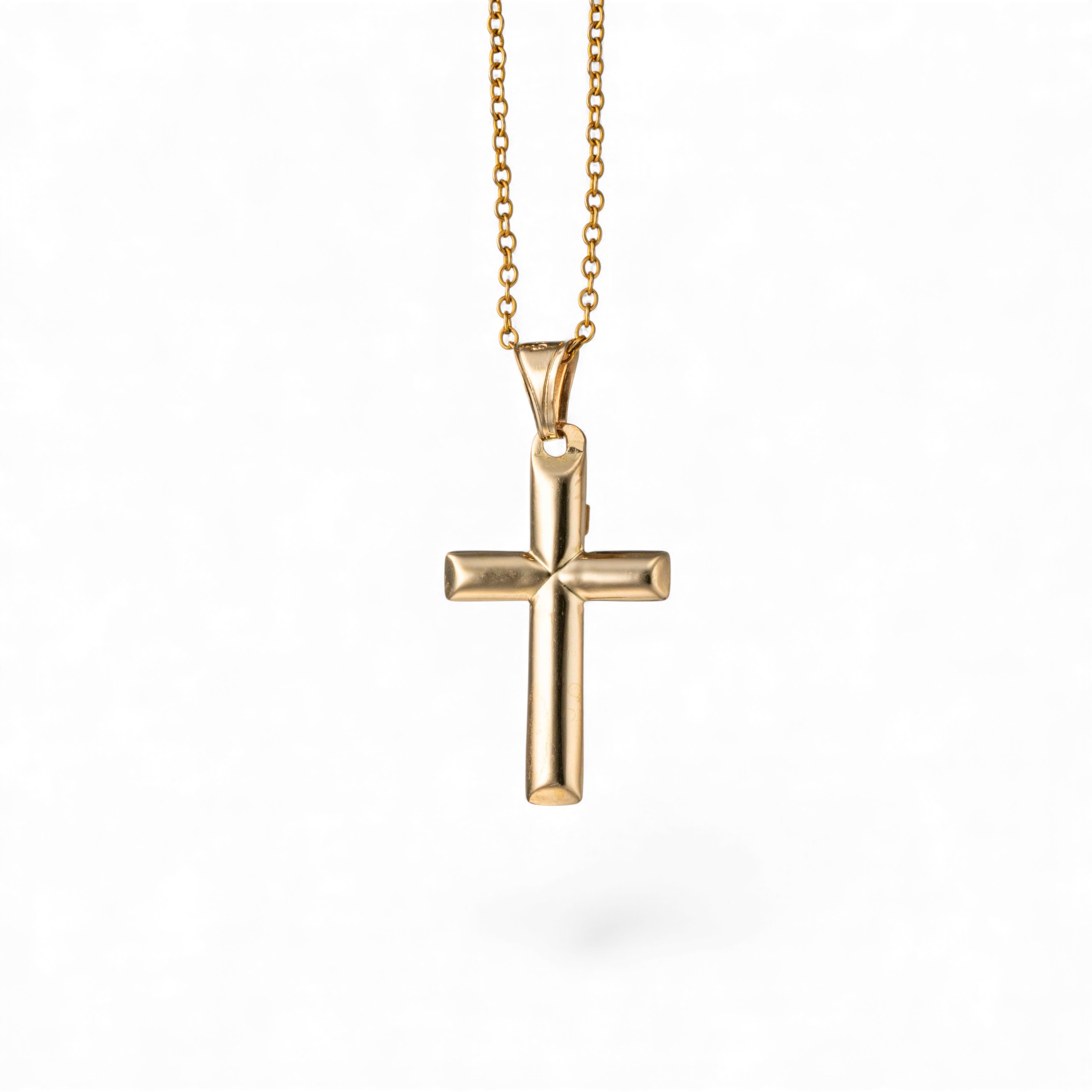 Korsanheng i 14 karat gull. Avrundet, hul utførelse. Lødighetsstemplet. Trolig Sør-Europa. 1900-tallets andre halvdel.