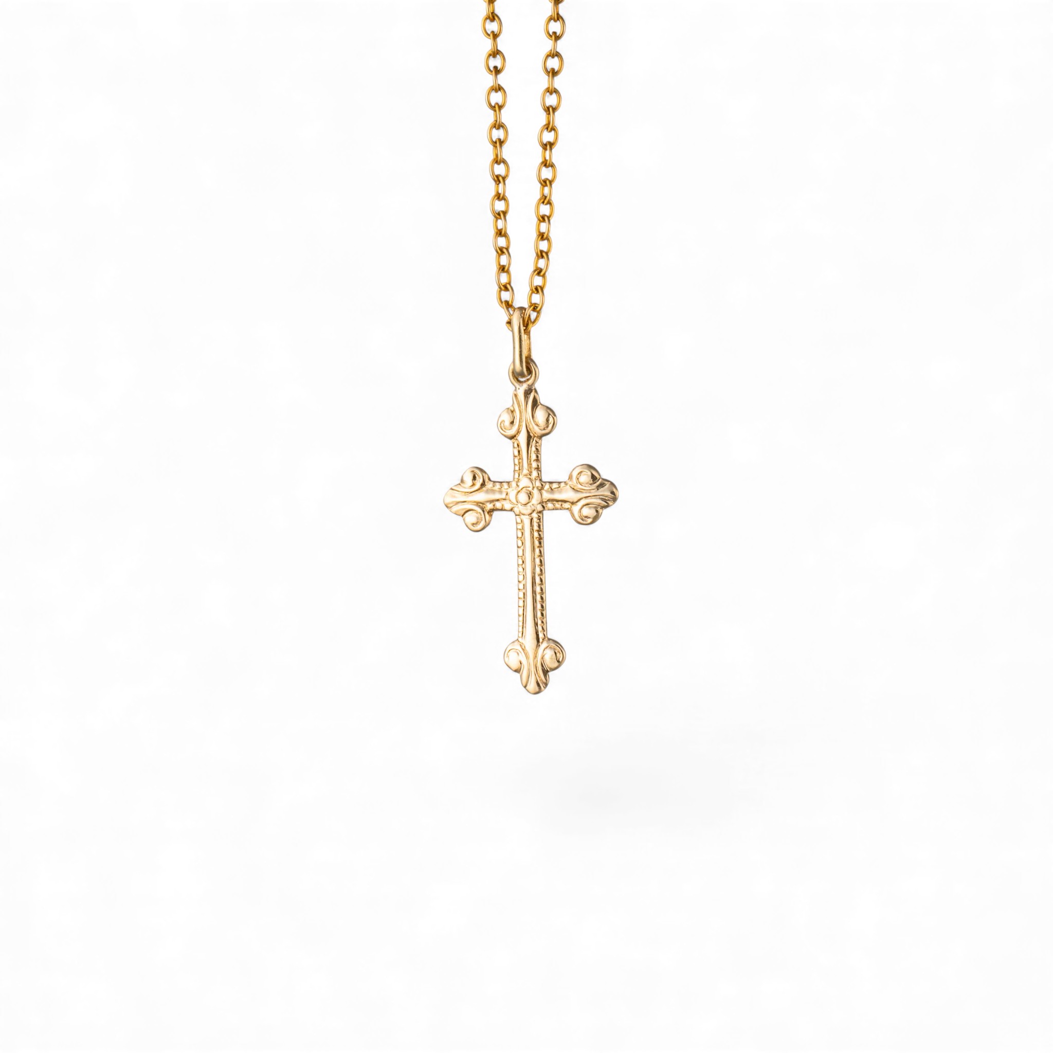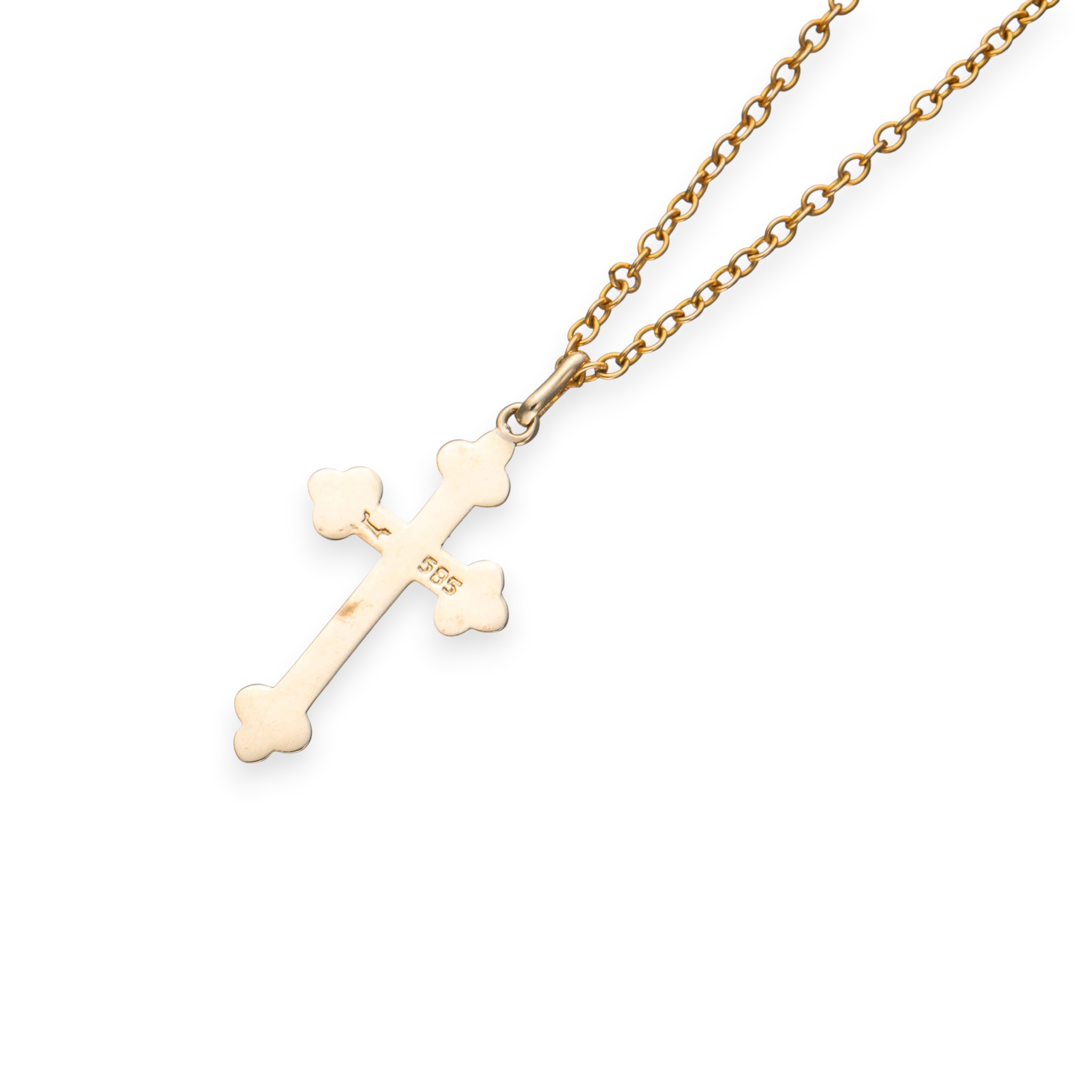 Lite korsanheng i 14 karat gult gull. Mønstret ene side. Ansvarsmerket for Lars Harsheim. Oslo. Midten av 1900-tallet.
