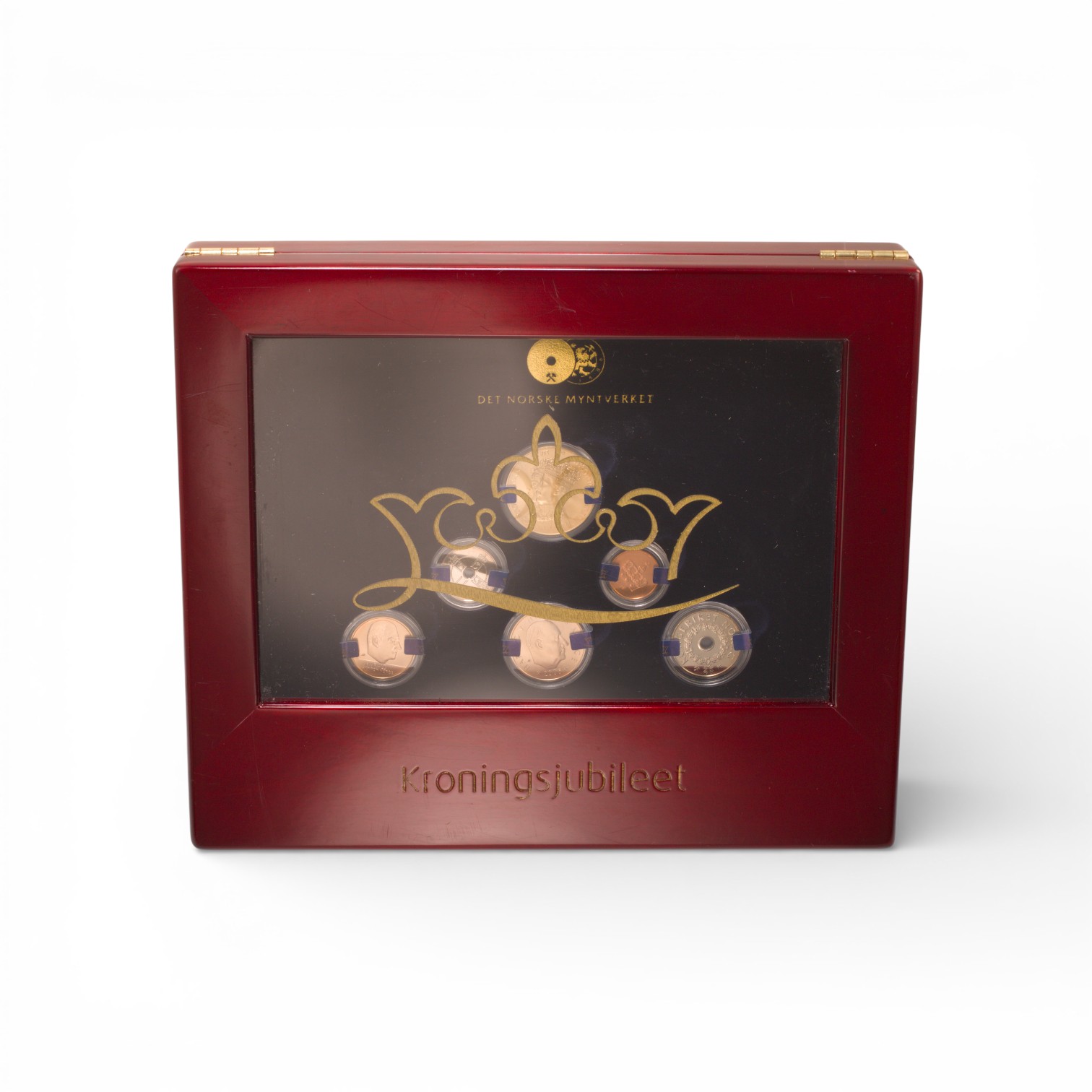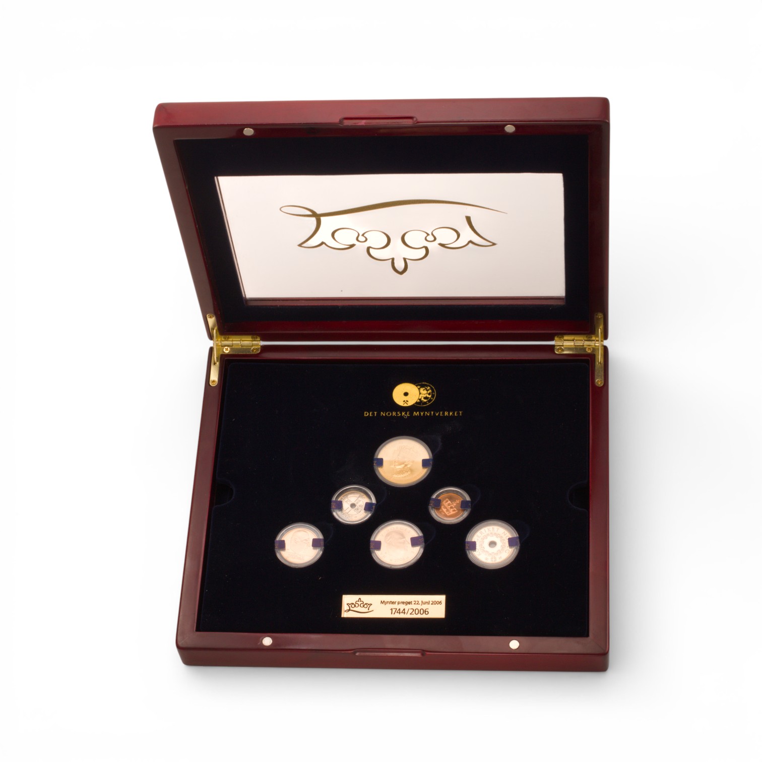 Kroningsjubileet. Myntsett bestående av mynter fra år 2006 samt en gullbelagt medalje (sterling sølv, 925) øverst.