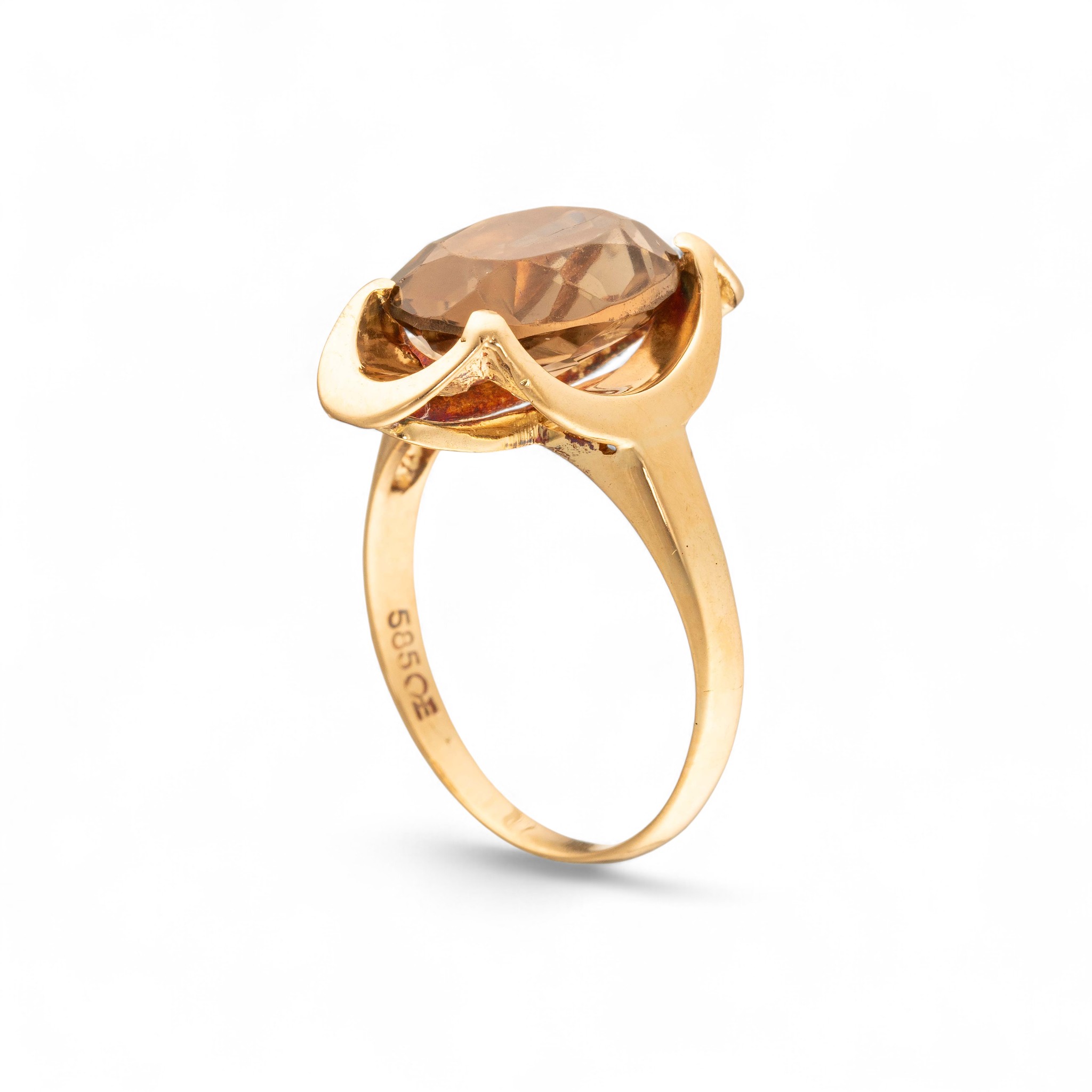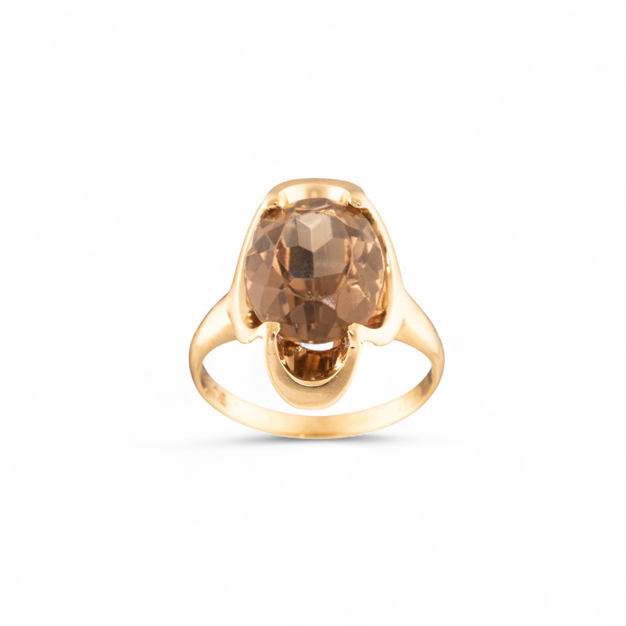 Ring i 14 karat gult gull. Fattet med røkkvarts i klør med lepper. Ansvarsmerket for Sigurd Homstvedt. Bergen. 1900-tallets andre halvdel.