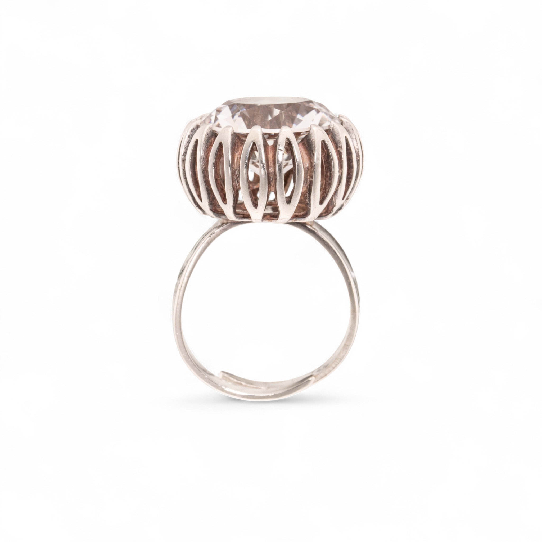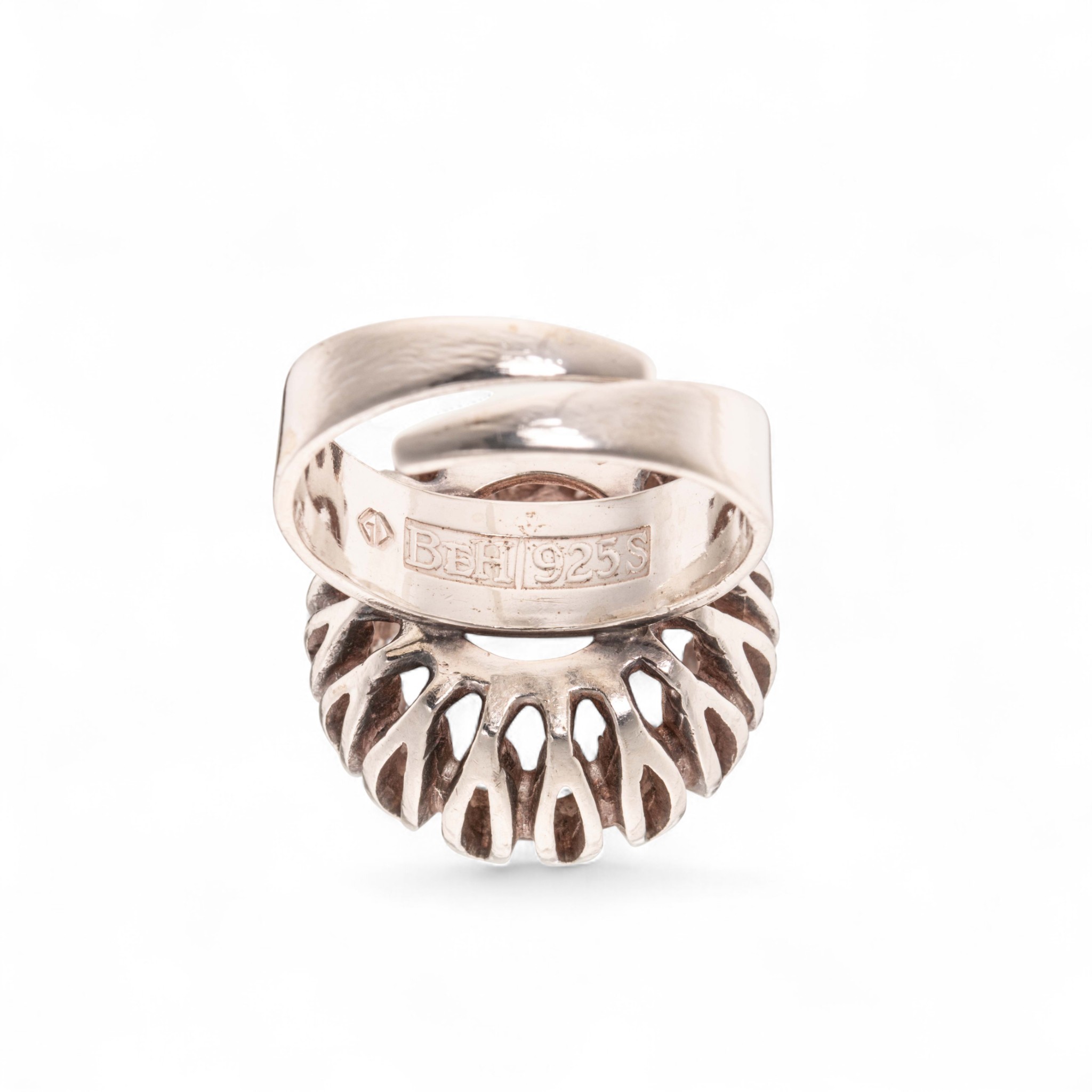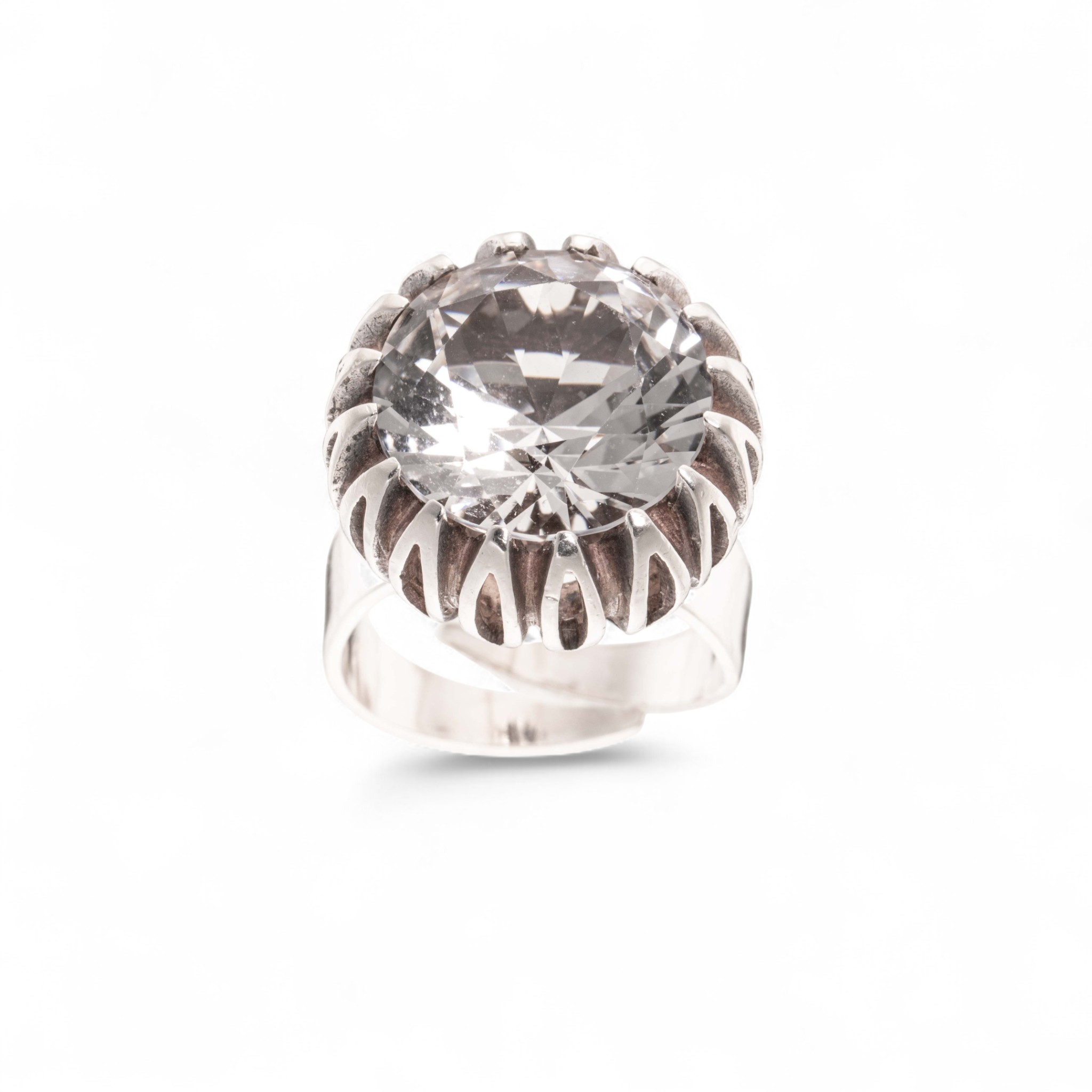 Ring i sterling sølv fattet med stor kvarts på høy krone. Ansvarsmerket «BeH» for Bengt Hallberg. Köping, Sverige. Modernisme. 1900-tallets andre halvdel.