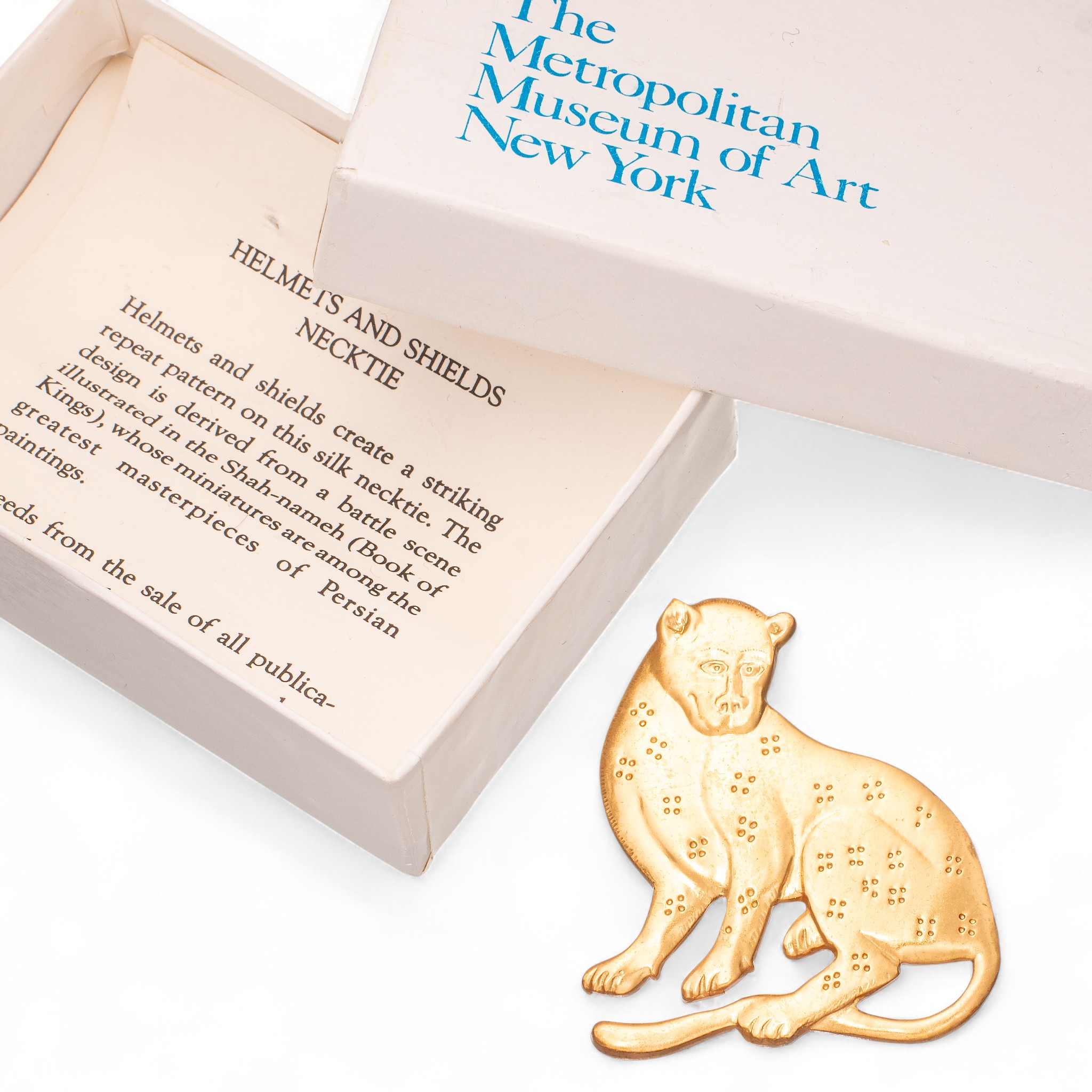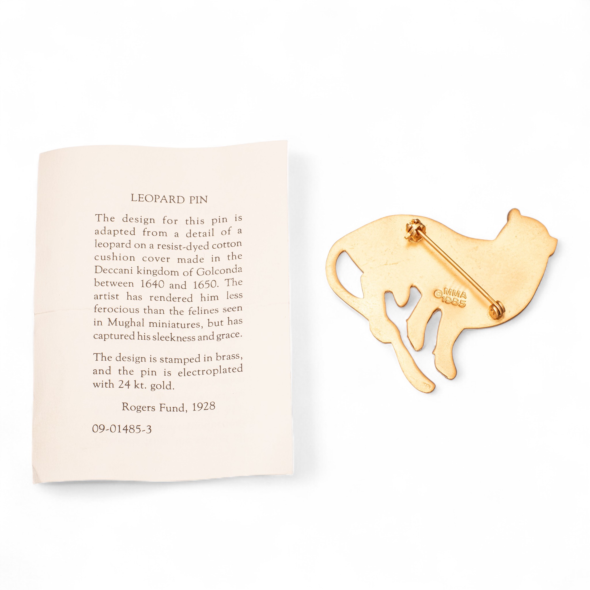 Leopardnål i messing belagt med 24 karat gull. Original utgivelse fra «MMA» – «The Metropolitian Museum of Art, New York». Datert 1985.