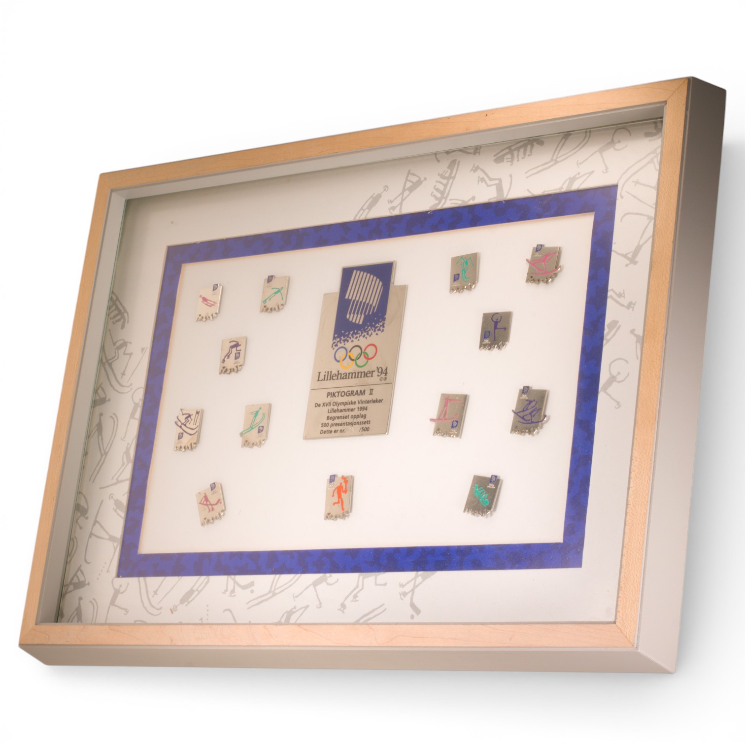 Presentasjonssett med pins fra Lillehammer OL 1994. Innrammet med oppheng.