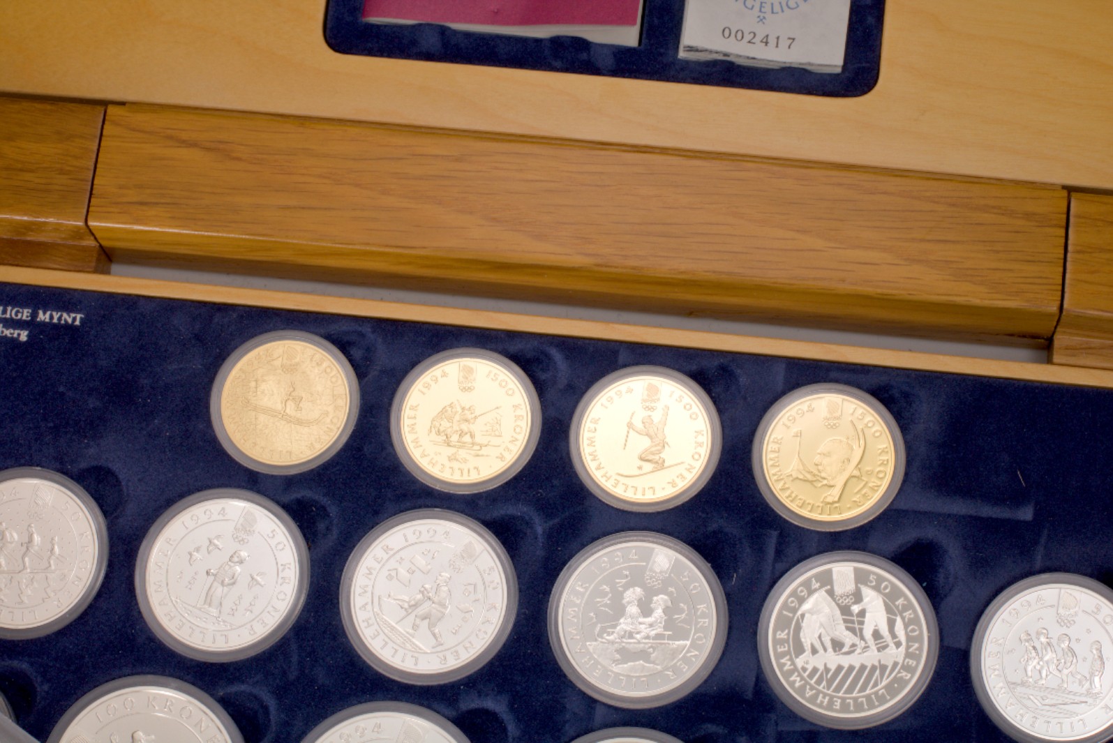 Lillehammer OL 1994 komplett sett gull og sølv. Består av 4 mynter i 91,7% gull og 6 mynter i 92,5% sølv. Originalt treskrin med omslag.