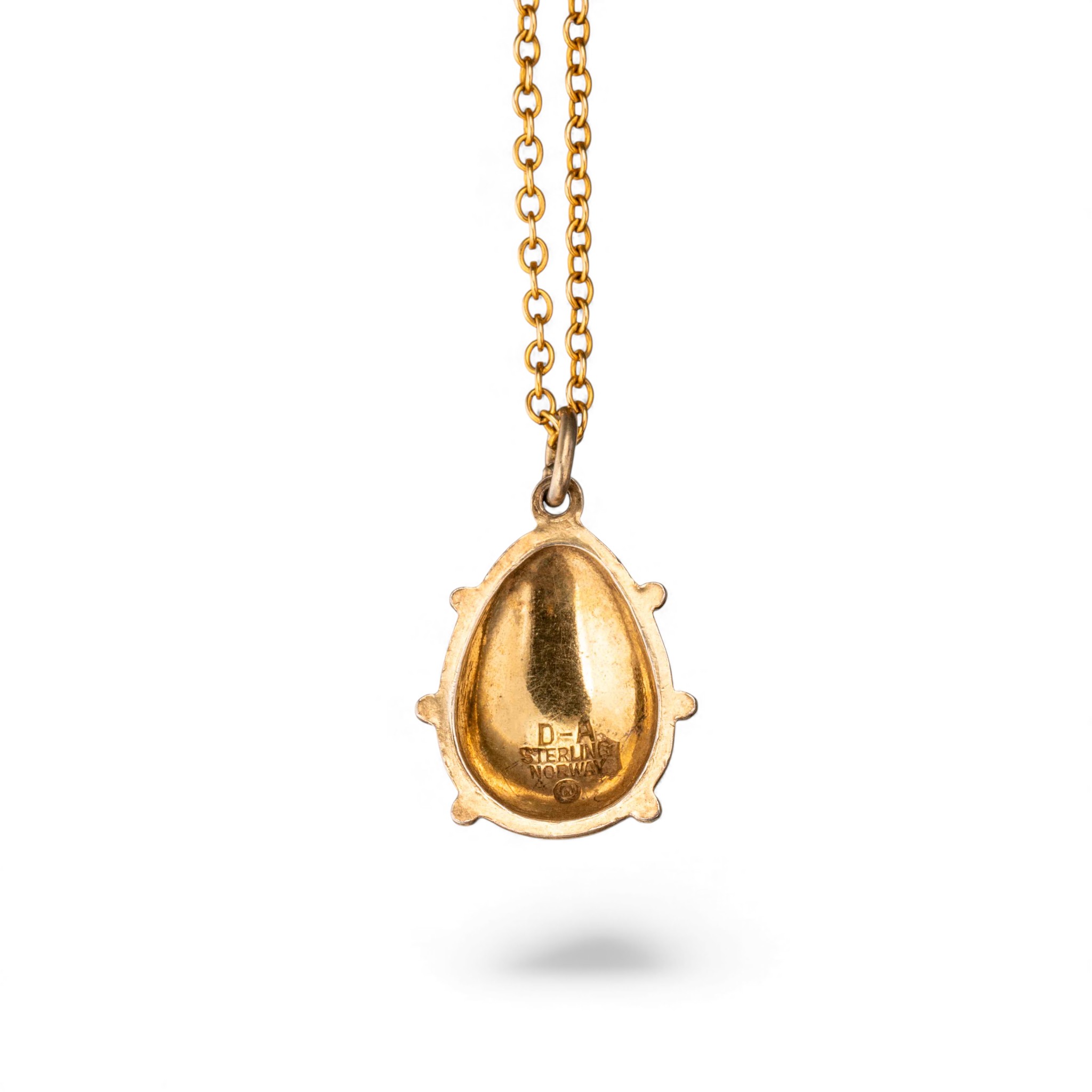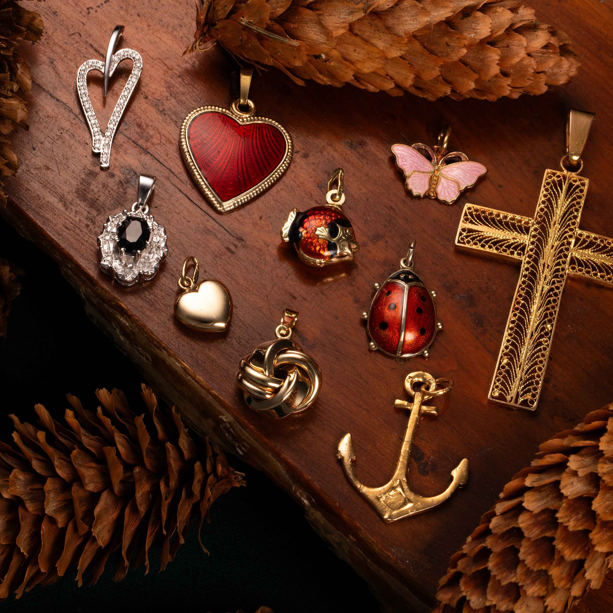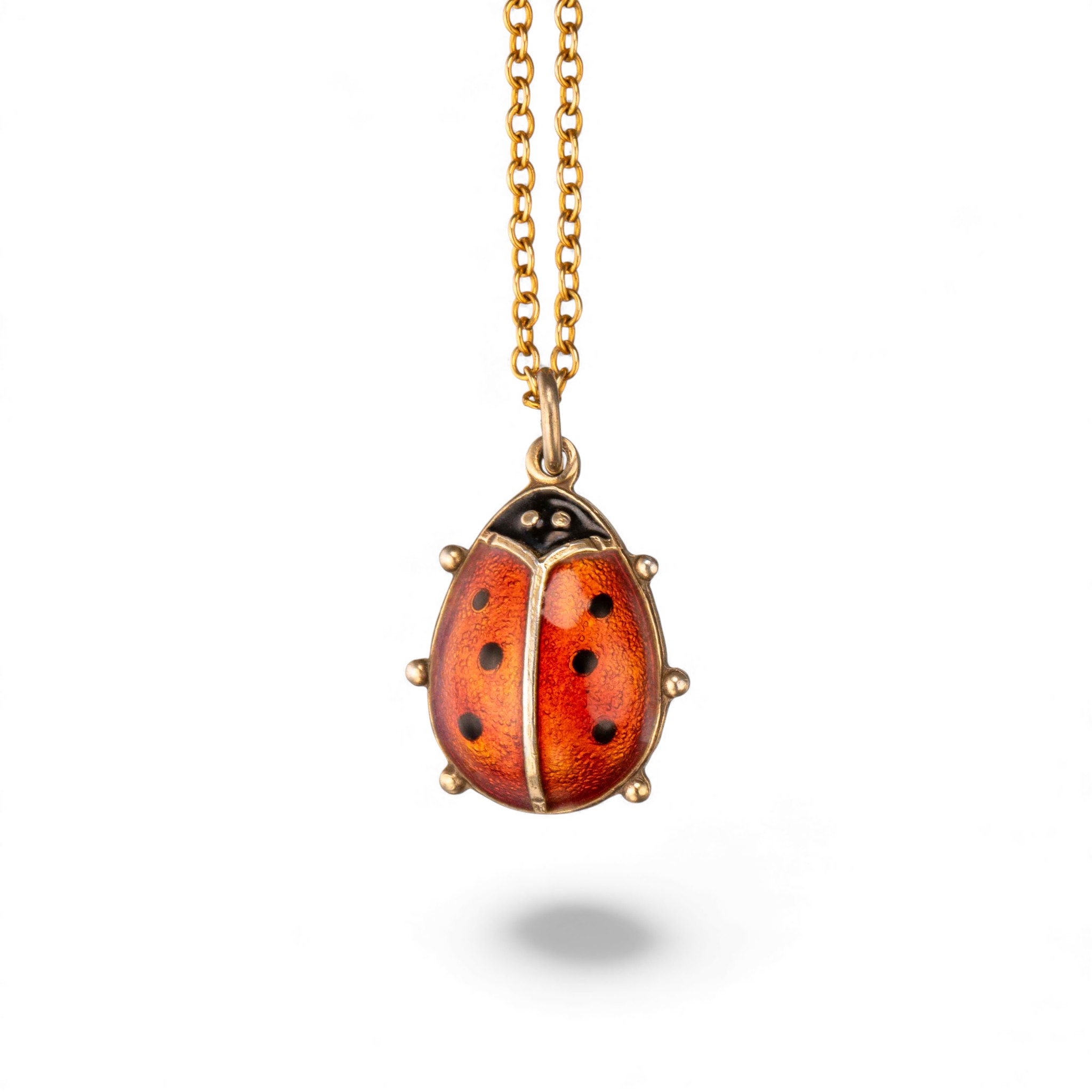 Marihøne anheng i sort og rød emalje på sterling sølv. Ansvarsmerket for David-Andersen. Oslo. 1900-tallets andre halvdel.