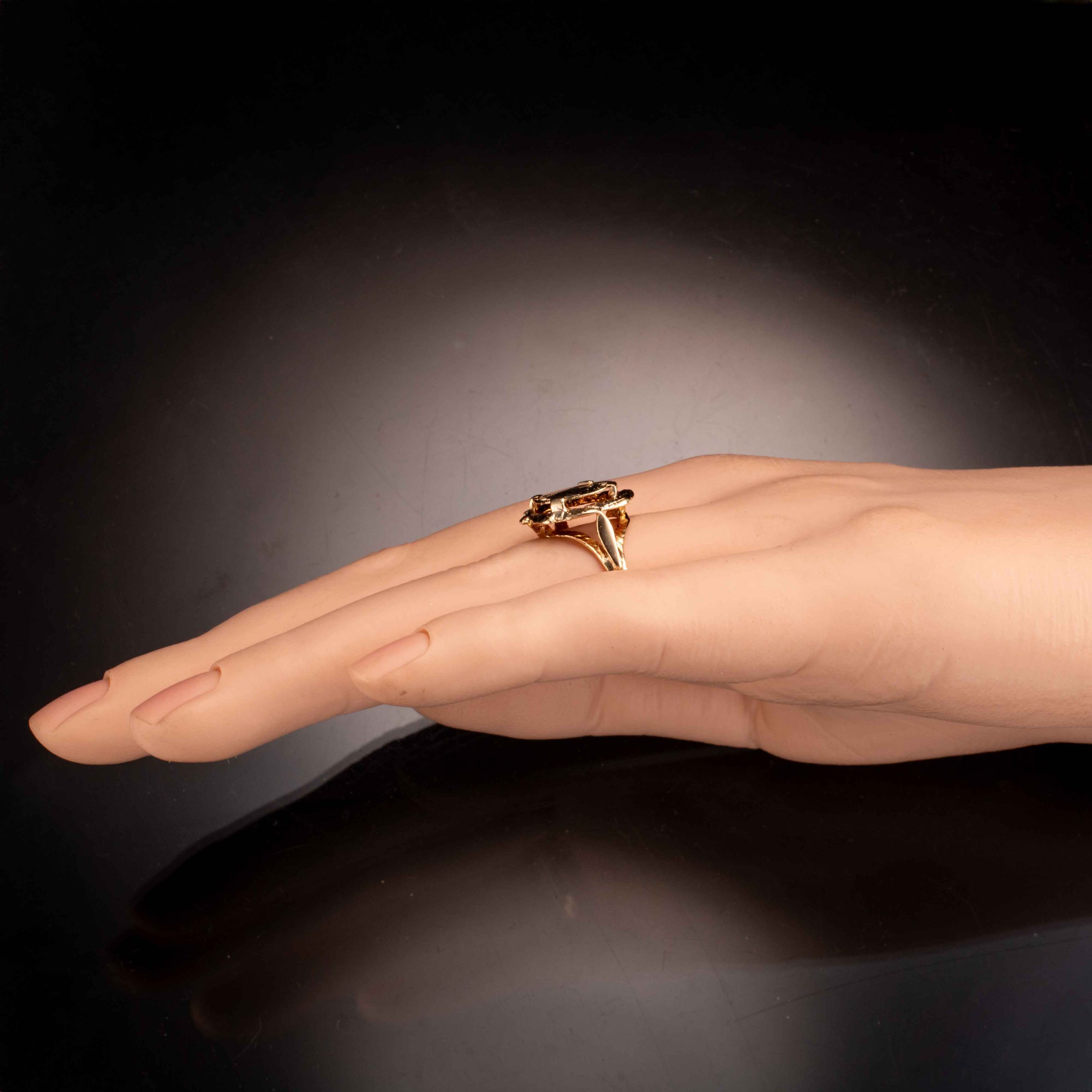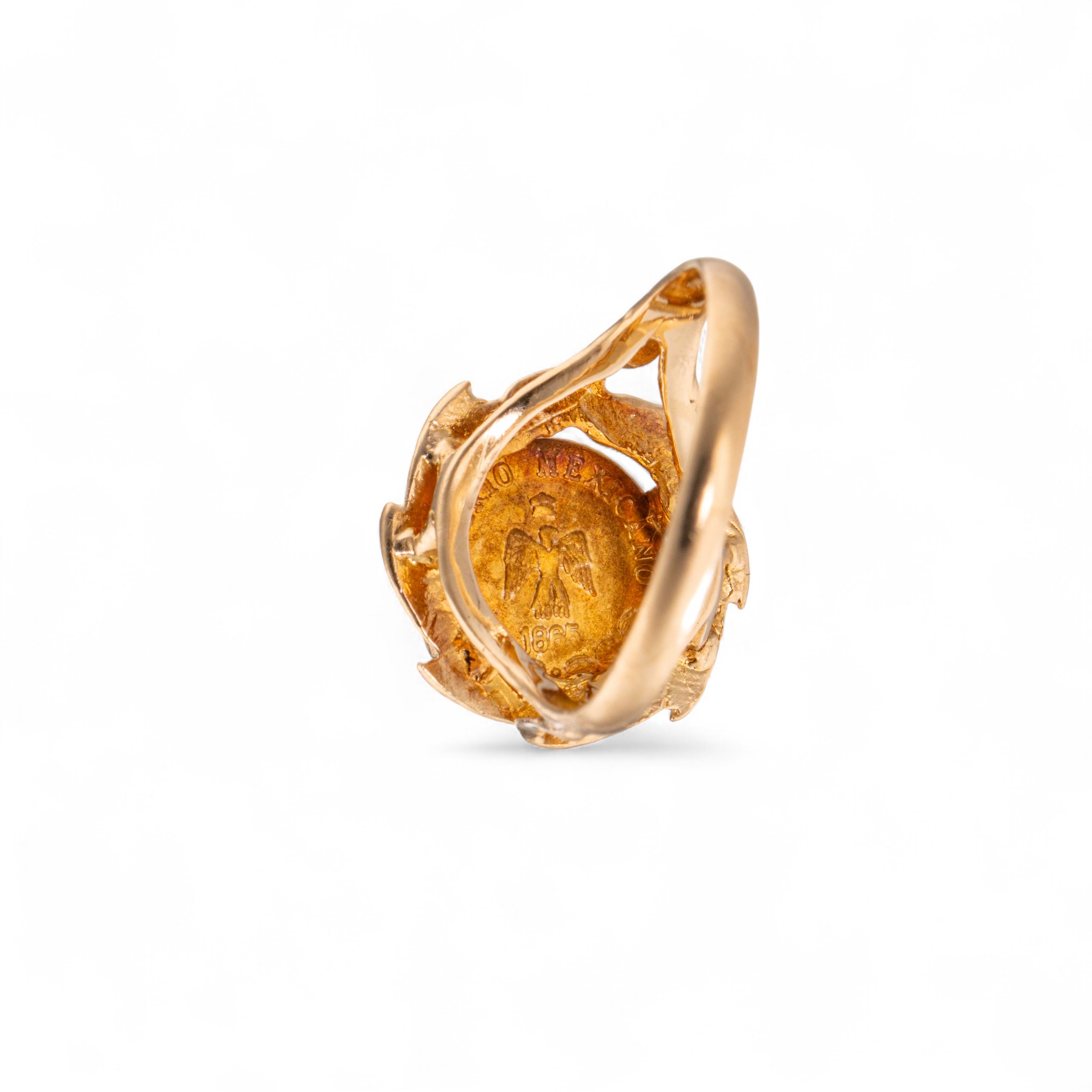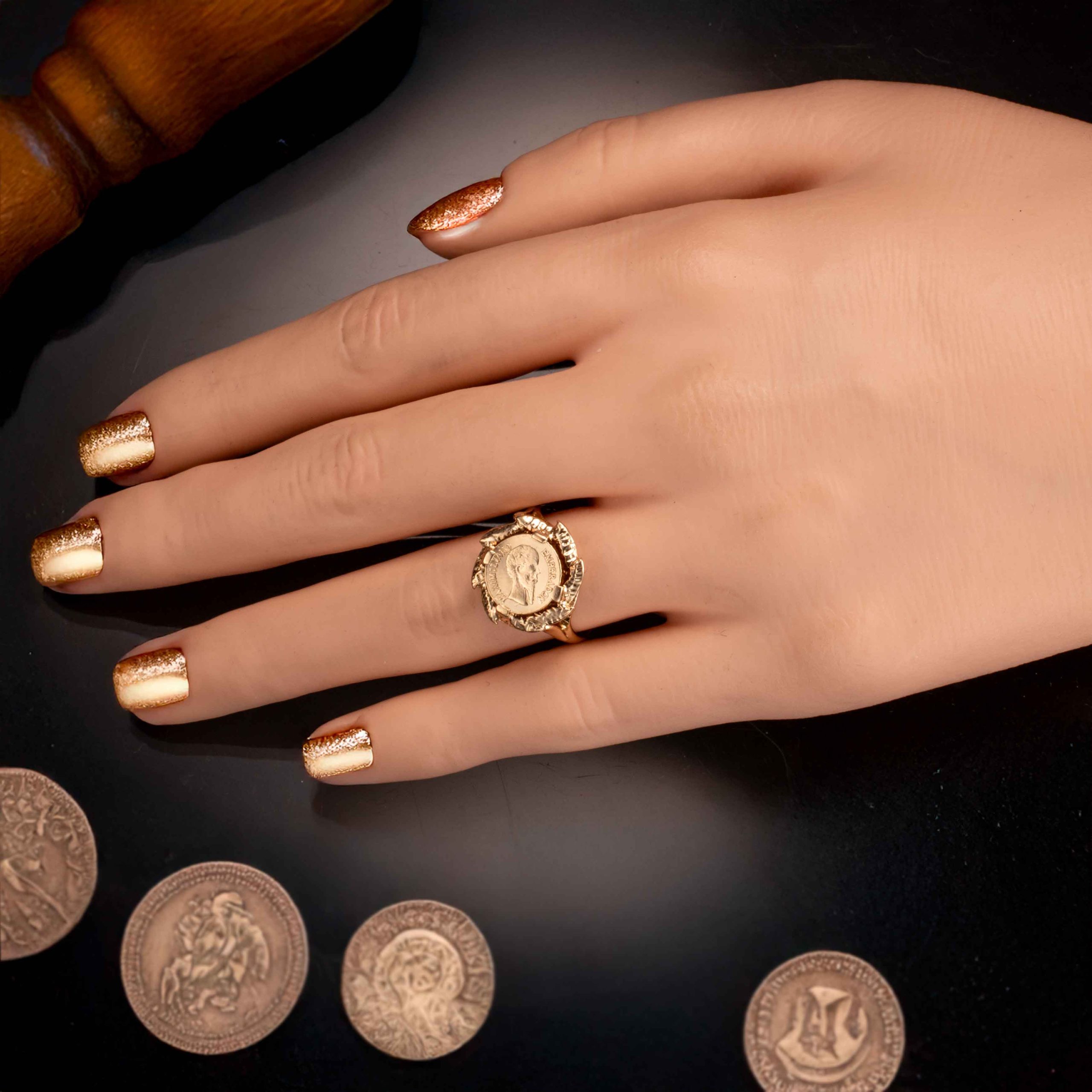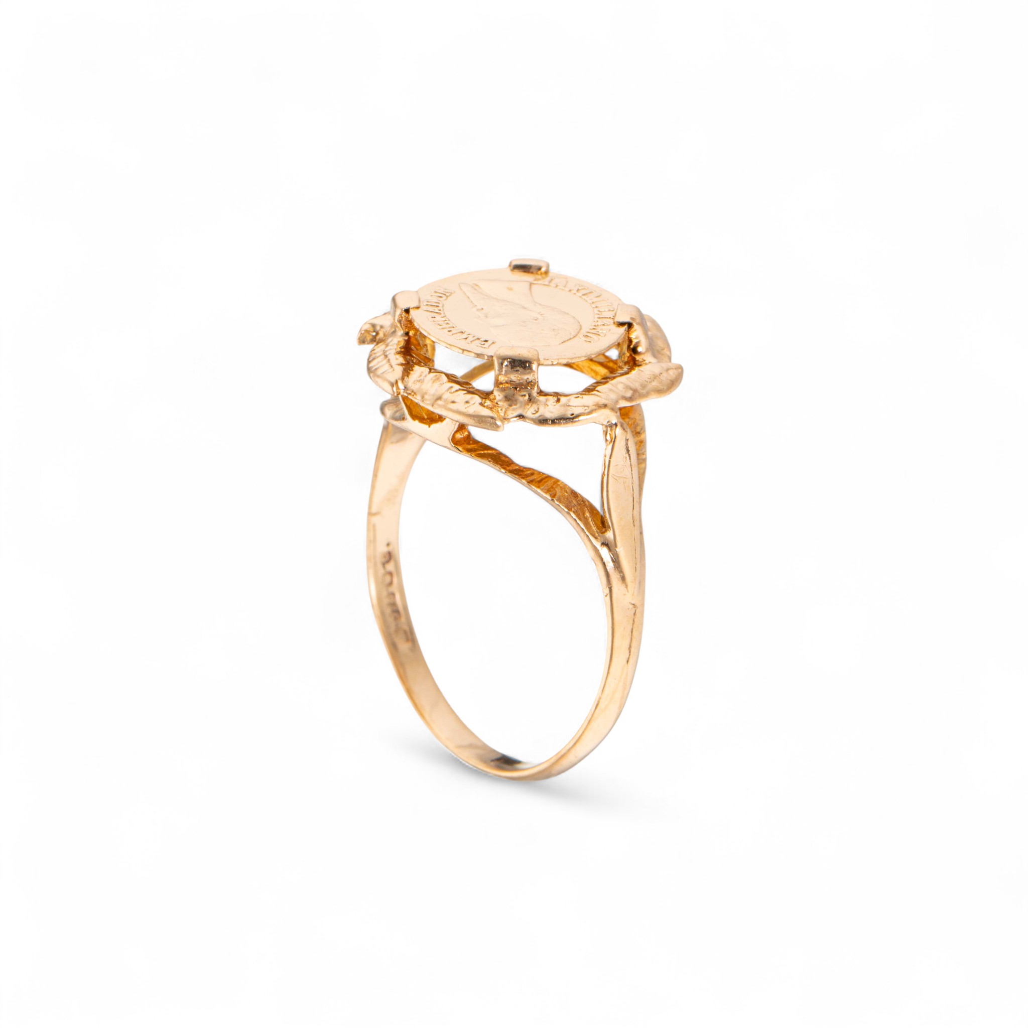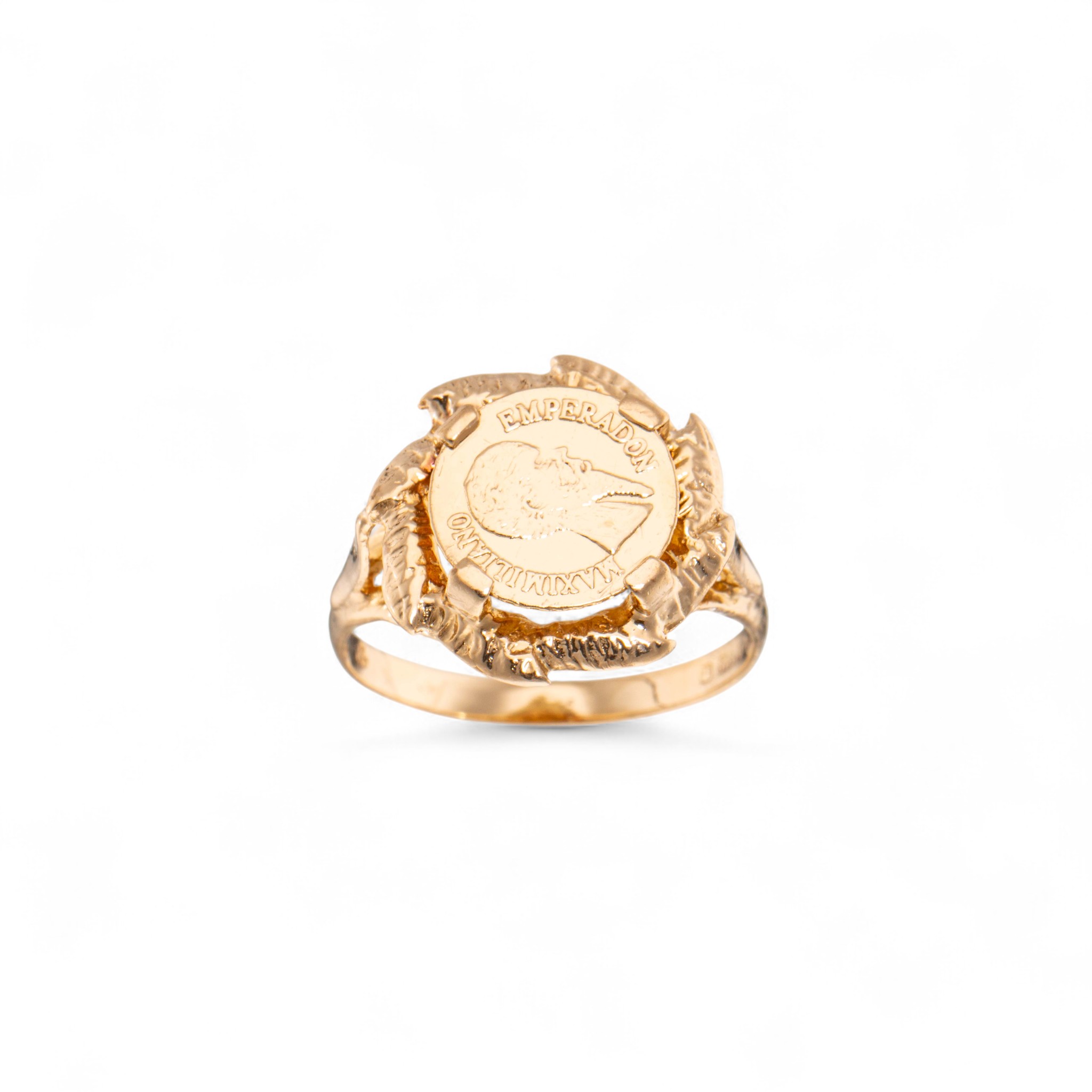 Ring i 9 karat gult gull. Signetflate laget med en moderne støping («restrike») av en peso gullmynt (også i 9 karat gull). Ansvarsmerket «MKJ». London. Årsmerket «C» for år 1977.