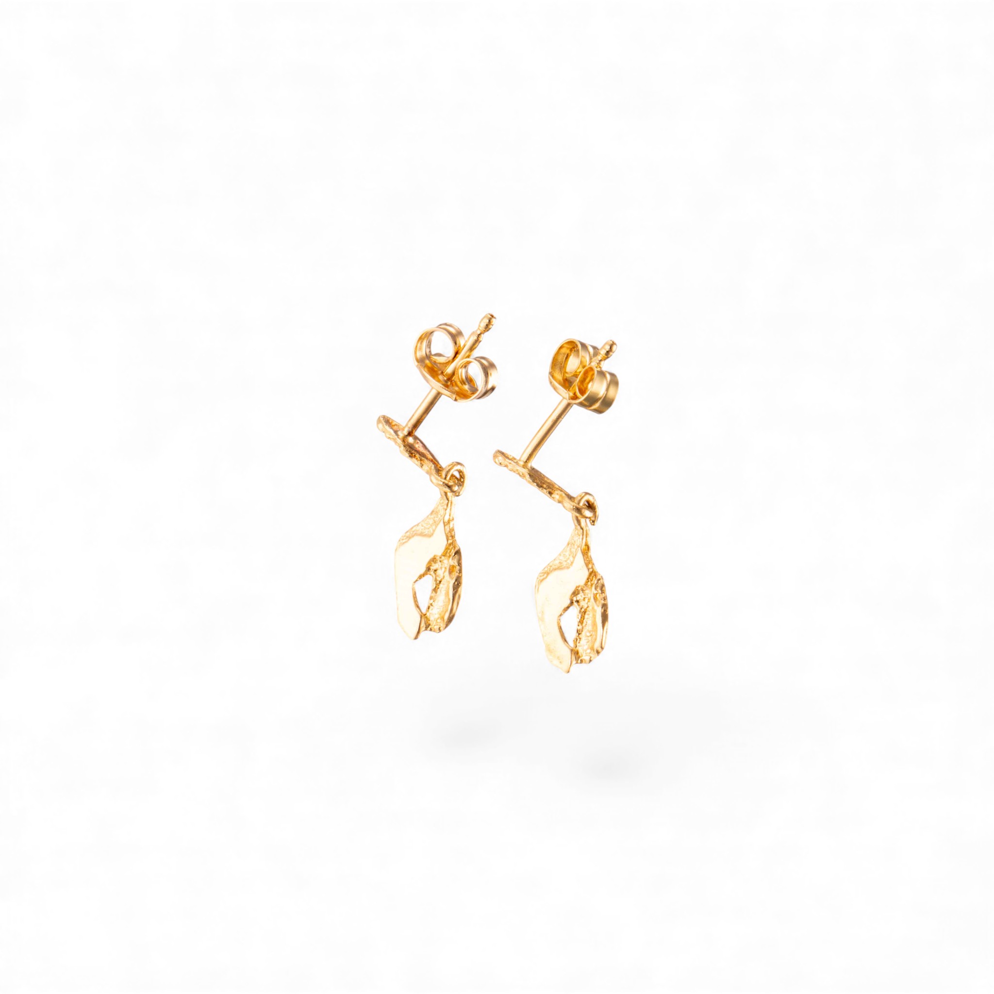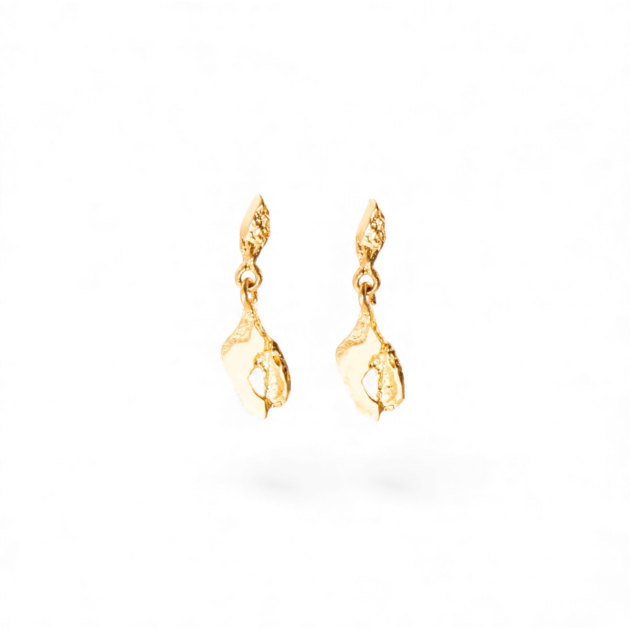 Øredobber med heng i 14 karat gult gull. Nugget-mønster. Noe ulike ørestoppere. Norge. 1900-tallets andre halvdel.