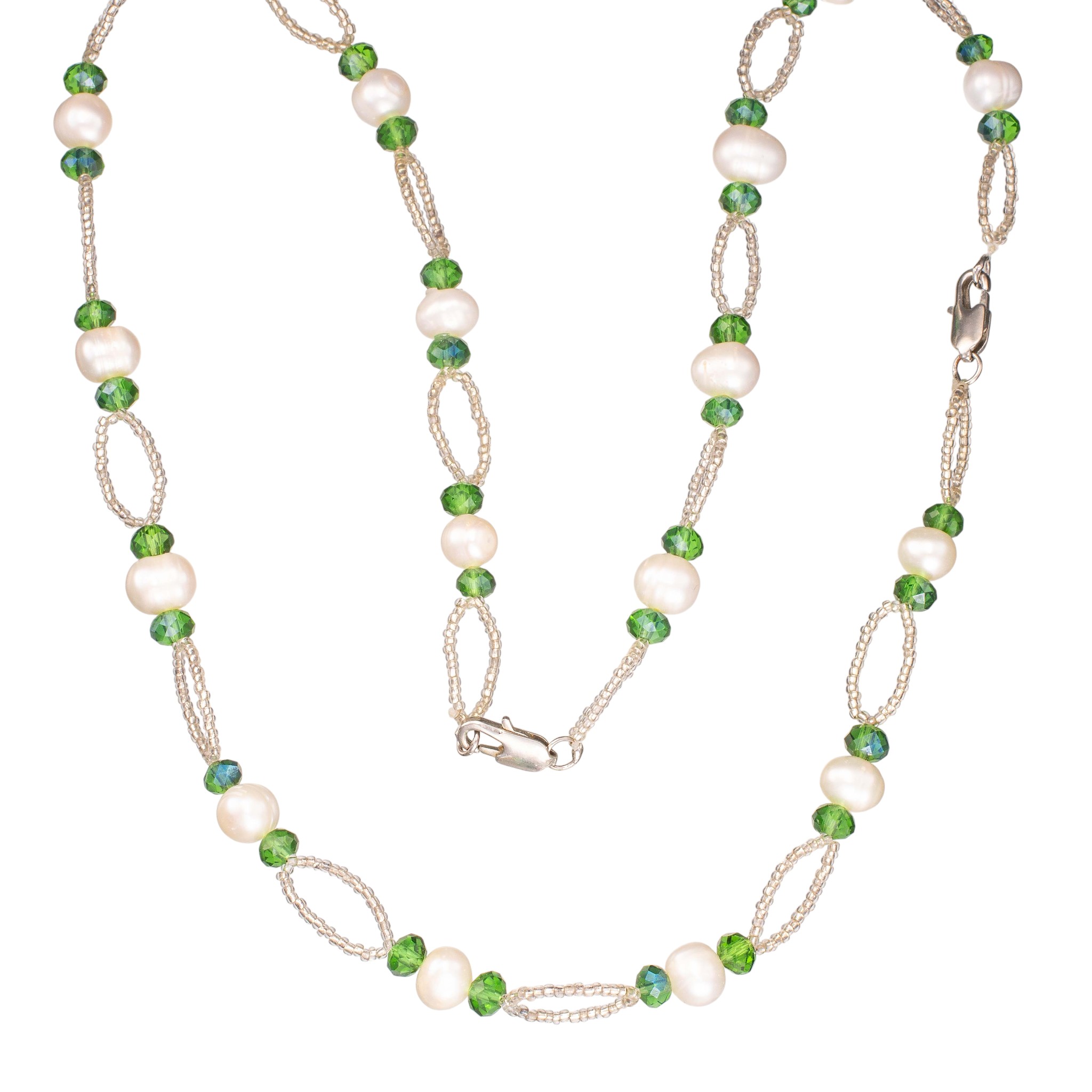 Bijouteri, sett: Perlekjede (armbånd + halskjede) med ekte, barokke perler og syntetiske smykkestener / detaljer. To karabinlåser i hvitt metall. 1900-tallets andre halvdel.