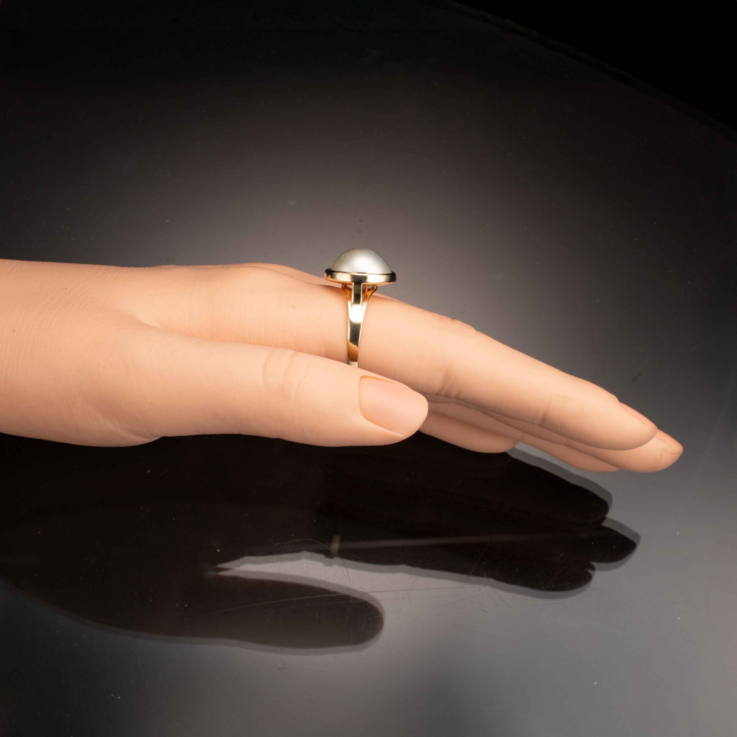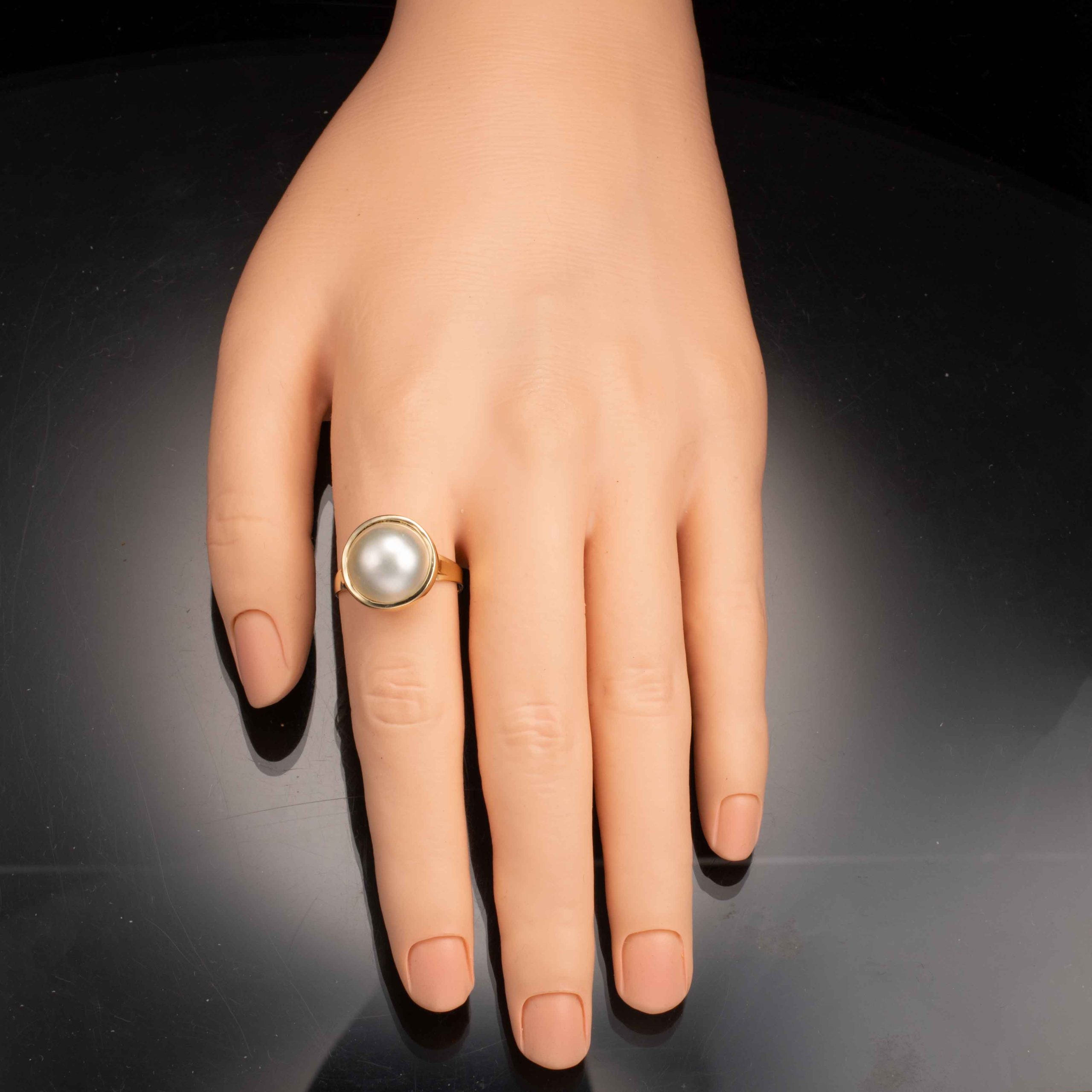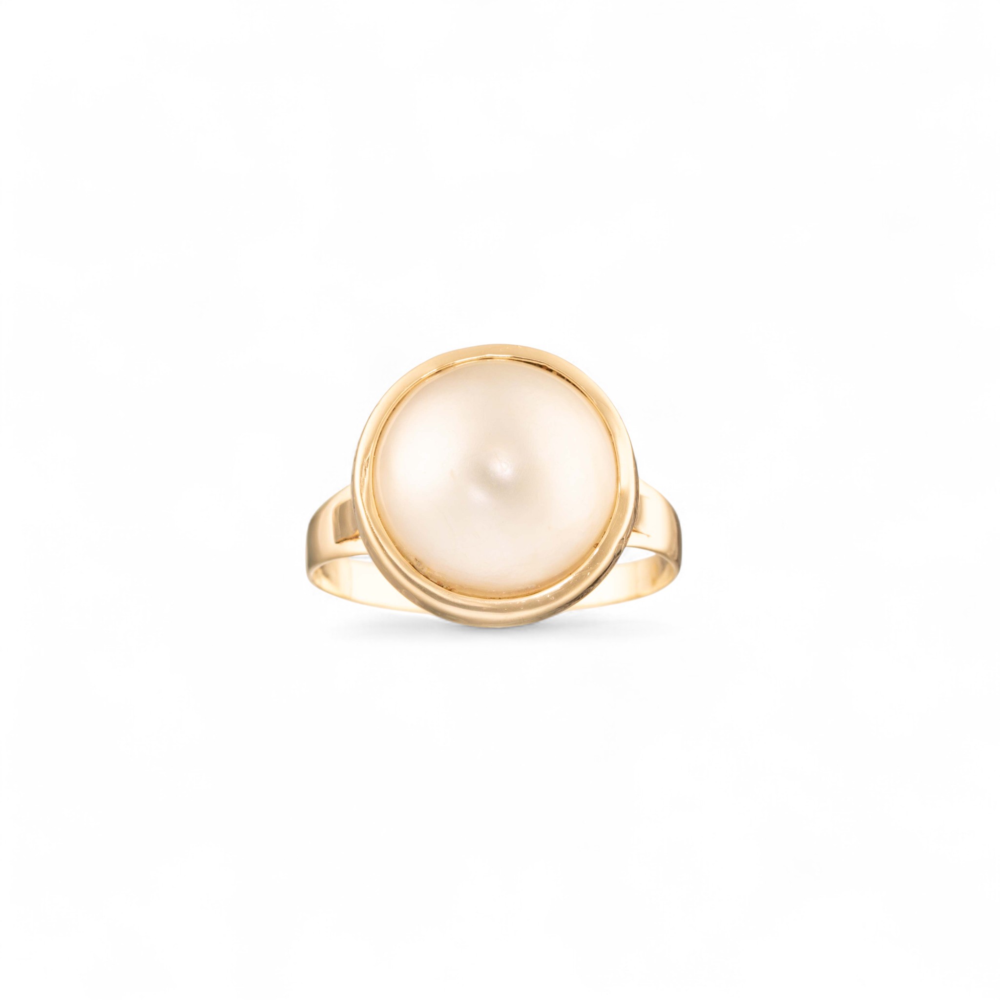 Ring i 14 karat gult gull fattet med mabè perle (D13 mm). Ansvarsmerket «OXO» for H. C Østrem’s Eftf. Oslo. 1900-tallets andre halvdel.