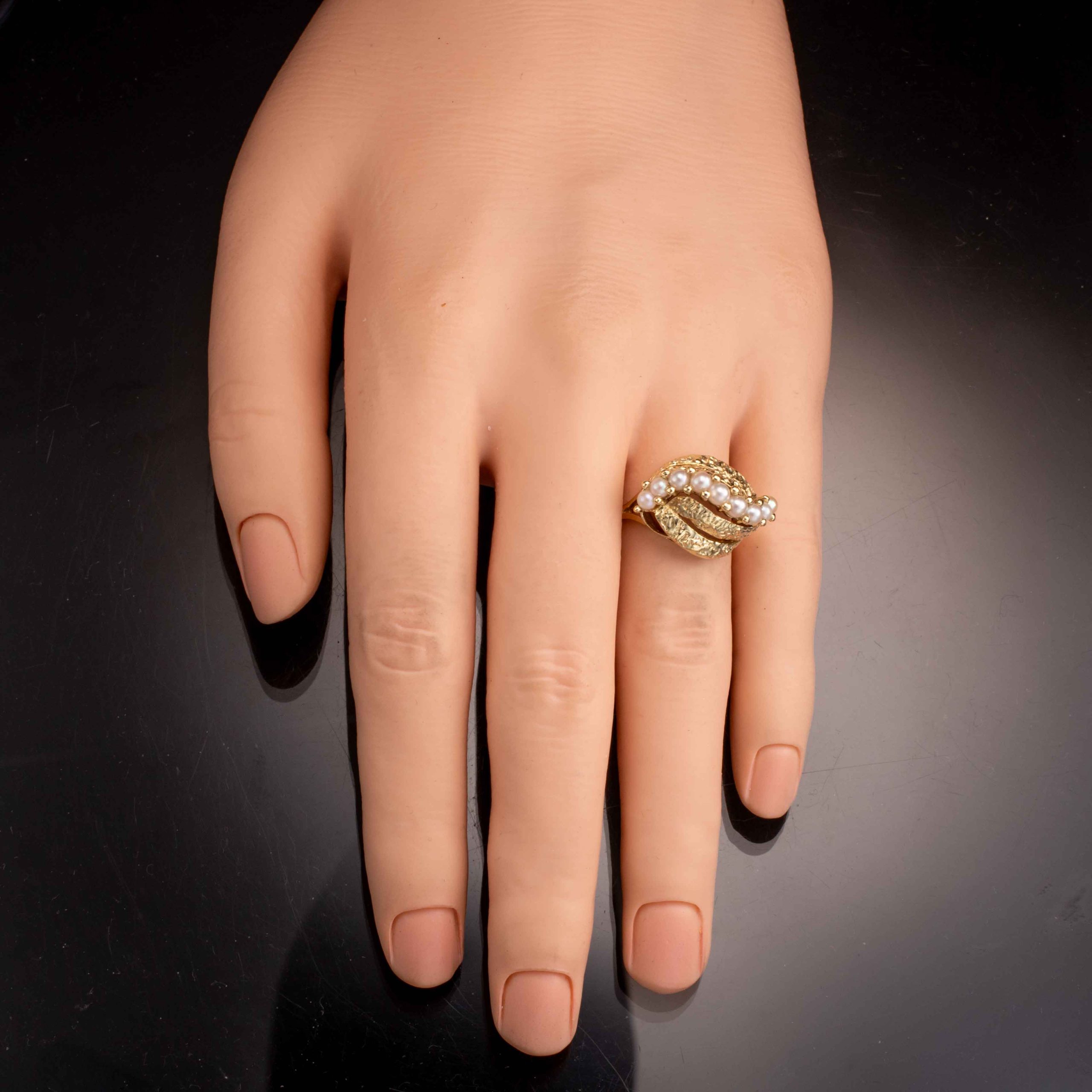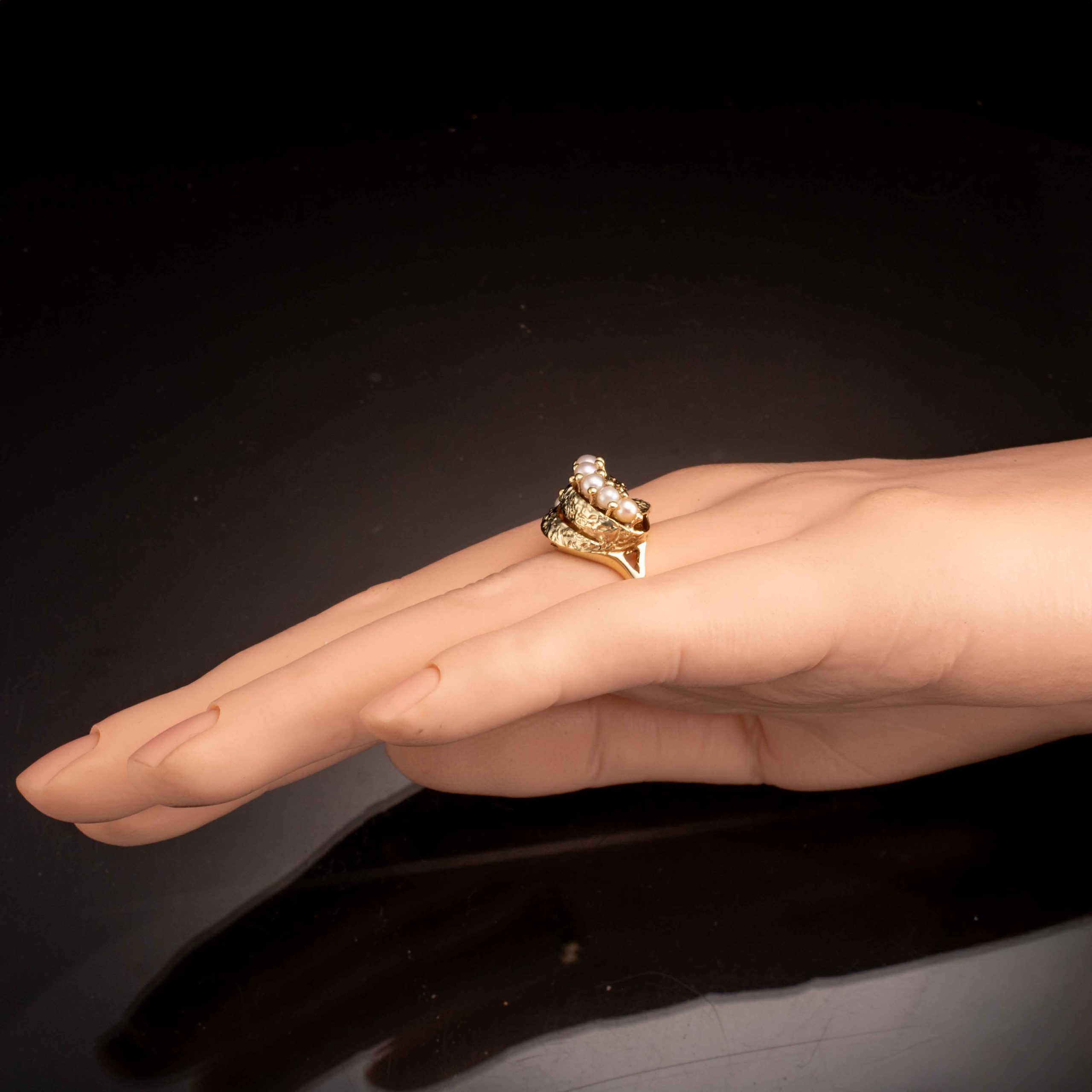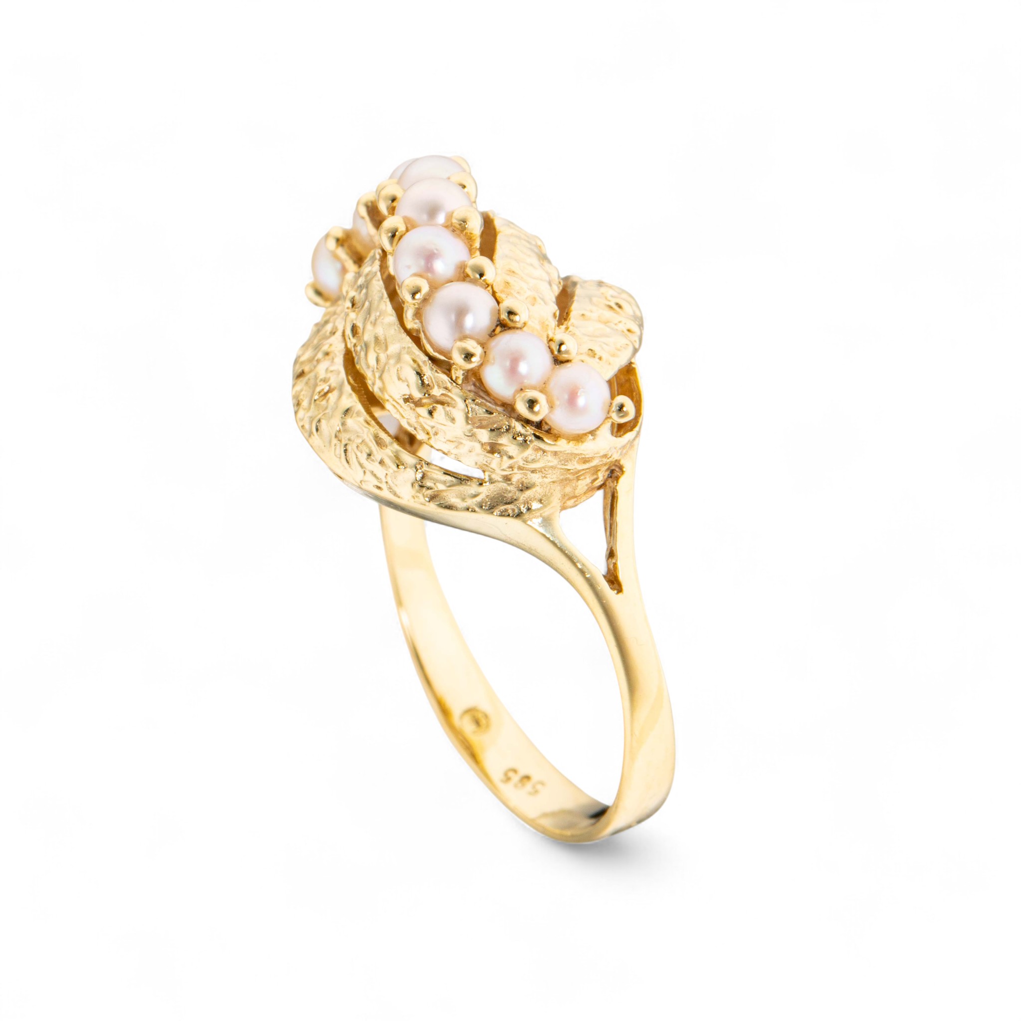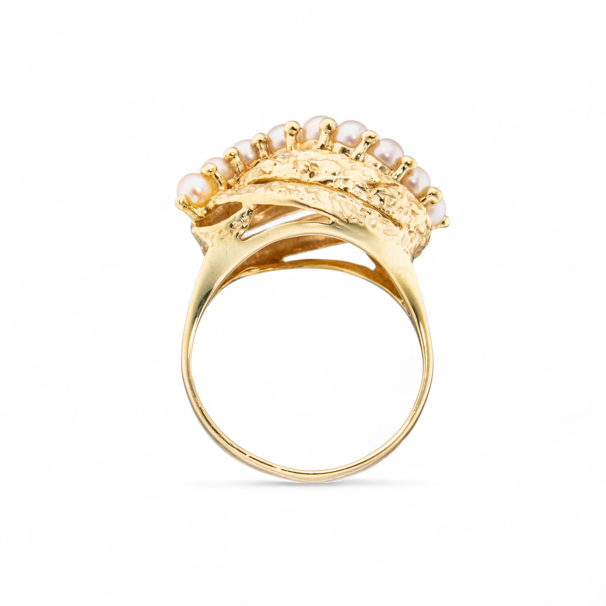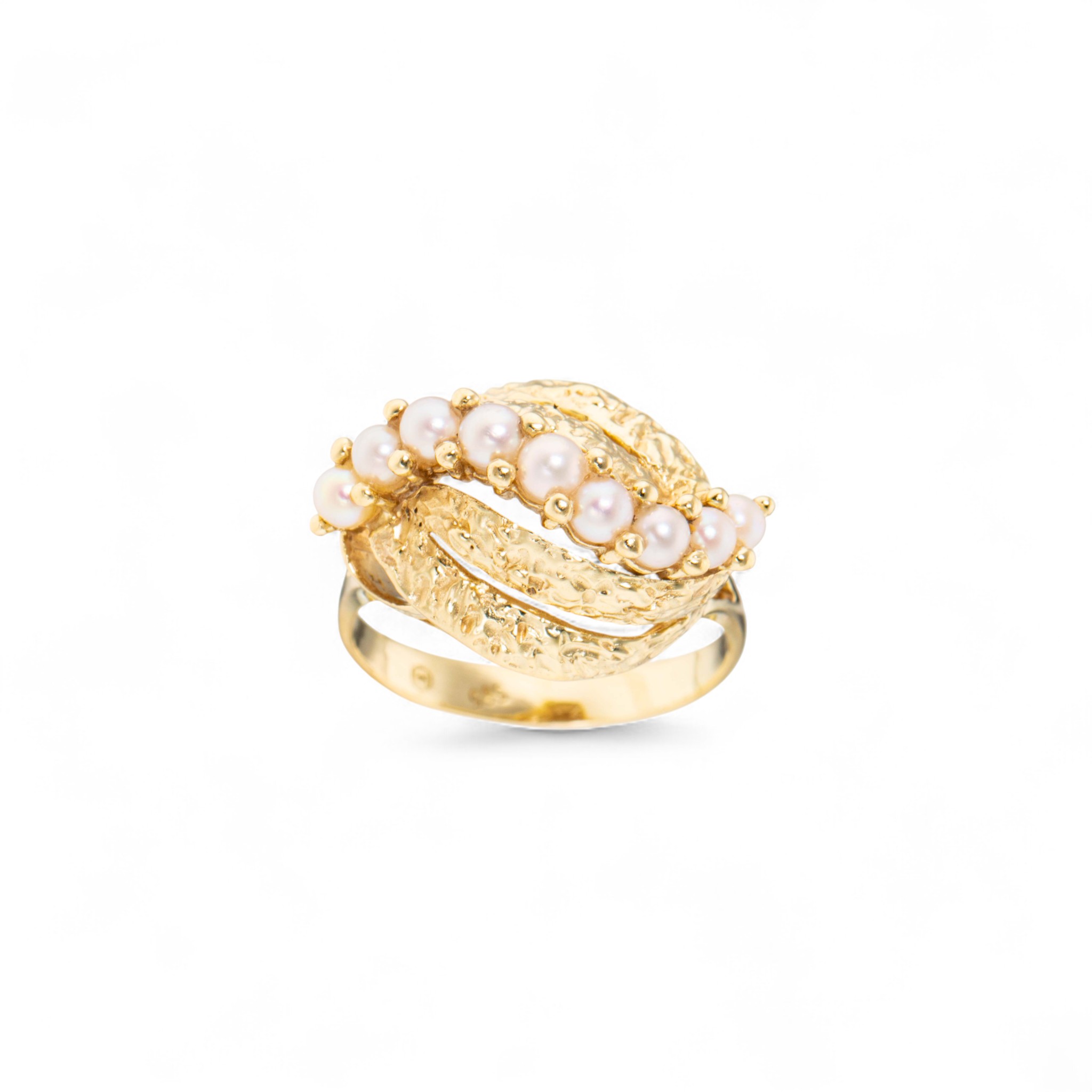 Ring i 14 karat gult gull med 9 perler (D~2,7 mm). Høy, mønstret krone. Ansvarsmerket for Ivar T. Holth. Oslo. 1900-tallets andre halvdel.