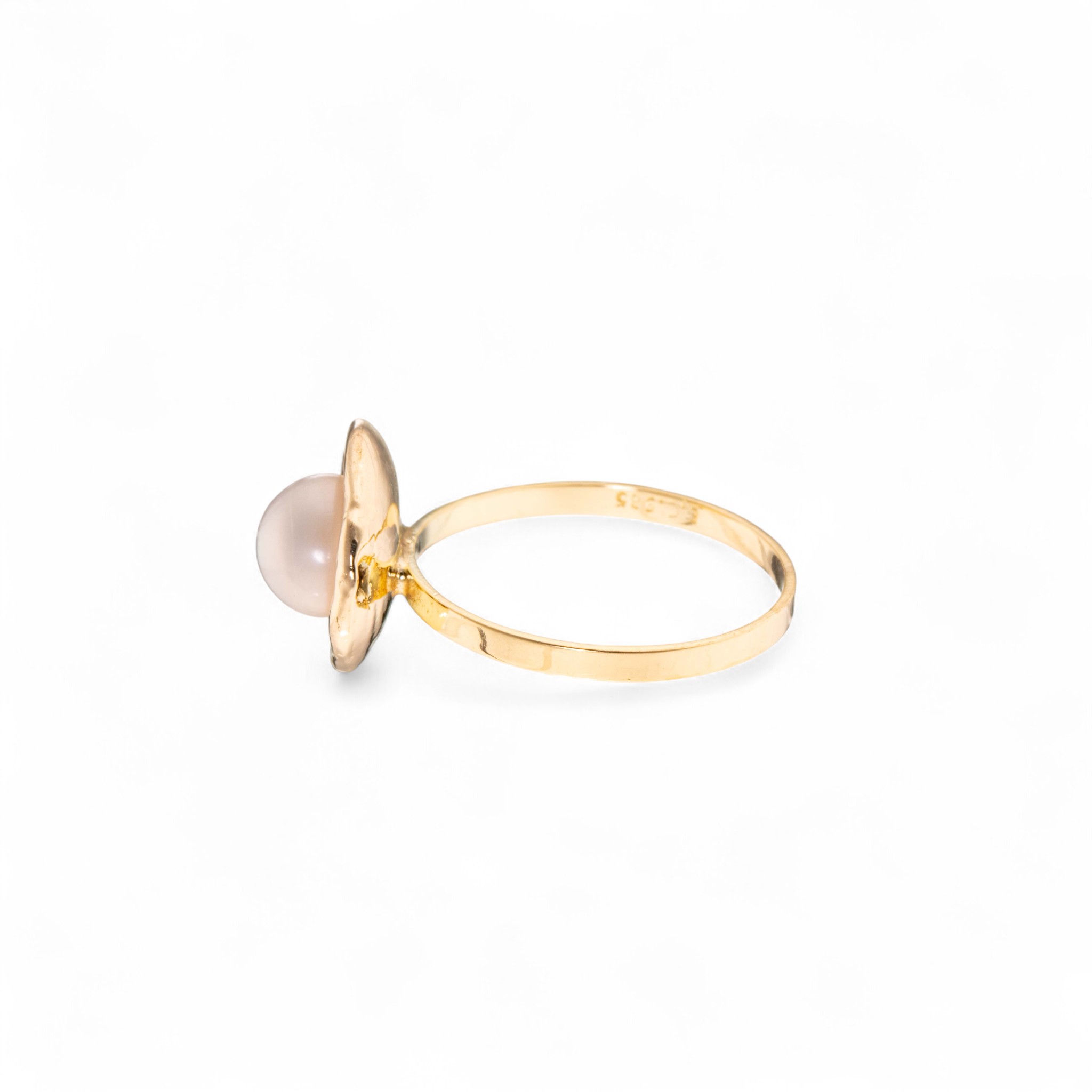 Ring i 14 karat gult gull med gråtonet perle (D6,36 mm) på glatt krone i organisk utførelse. Ansvarsmerket «E.C» for E. Christophersen. Sandnes. 1900-tallets andre halvdel.