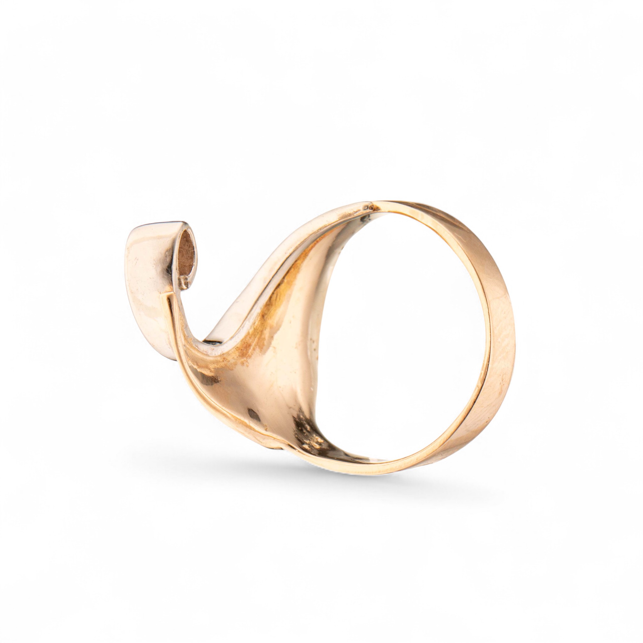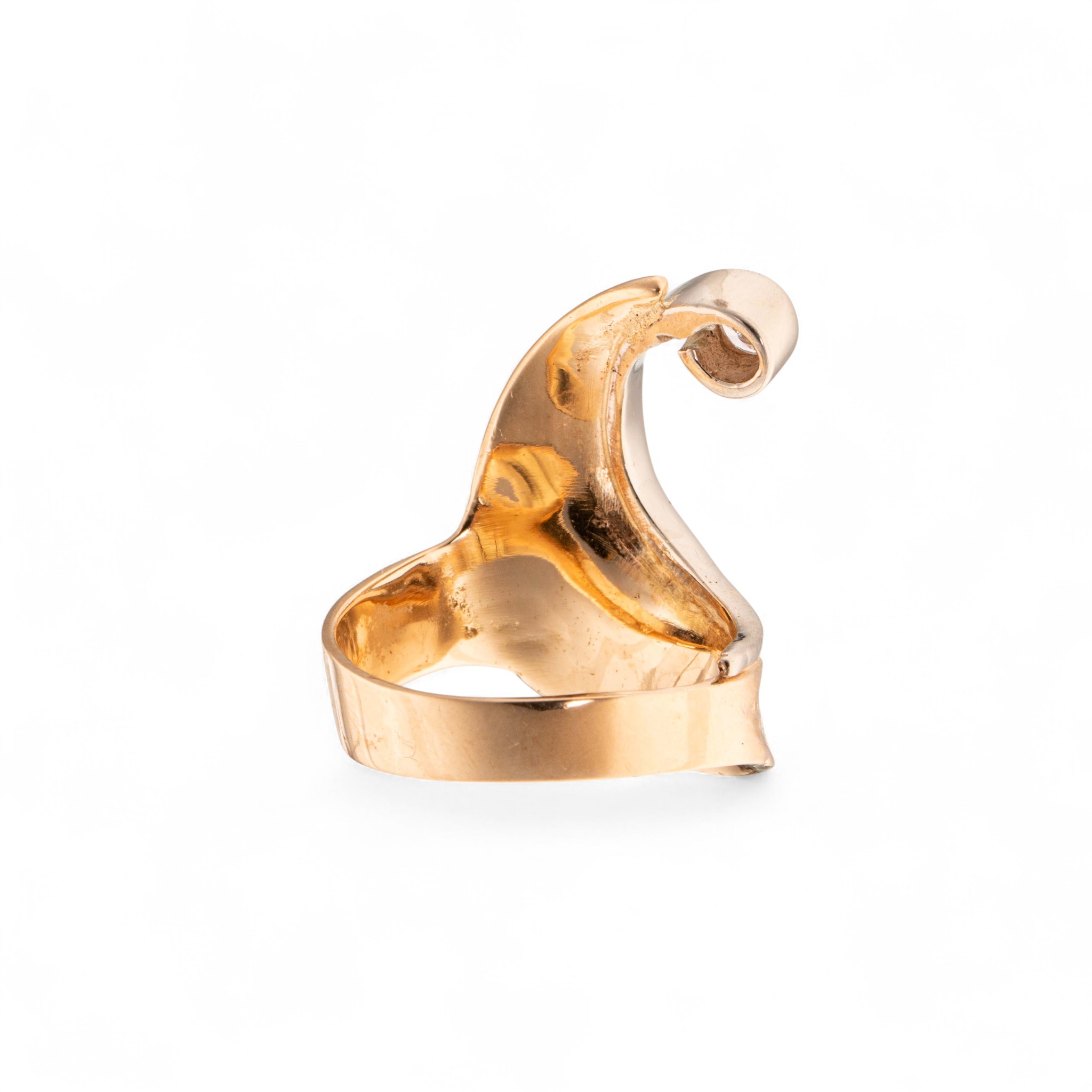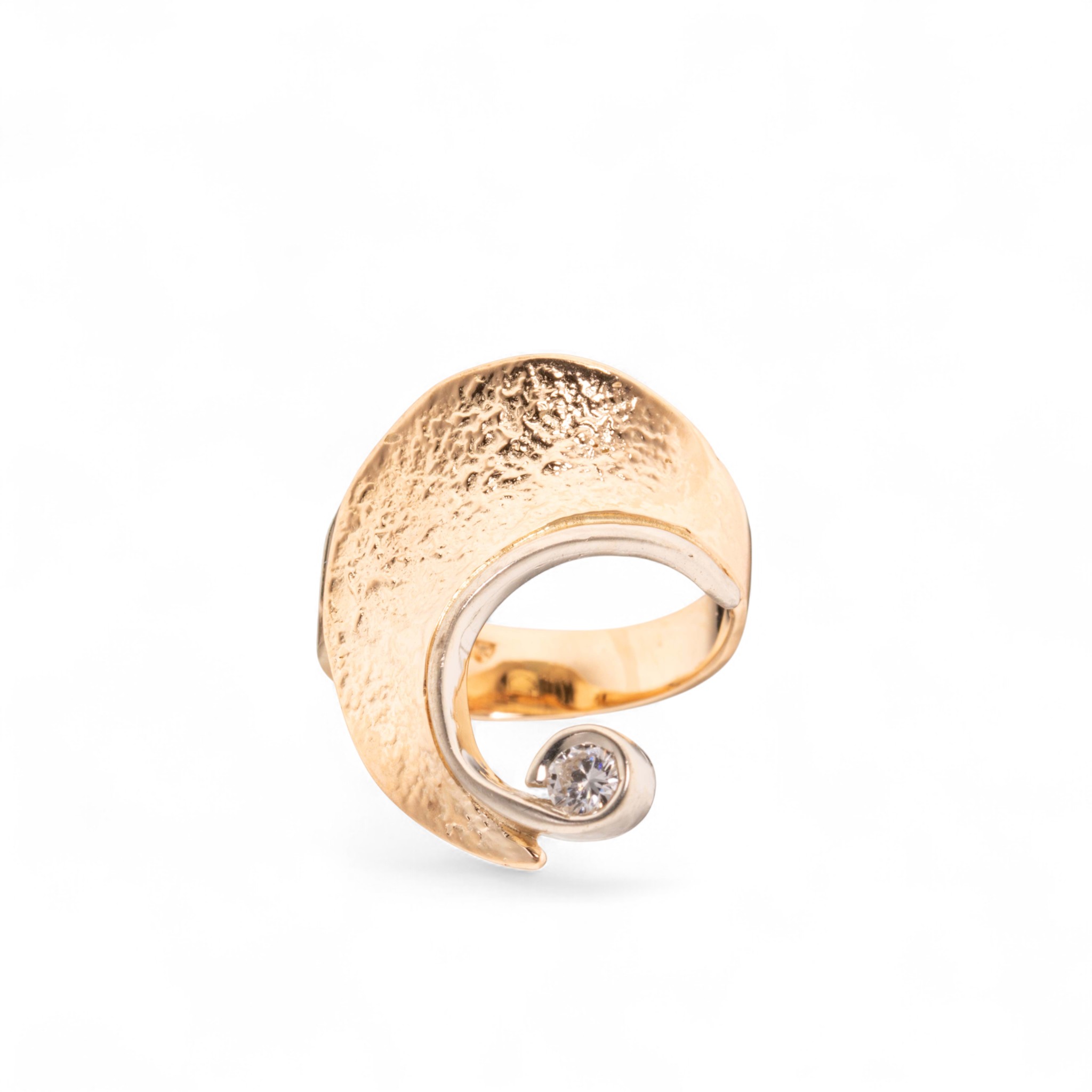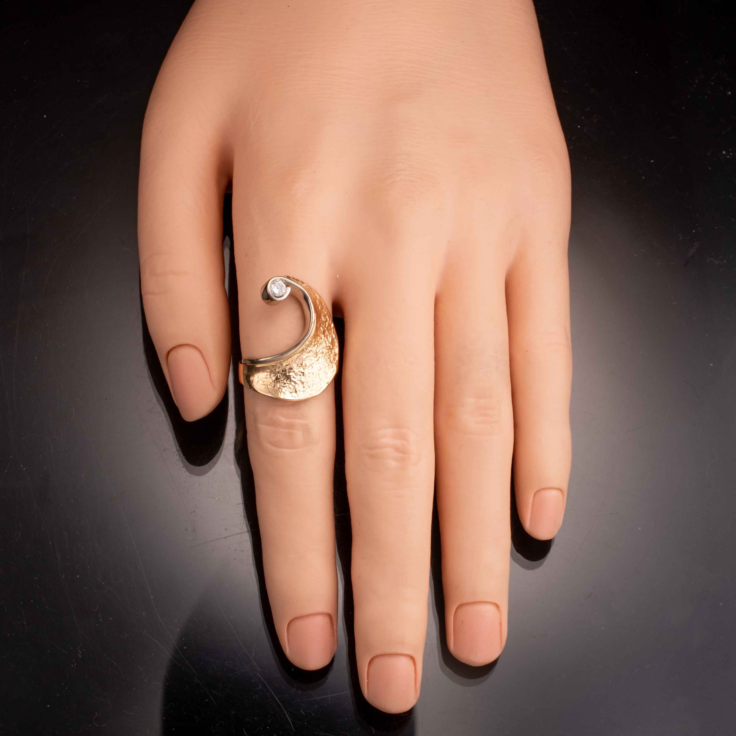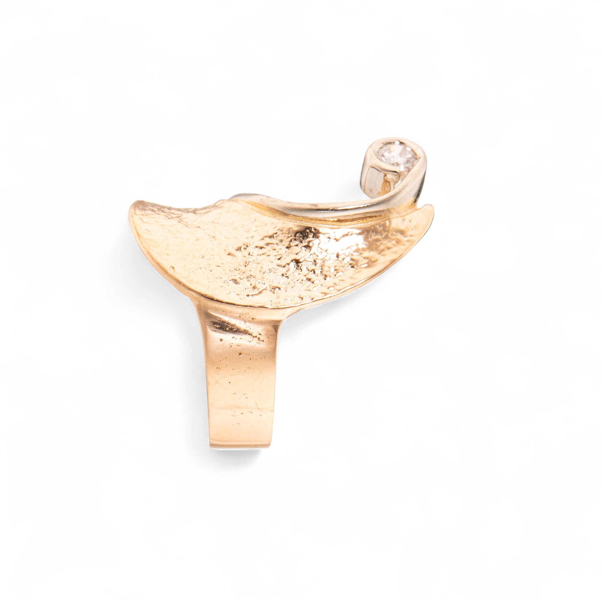 Ring i 14 karat hvitt og gult gull. Fattet med diamant (ca. 0,20 ct.) på enden av lang utstikker. Mønstret flate. Ansvarsmerket «GM» for «Gullmakeren», Bergen (I dag kjent som «Van Bergen»). Sent 1900- til tidl. 2000-tallet.