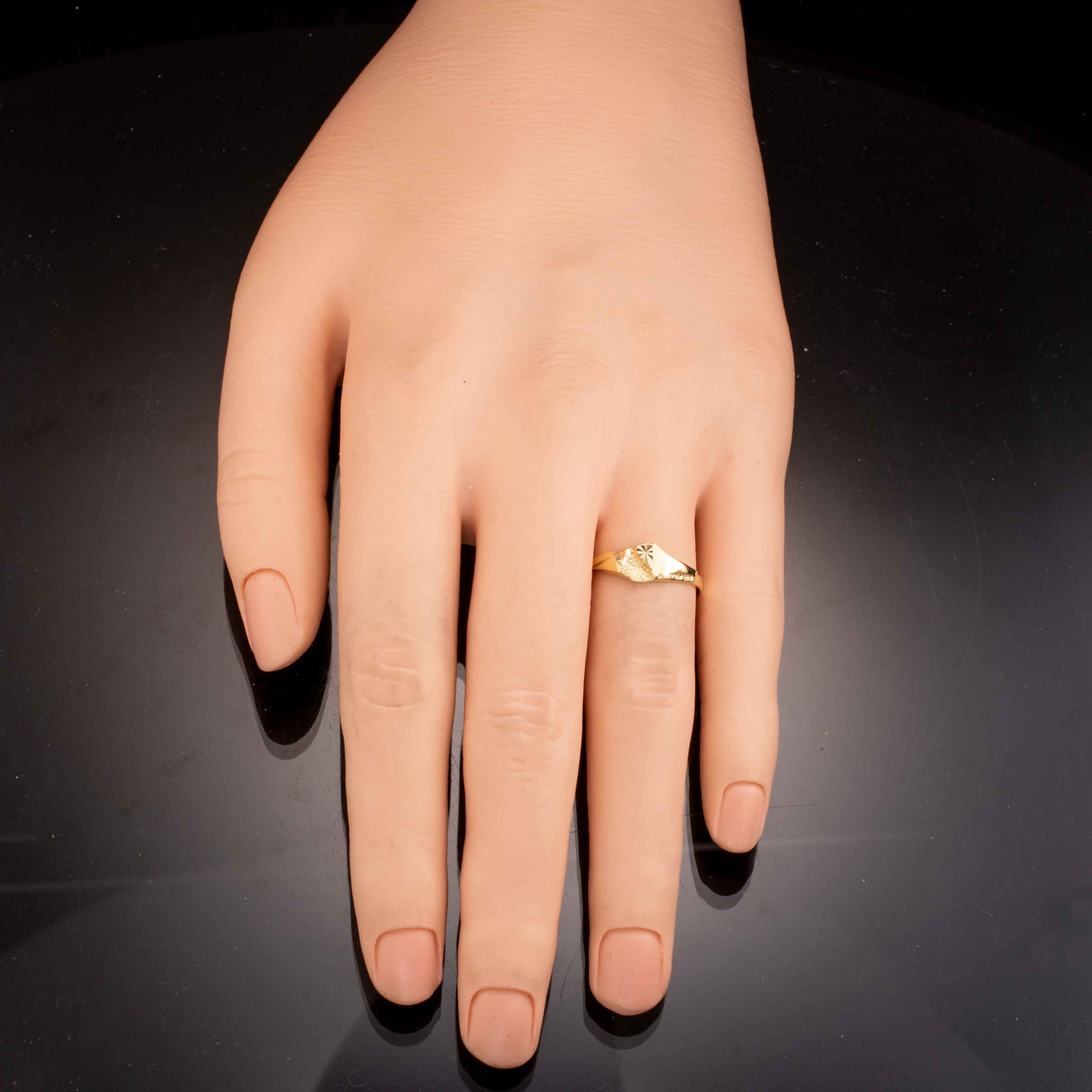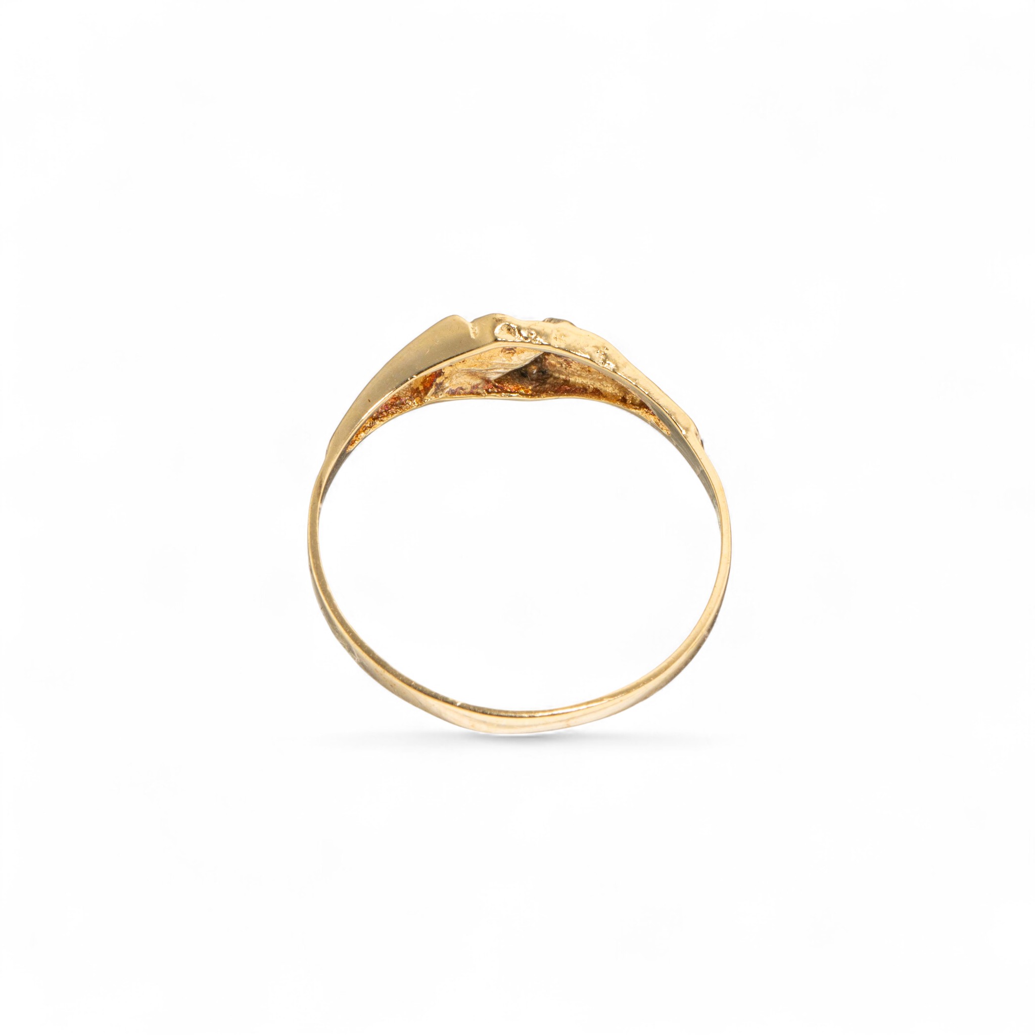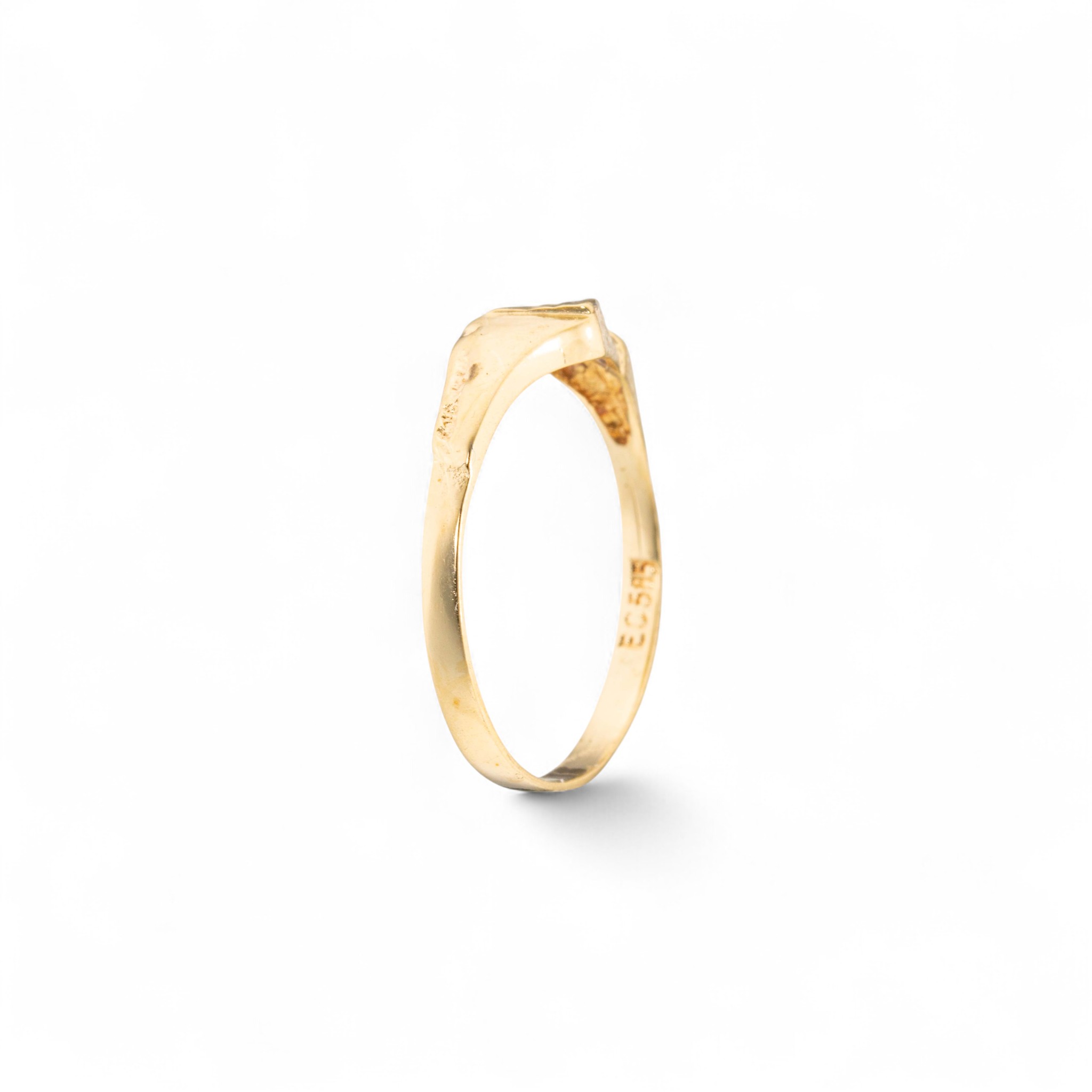 Ring i 14 karat gult gull. Nugget-mønster. Ansvarsmerket “EC” for E. Christophersen. Sandnes. 1900-tallets andre halvdel.