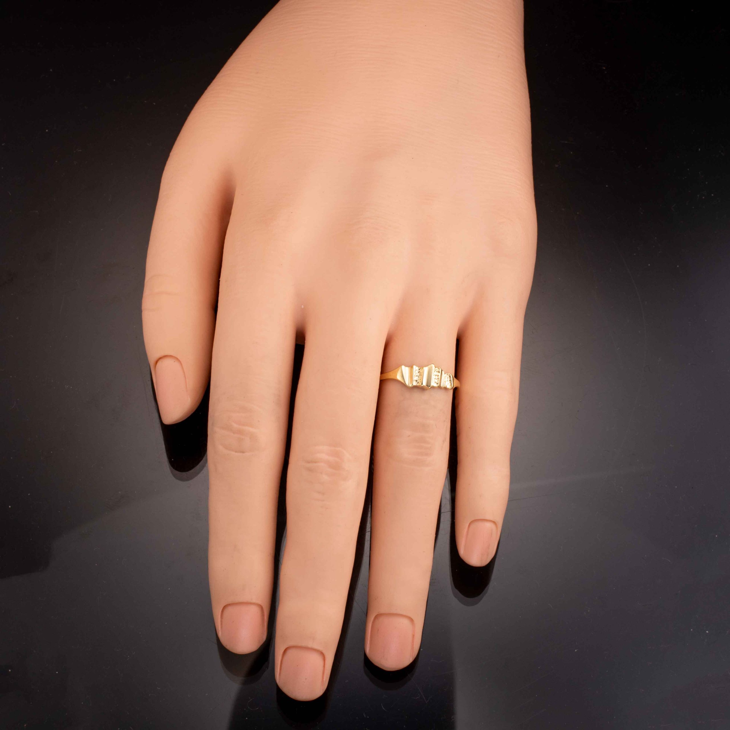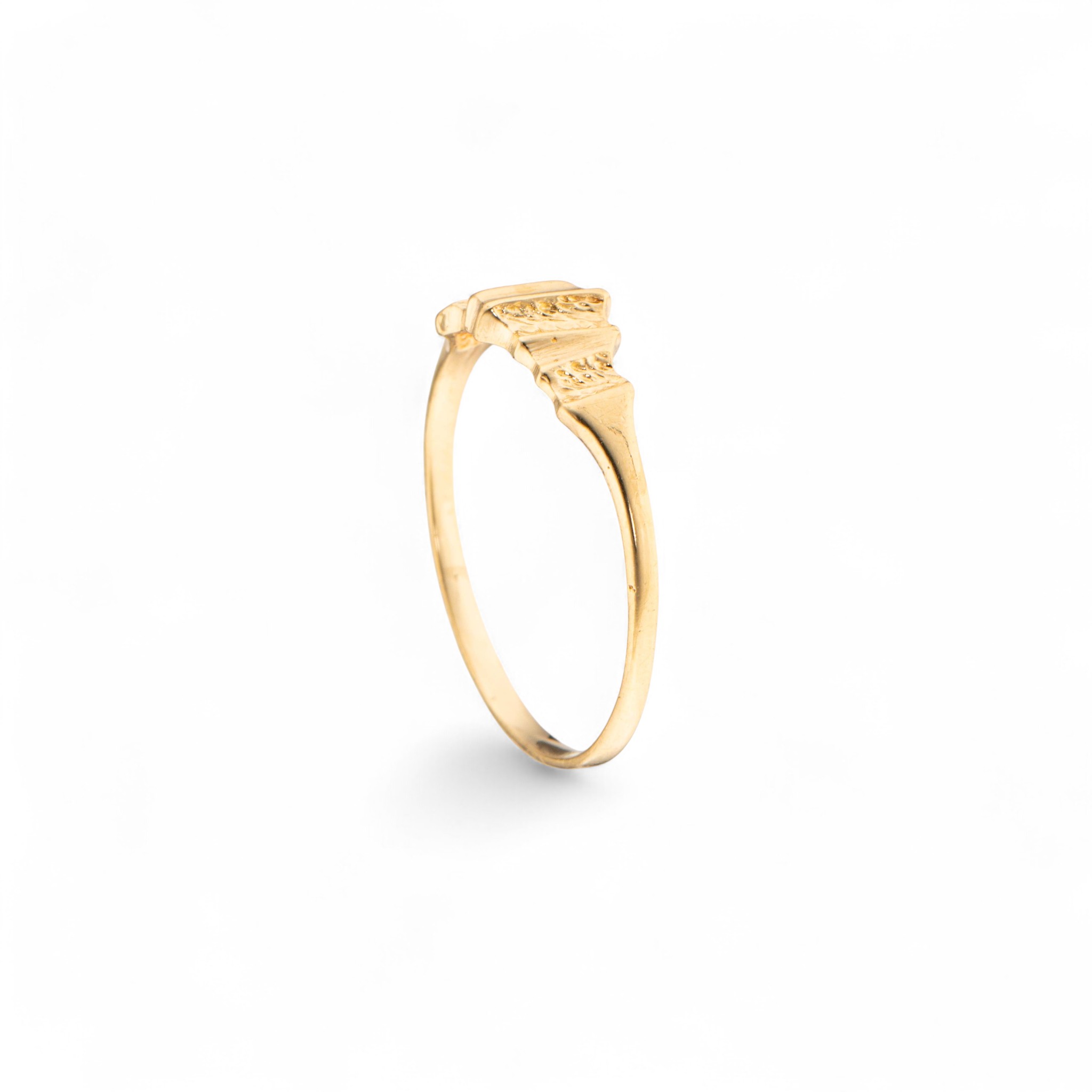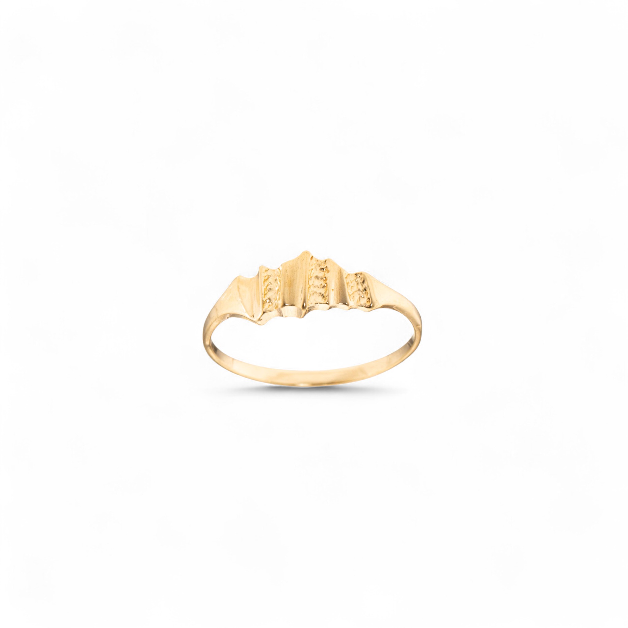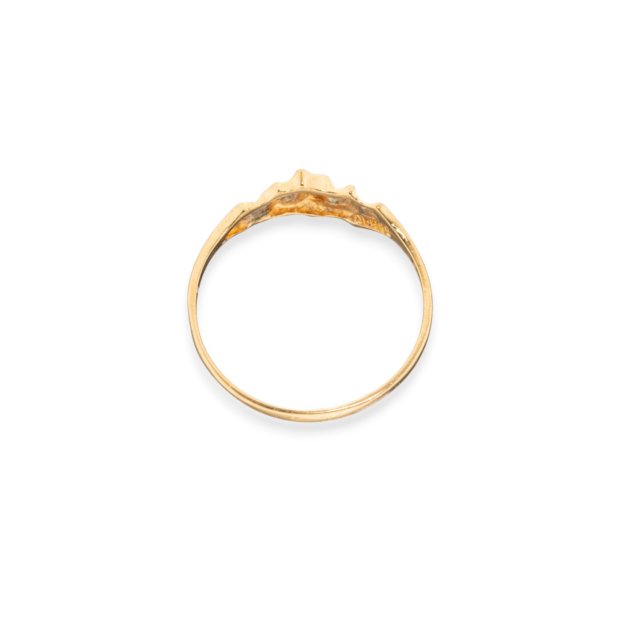 Ring i 14 karat gult gull. Mønstret senter. Ansvarsmerket «OP» for Olav Petersheim. Brumunddal. 1900-tallets andre halvdel.