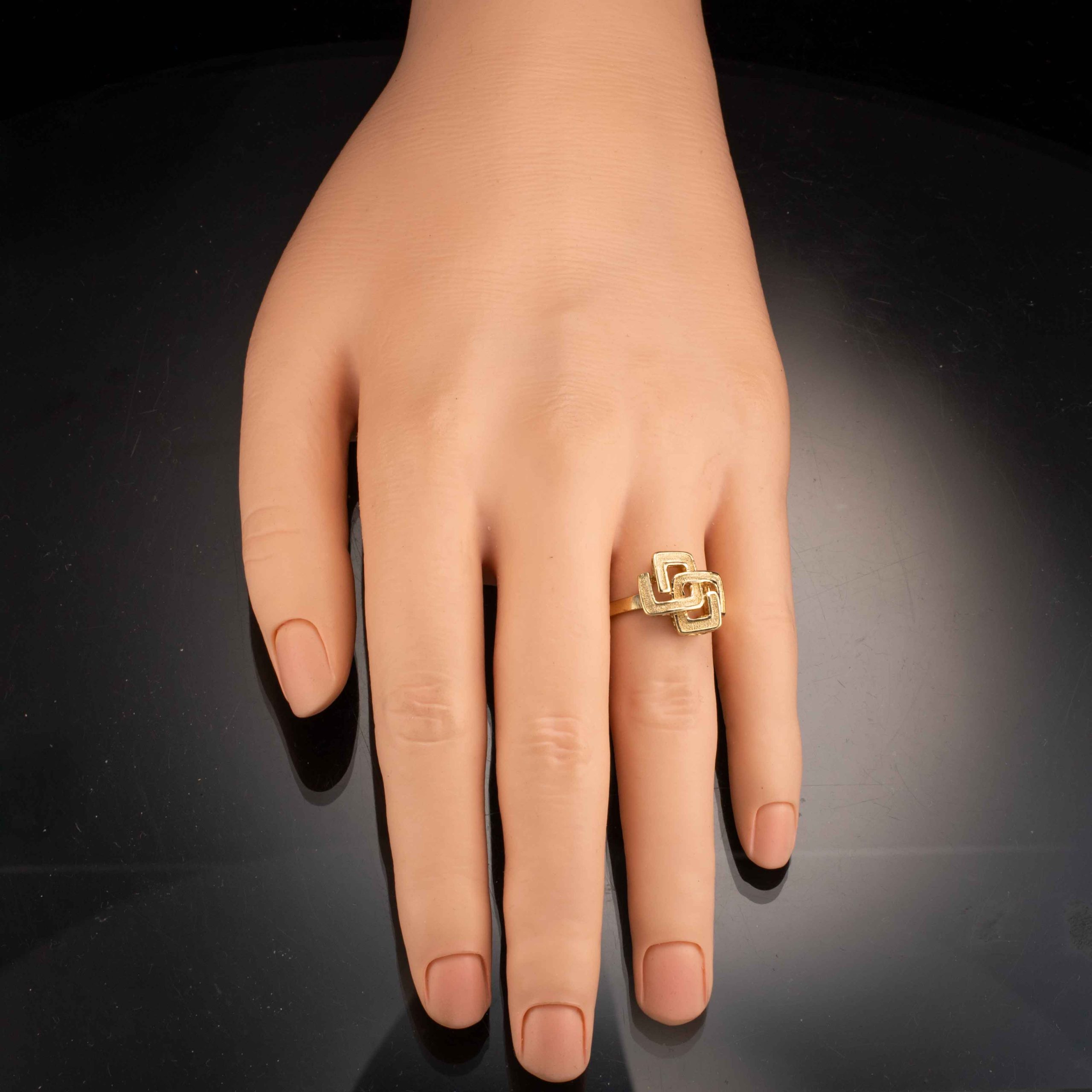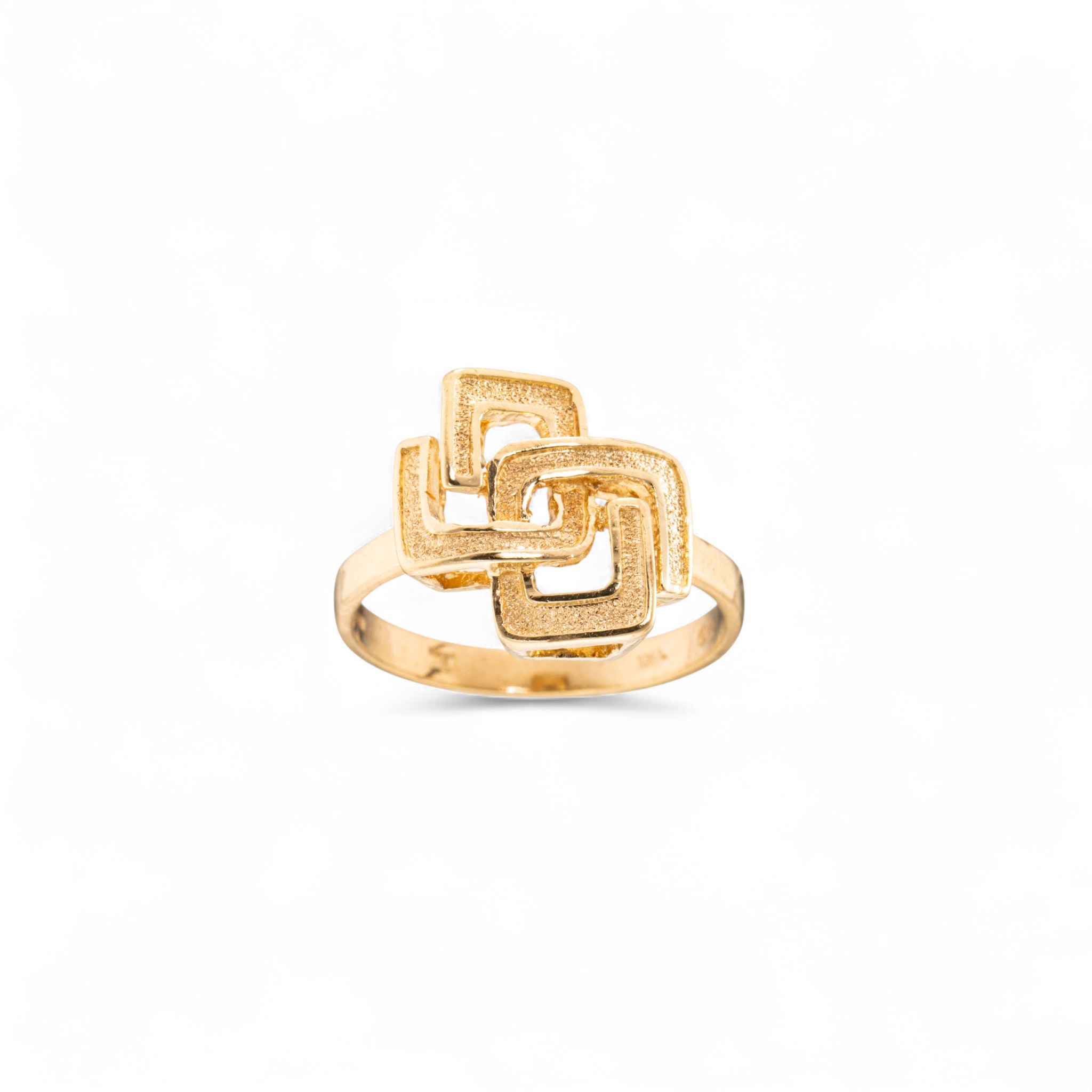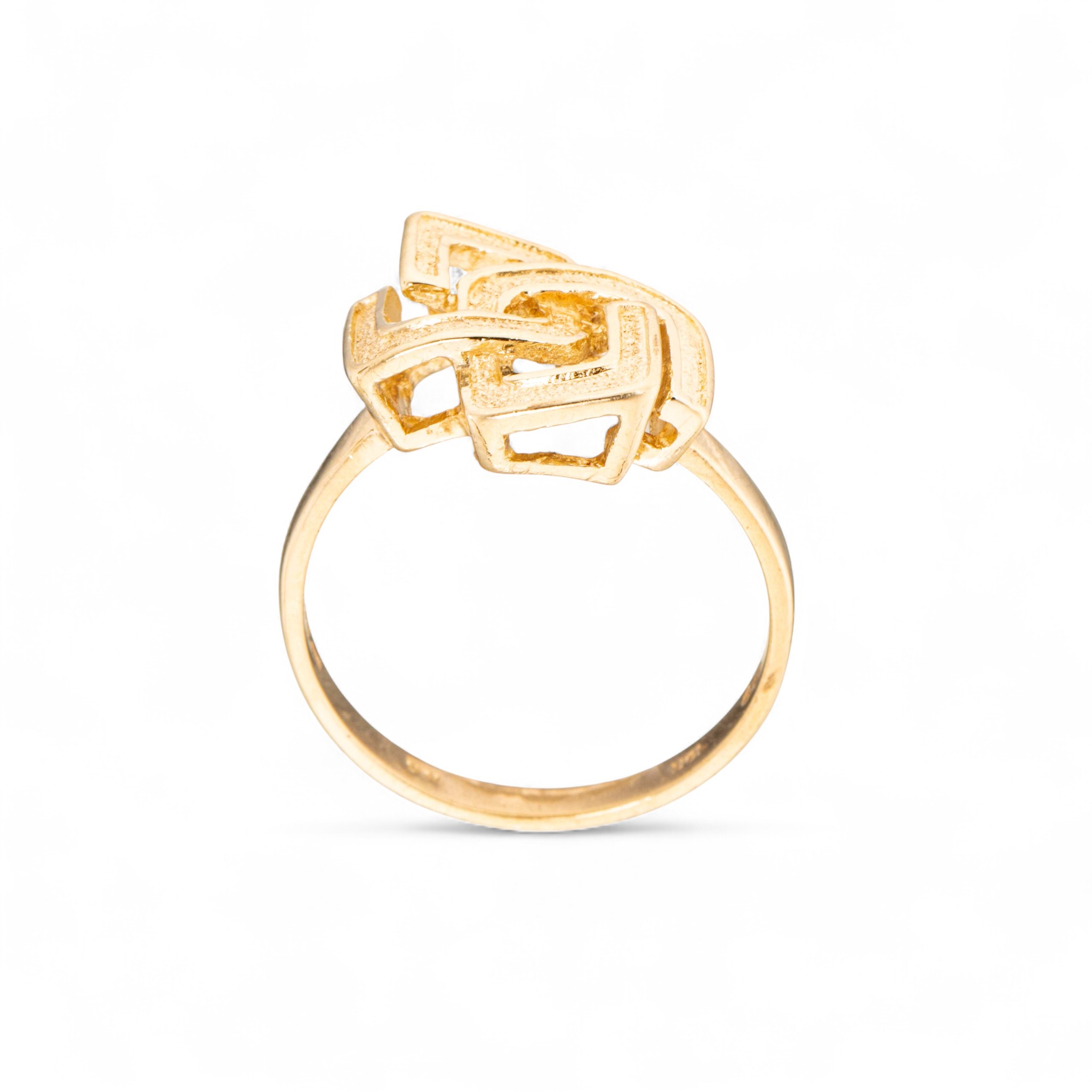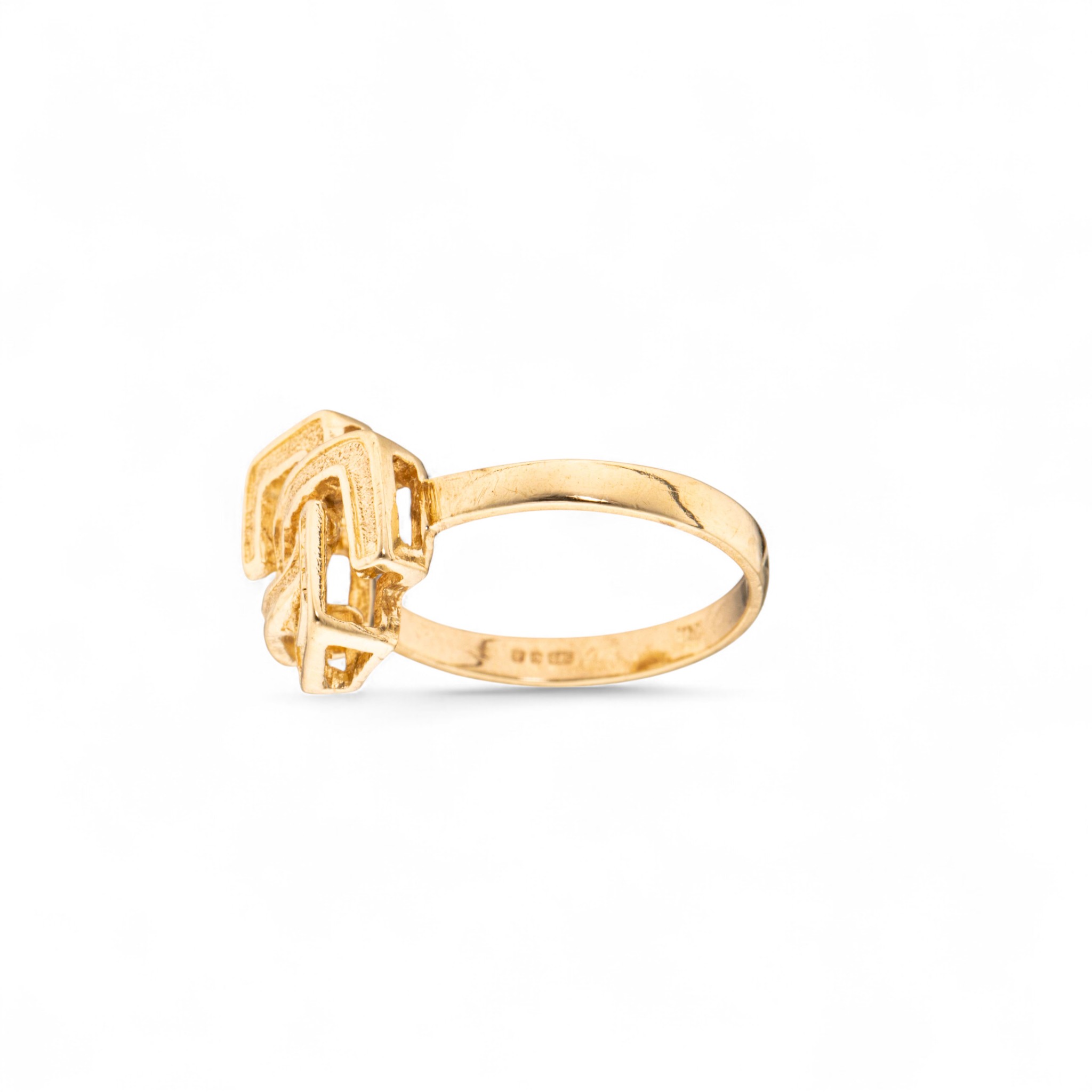 Ring i 9 karat gult gull. Gjennombrutt, geometrisk flate med glattbord. Ansvarsmerket «UGI» med importmerke fra London. Årsmerket «A» for år 1975.