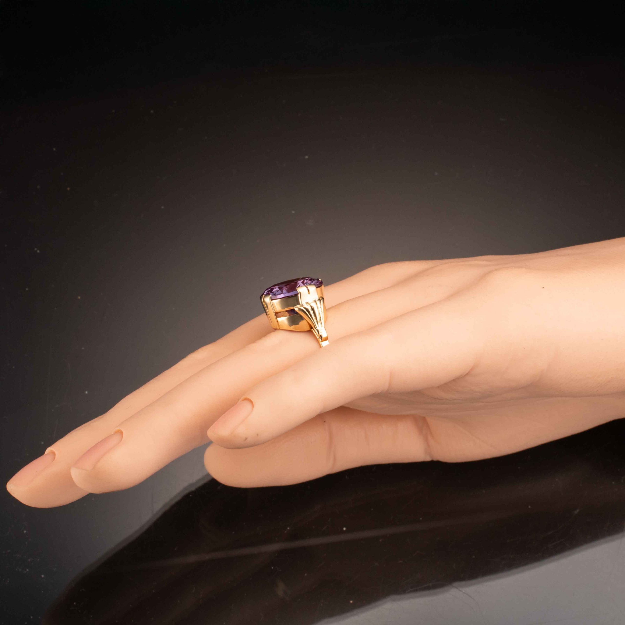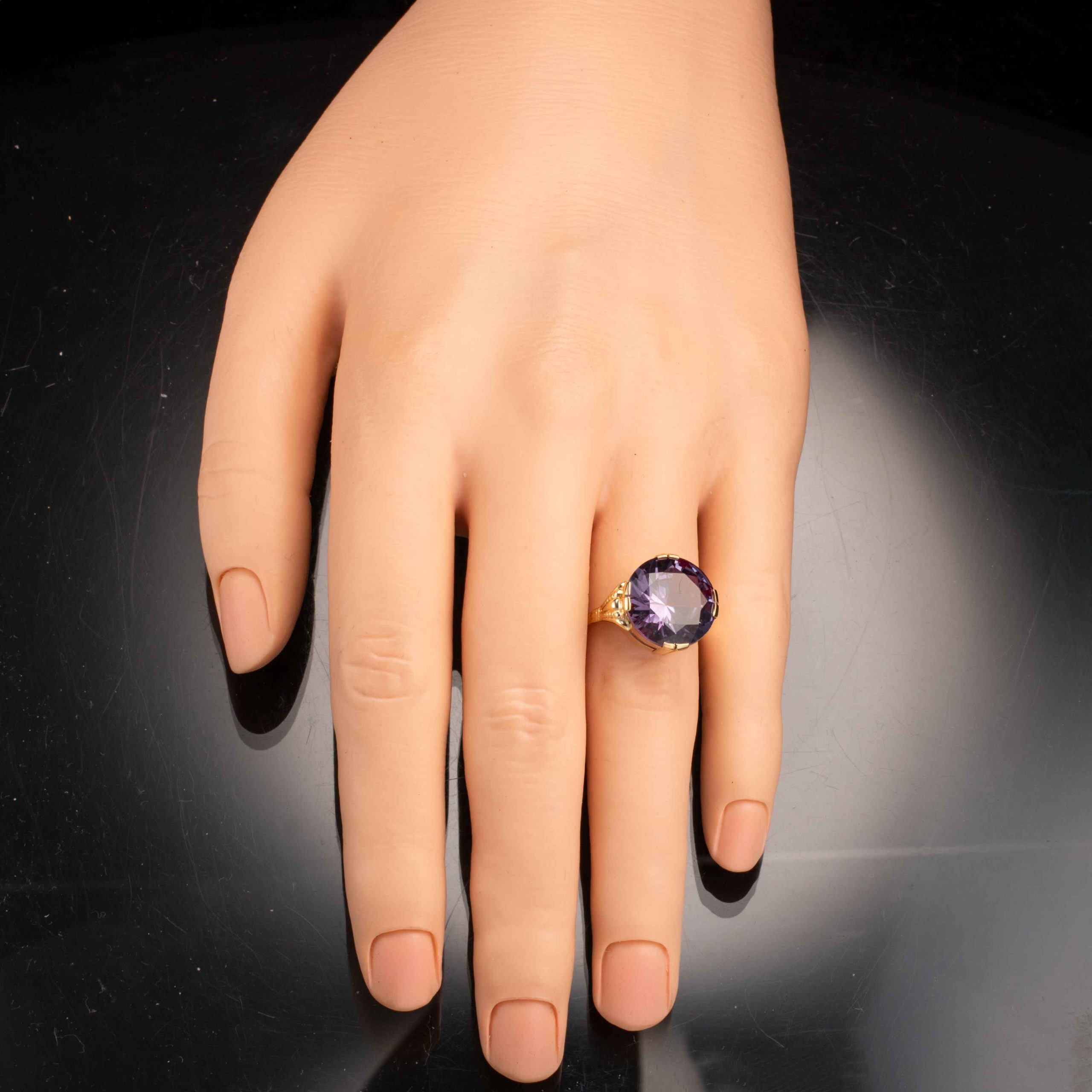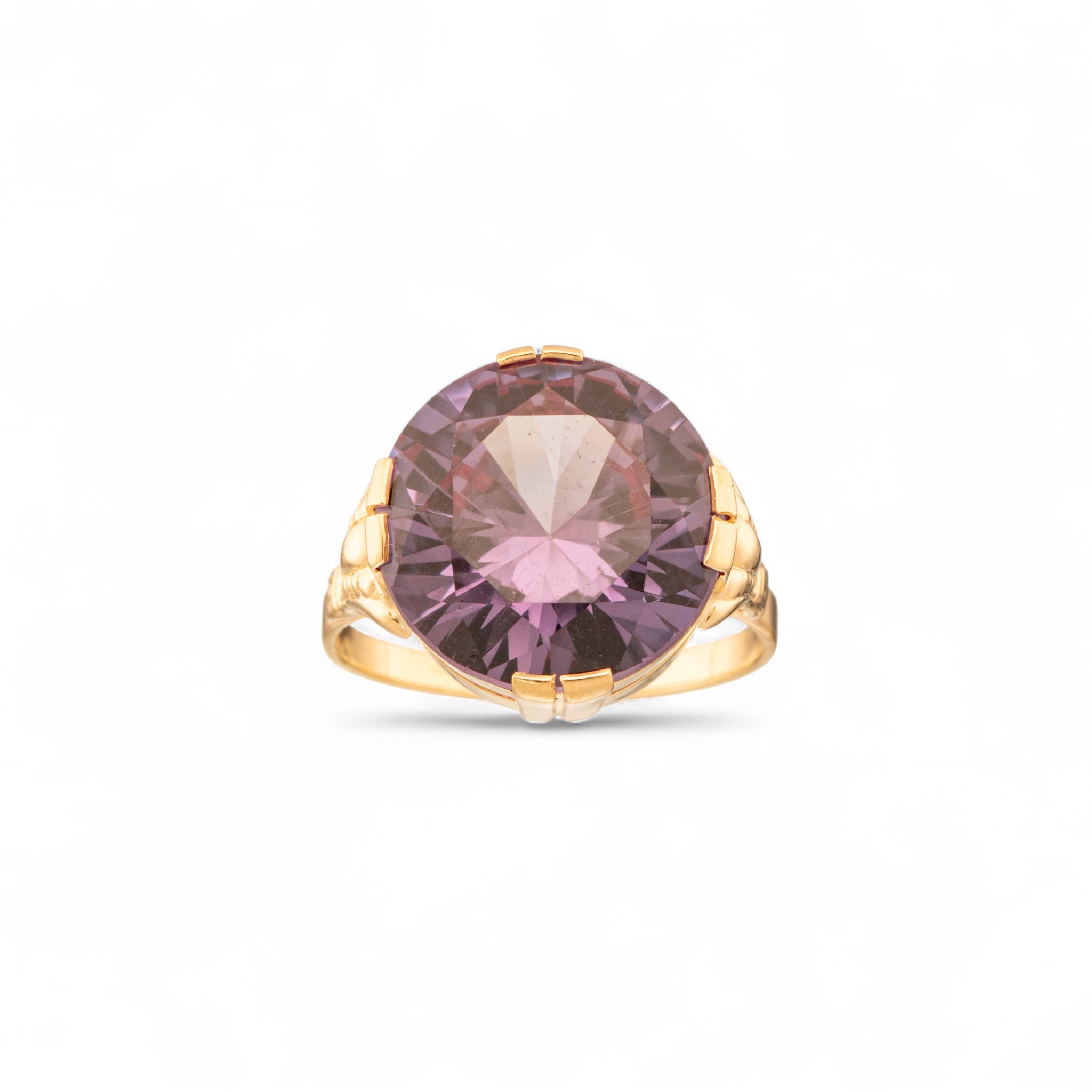 Ring i 14 karat gult gull. Fattet med en hard fargesten (lab. fremstilt, lilla safir). Ringskinnen er ansvarsmerket for Gullsmed Oscar A Sundal. Oslo. 1900-tallets andre halvdel.