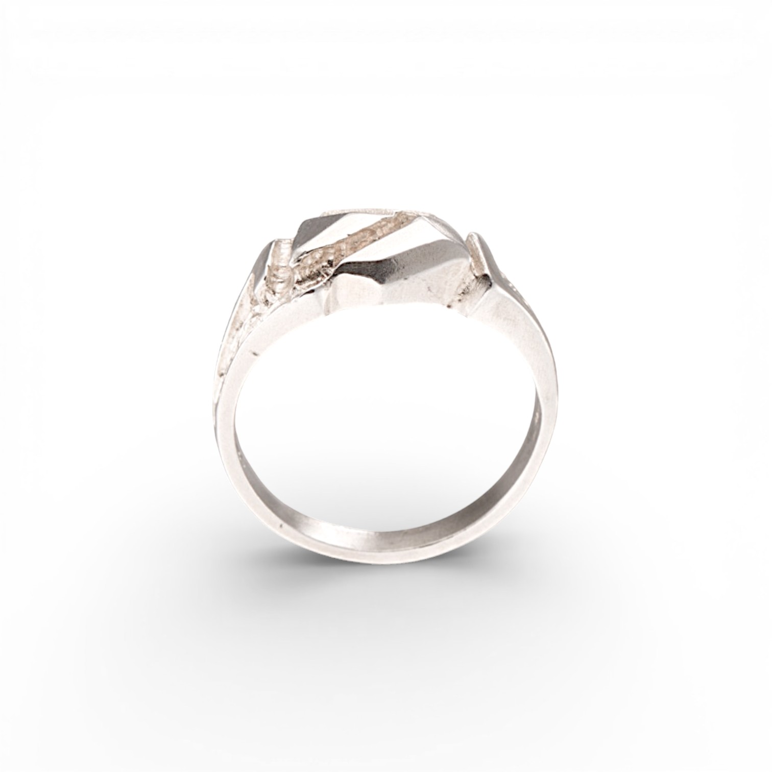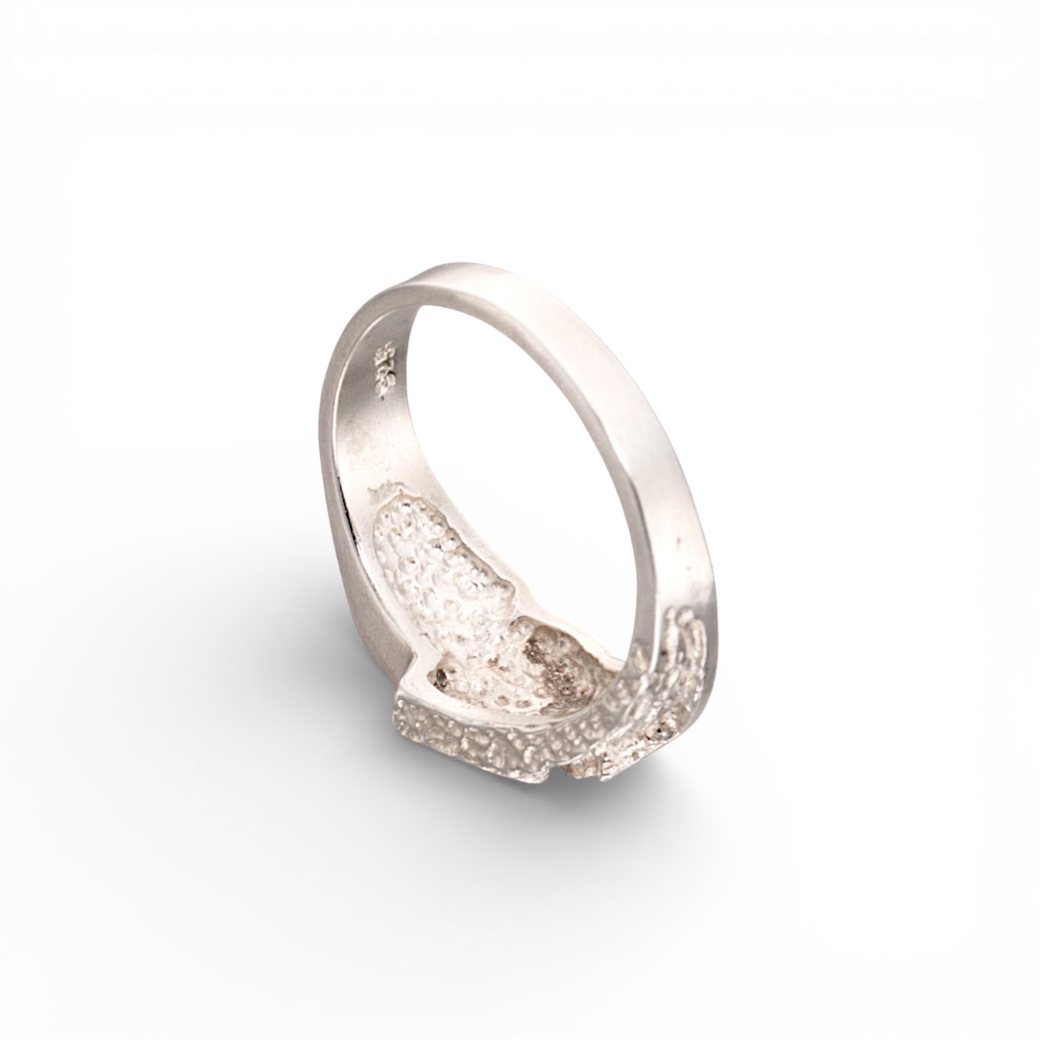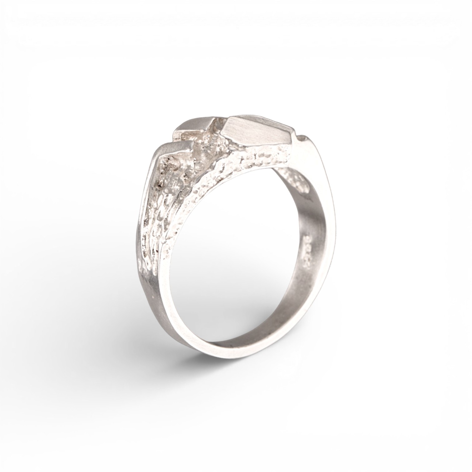 Ring i sterling sølv. Mattpolert nugget-mønster. Ansvarsmerket «MEMA» for «Norsk MEMA A/S» («Mema Guld & Silver AB»). Norge / Sverige. Sent 1900-tallet.