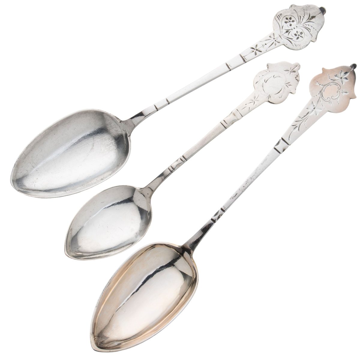 Samling tre skjeer i sølv med gravert og siselert dekor i front. Den minste skjeen med monogram bak skaft. Av sølvsmedene M. Soma, S. Mauritzen og N. Klemetsen. Sent 1800-tallet til tidlig 1900-tallet.