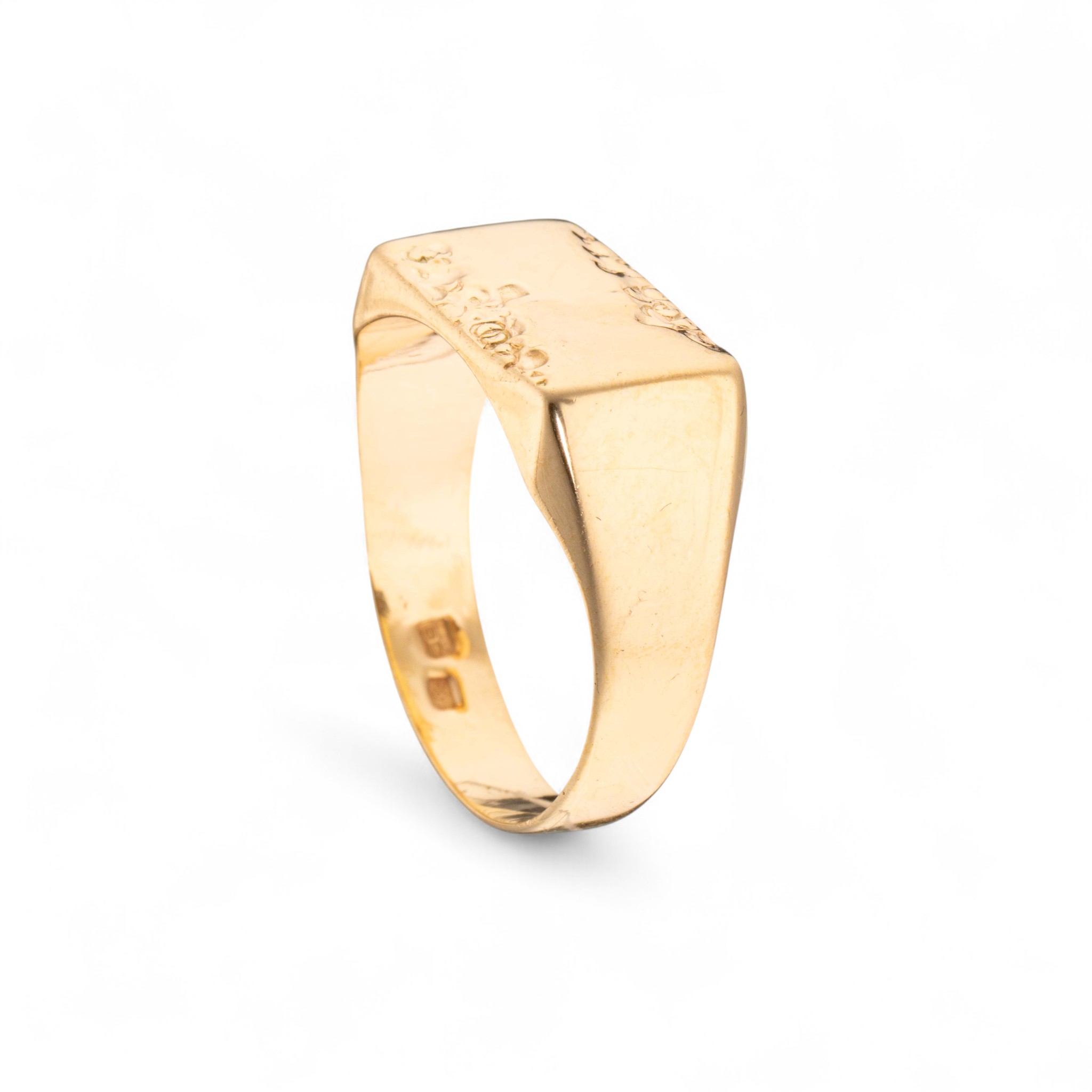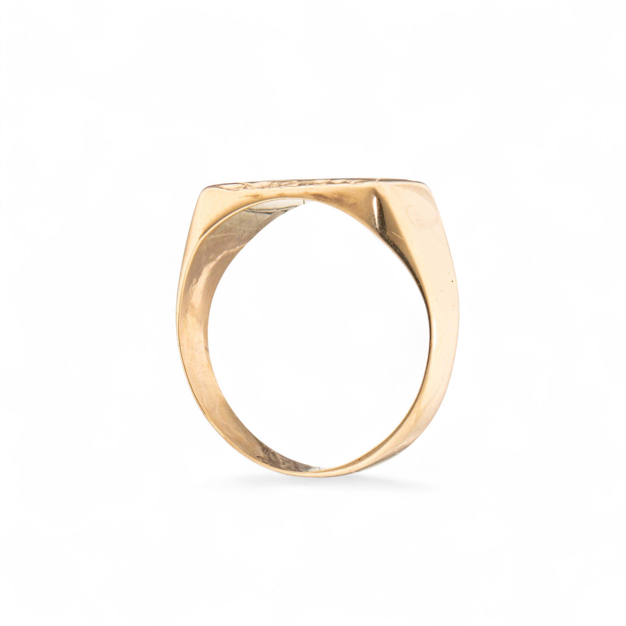 Ring i 14 karat gult gull. Nedsenket mønster på signet flate. Ansvarsmerket «EC» for E. Christophersen. Sandnes. 1900-tallets andre halvdel.