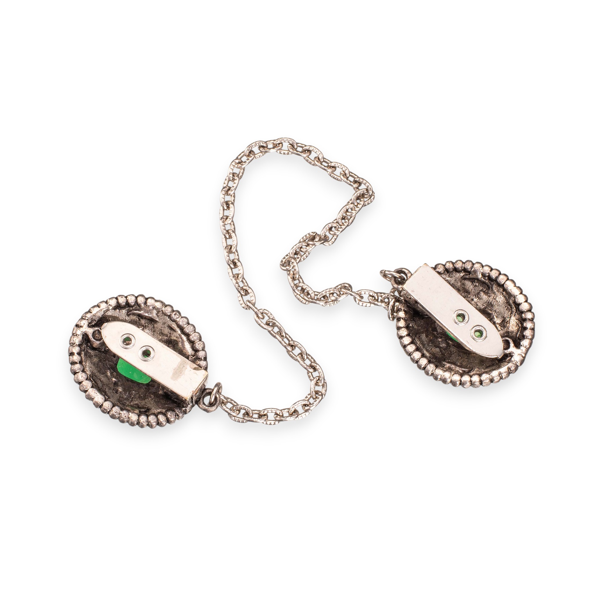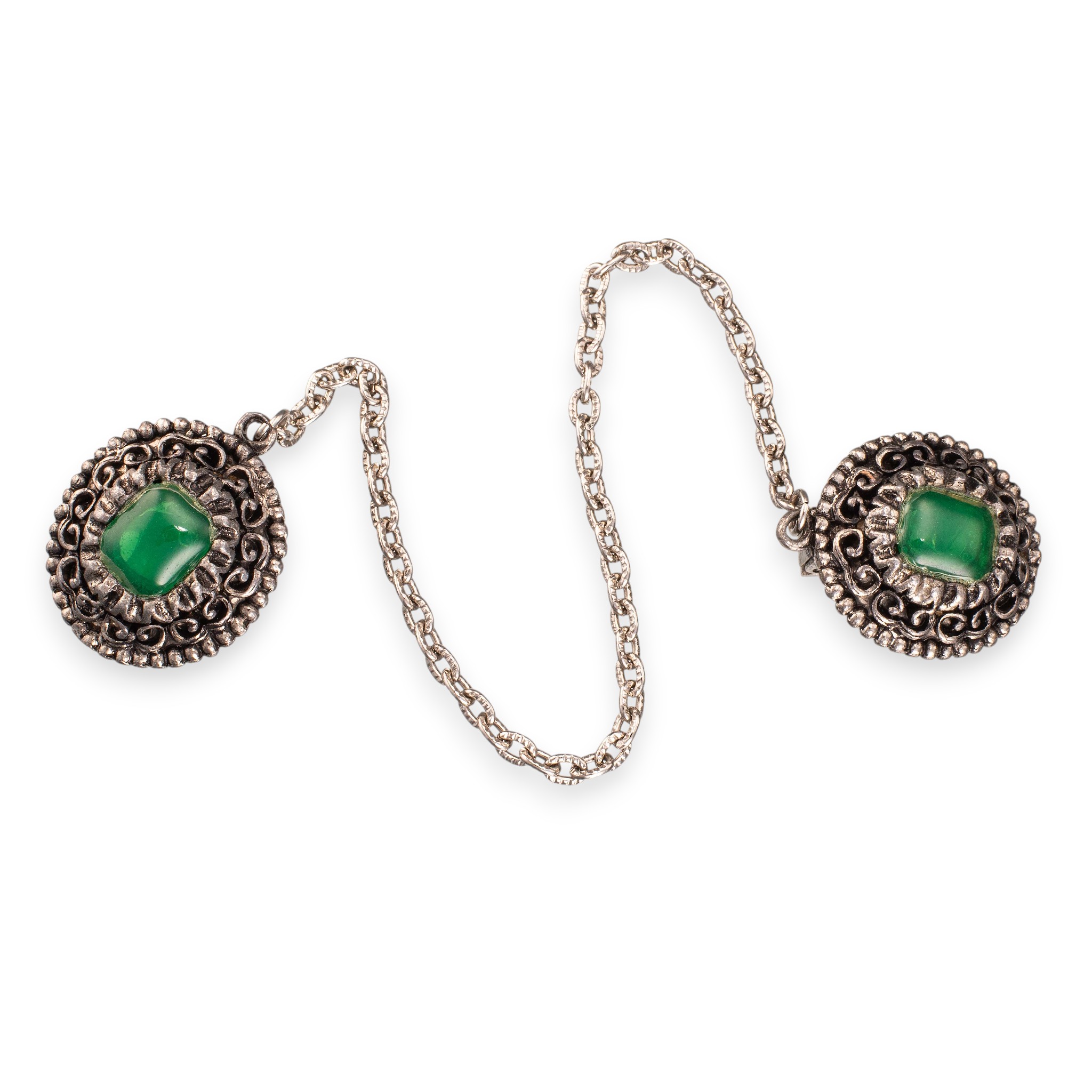 Bijouteri: Sjalfeste eller brosjer m. kjede. Klipsfeste. Uedelt metall fattet med syntetisk smykkesten. 1900-tallets andre halvdel.