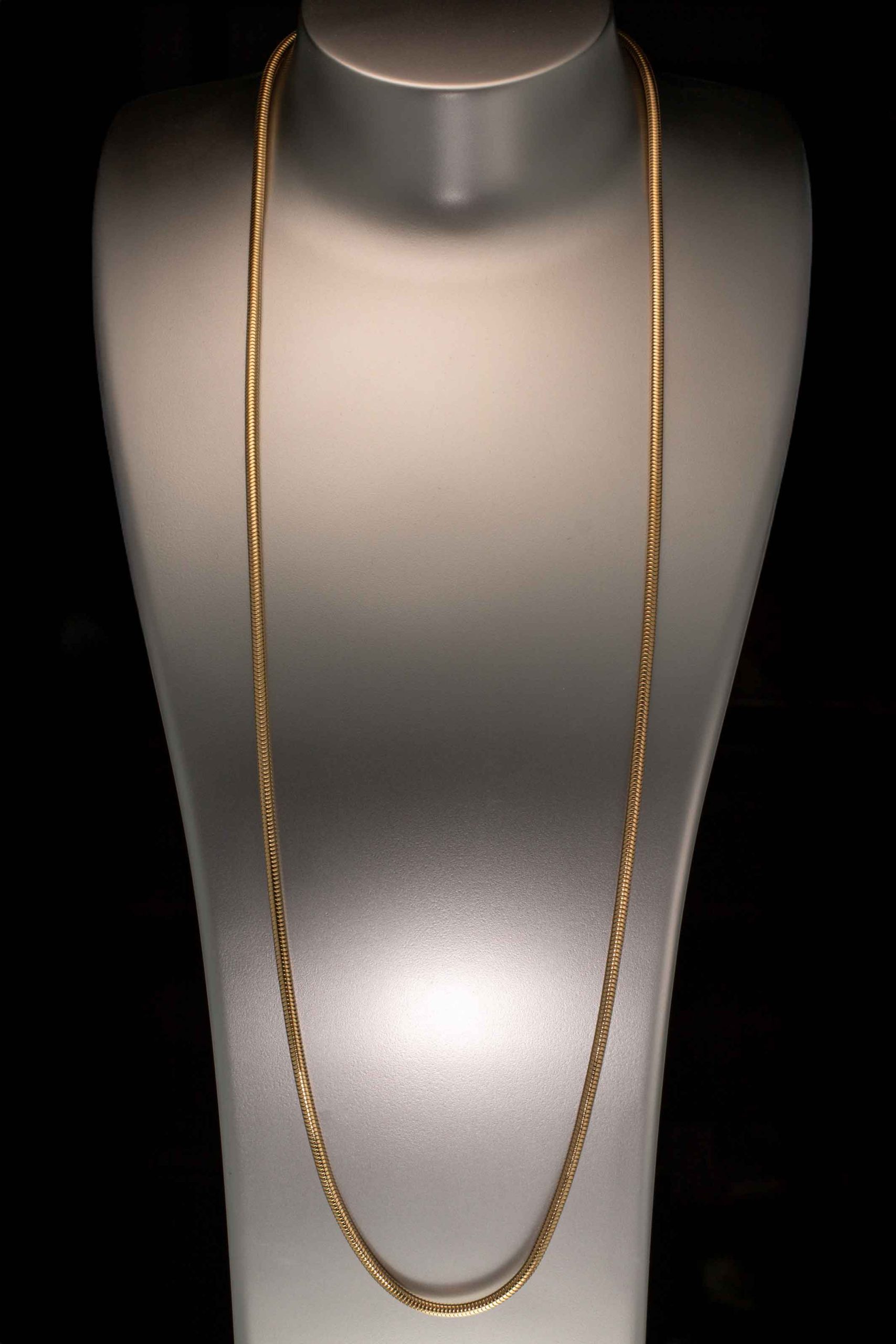 Langt slange halskjede i 10/000 gullfylt legering (en type gullbelegg / gulldoublè). Hummerklolås. Ansvarsmerket «SL». 1900-tallets andre halvdel.