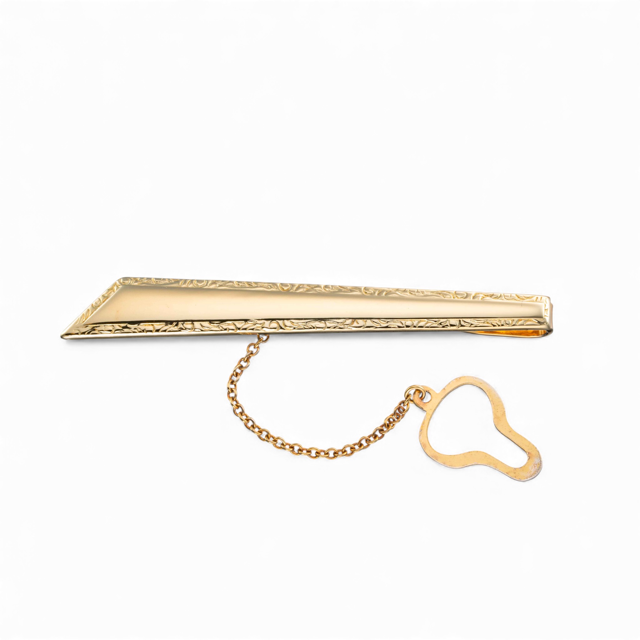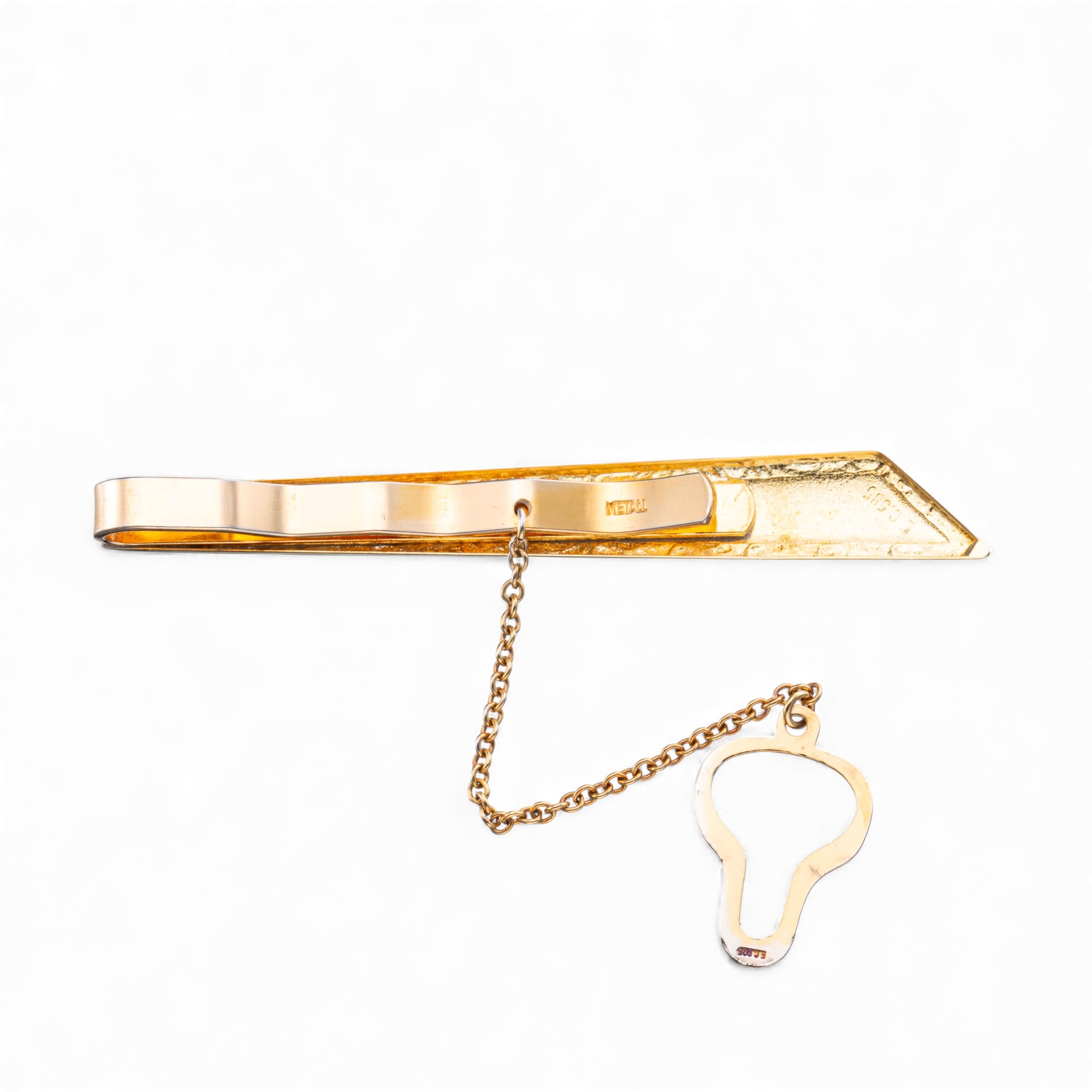 Slipsnål i 14 karat gult gull (bakstykke med kjede er ikke i gull). Glatt med mønstret bord. Ansvarsmerket «E.C» for E. Christophersen. Sandnes. 1900-tallets andre halvdel.