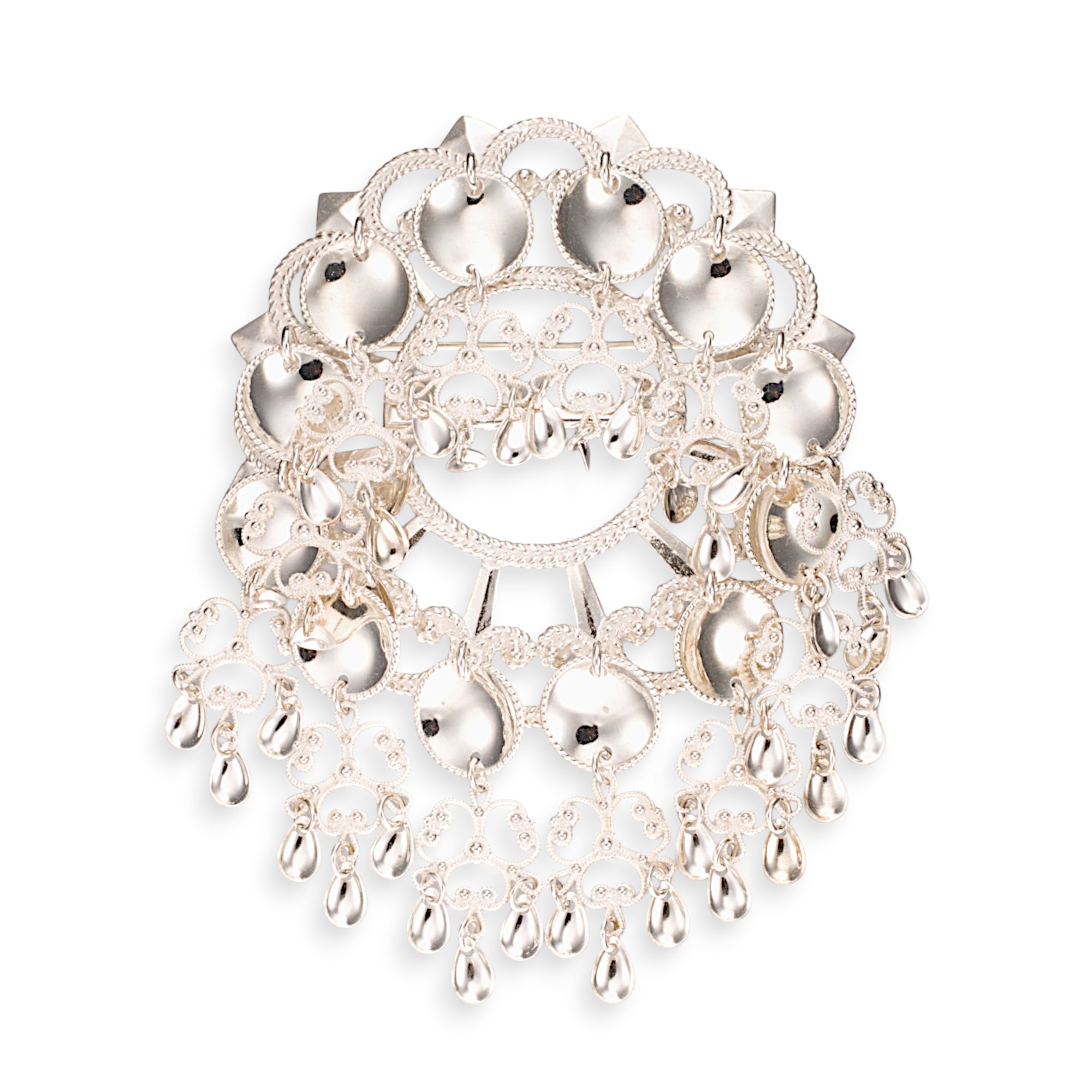 Stor bunadssølje i sølv. Utsmykket med trådkantlauv, drypplauv, kruser og filigran. Ansvarsmerket «JR» for Jakob Rongve / Vossasylv. 1900-tallets andre halvdel.
