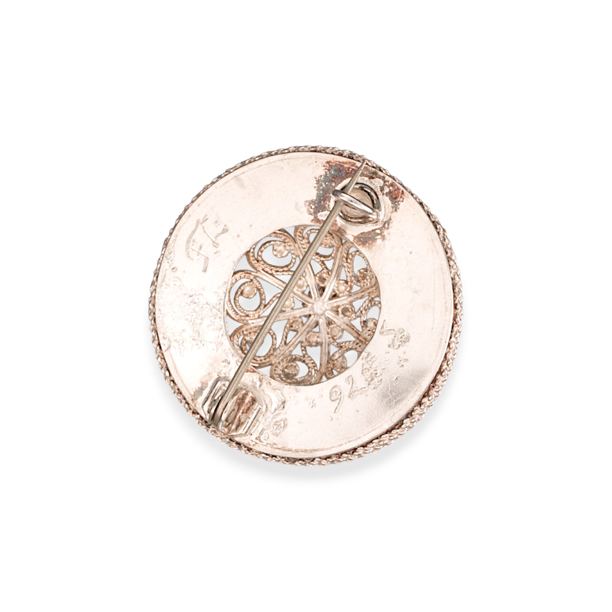 Liten sølje til bunad med en opphøyd, gjennombrutt filigranrose. Utført i sterling sølv. Signert av uidentifisert sølvsmed «F.L.» i løkke. Norge. 1900-tallets andre halvdel.