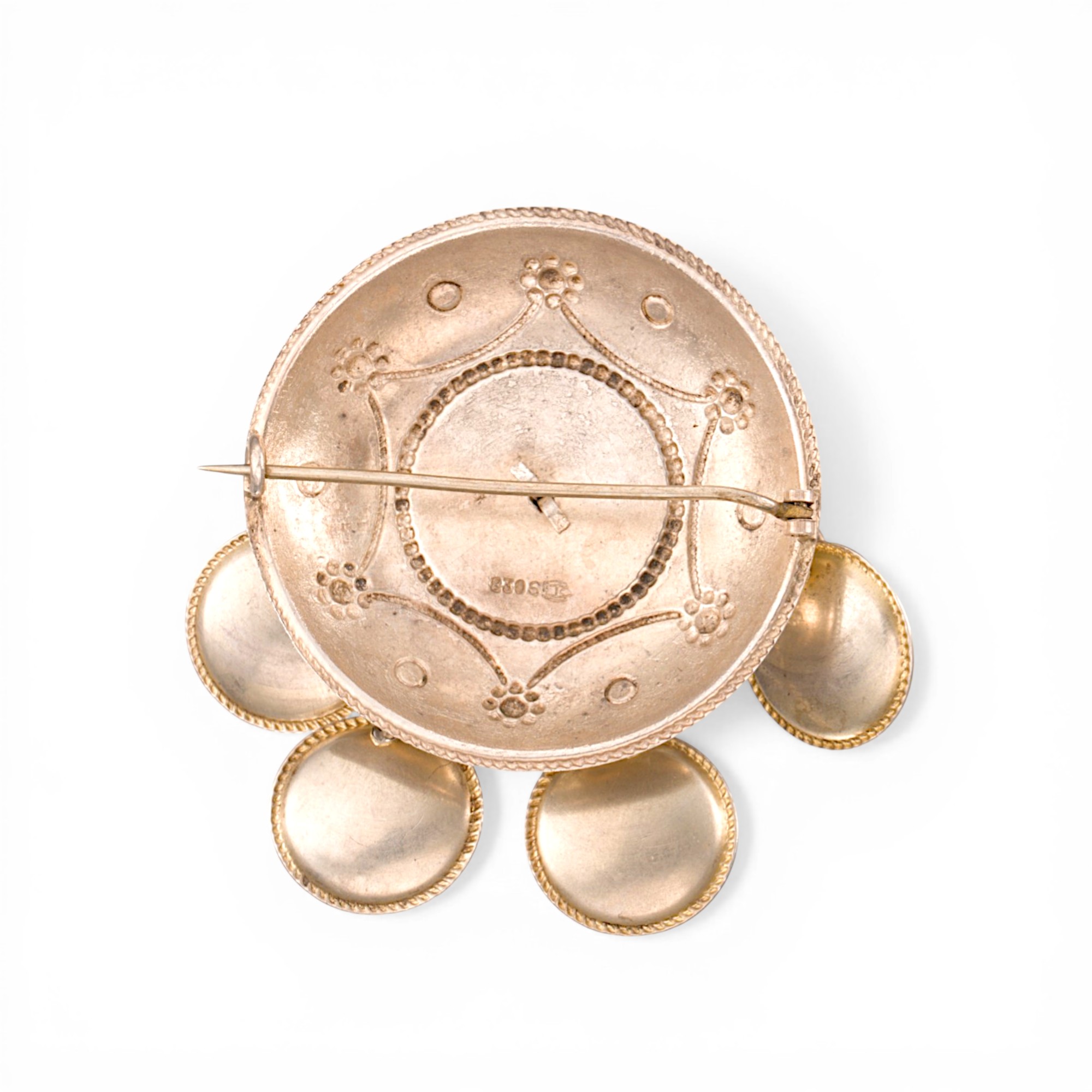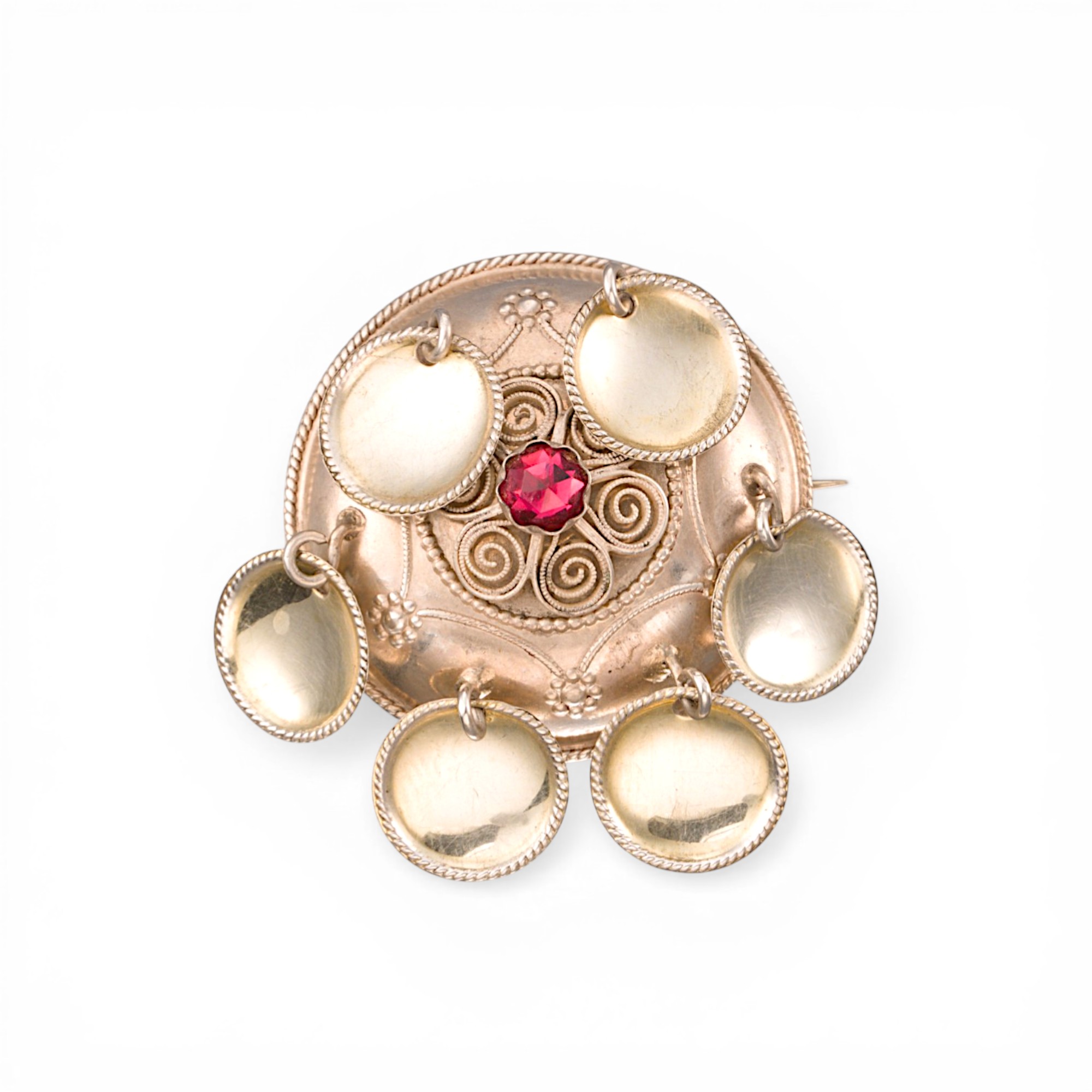 Sølje i sølv. Opphøyet filigranrose fattet med rød glassten. Lauv med trådkant. Ansvarsmerket for Th. Olsens. Eftf. Bergen. 19000-tallets første halvdel