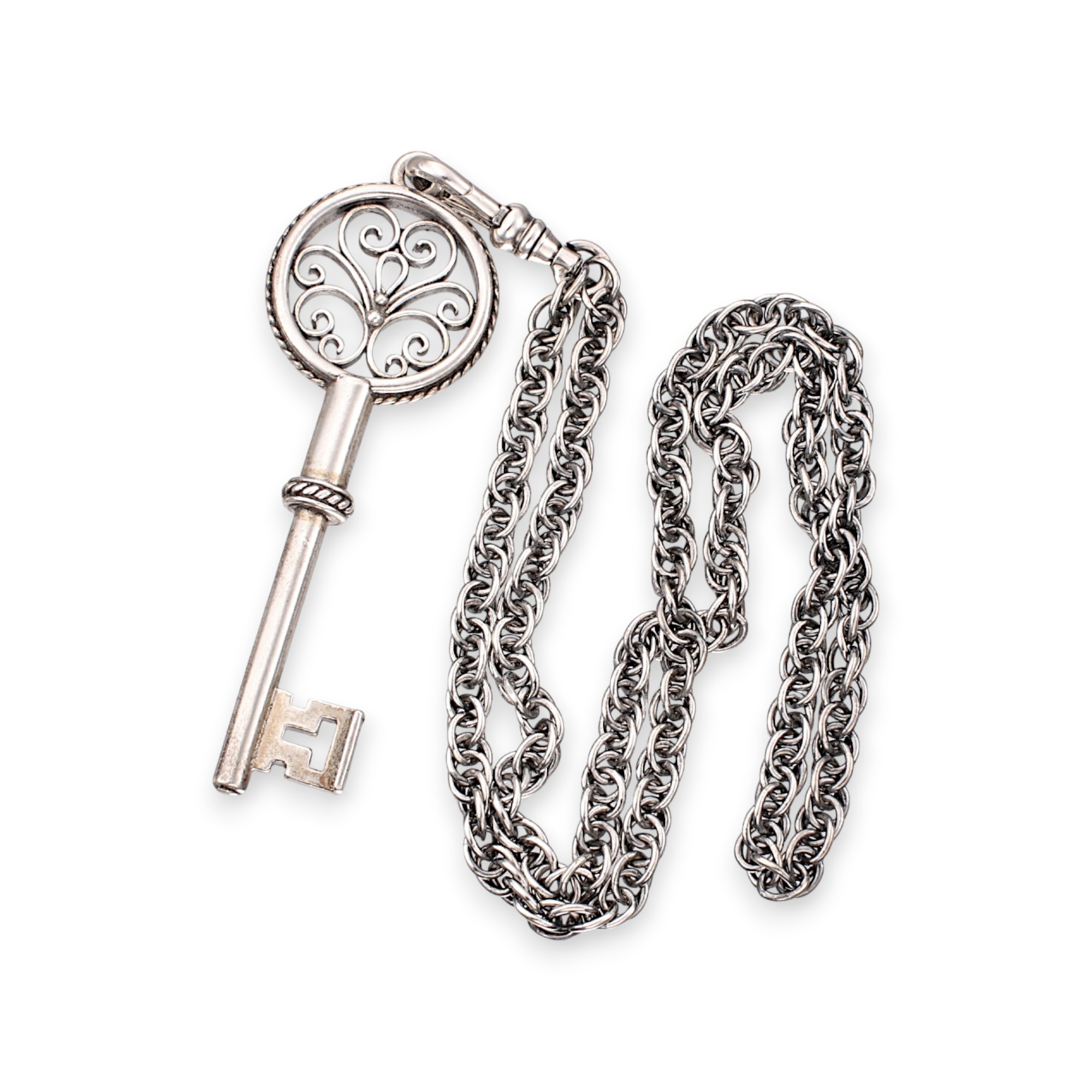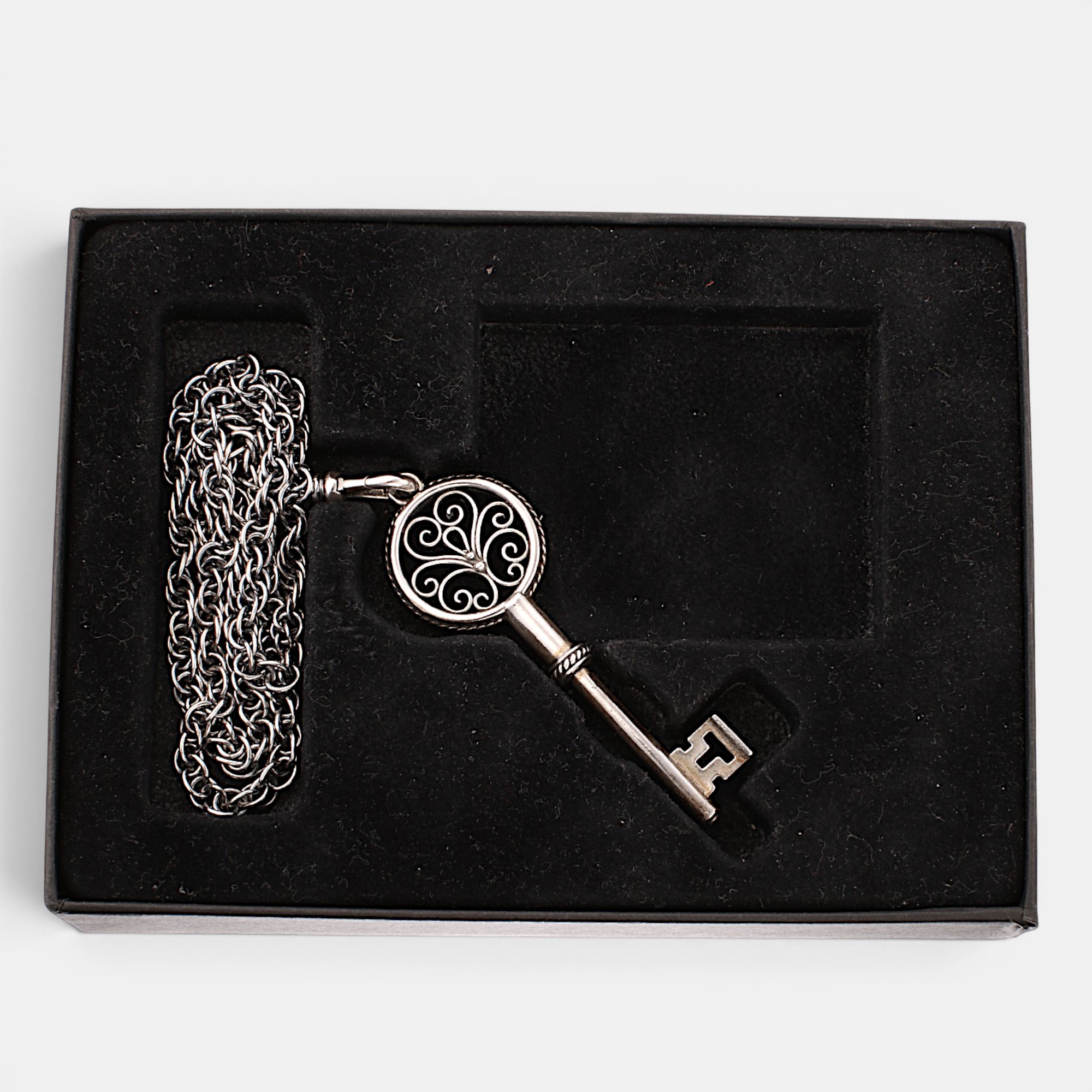 Stabbursnøkkel i sølv. Medfølger også et nøkkelkjede i sterling sølv. Sylvsmidja. Sent 1900- til tidl. 2000-tallet.